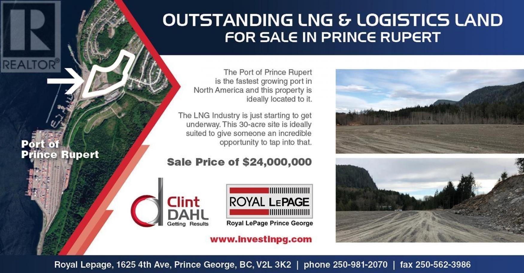 The best property available in Prince Rupert. Over 30 acres of relatively flat ground with Ocean view. Ideal site for residential, multi-family and industrial development. The Port of Prince Rupert continues to grow with significant developments ahead. Land is extremely hard to find in Prince Rupert and this property is ideally located. (id:6769)