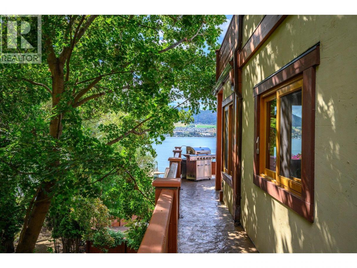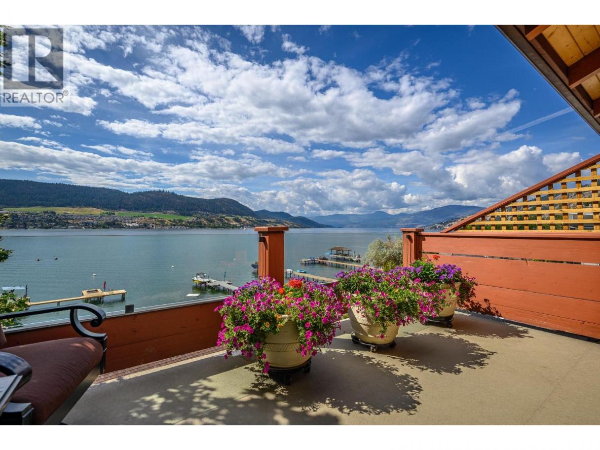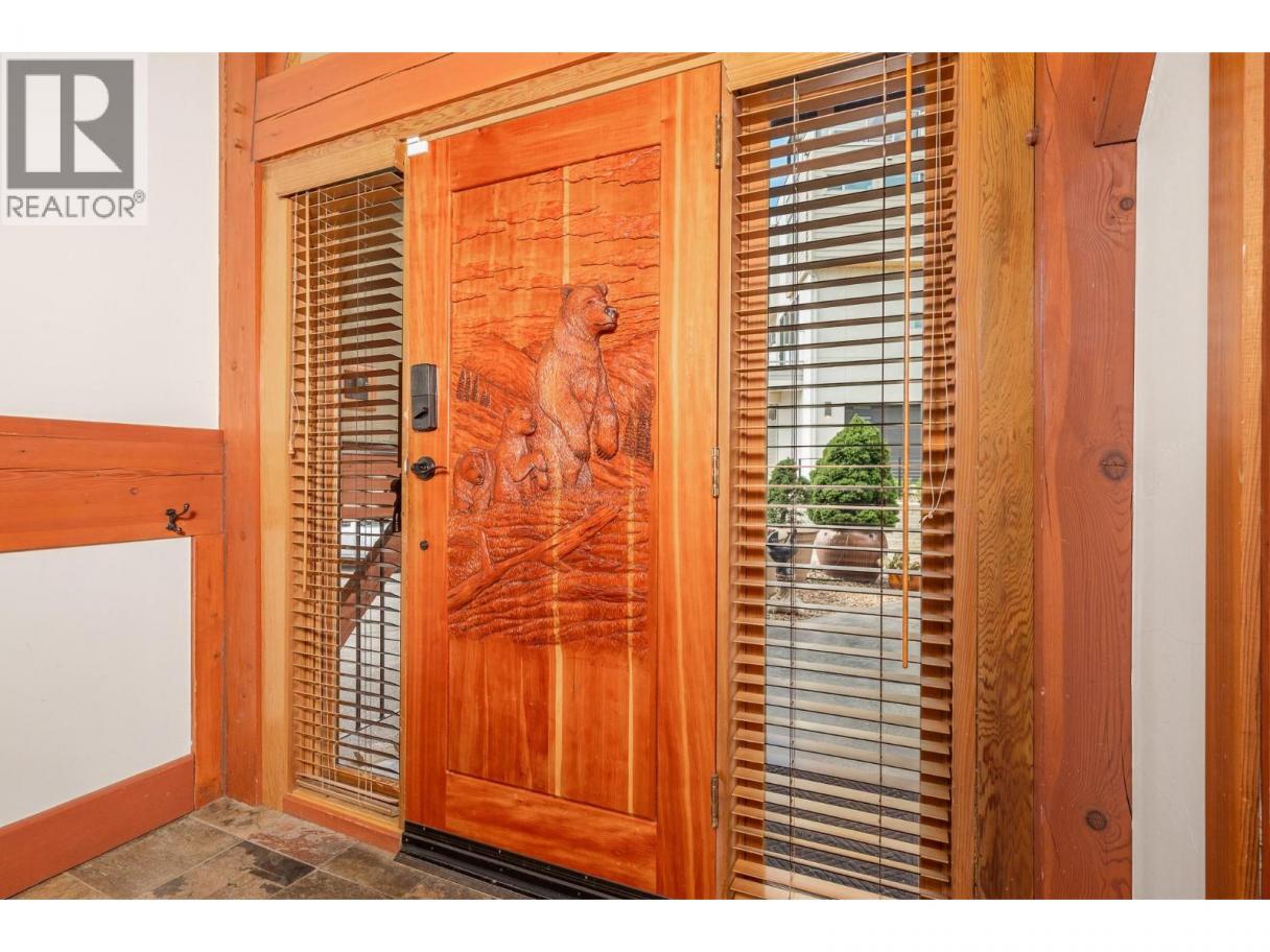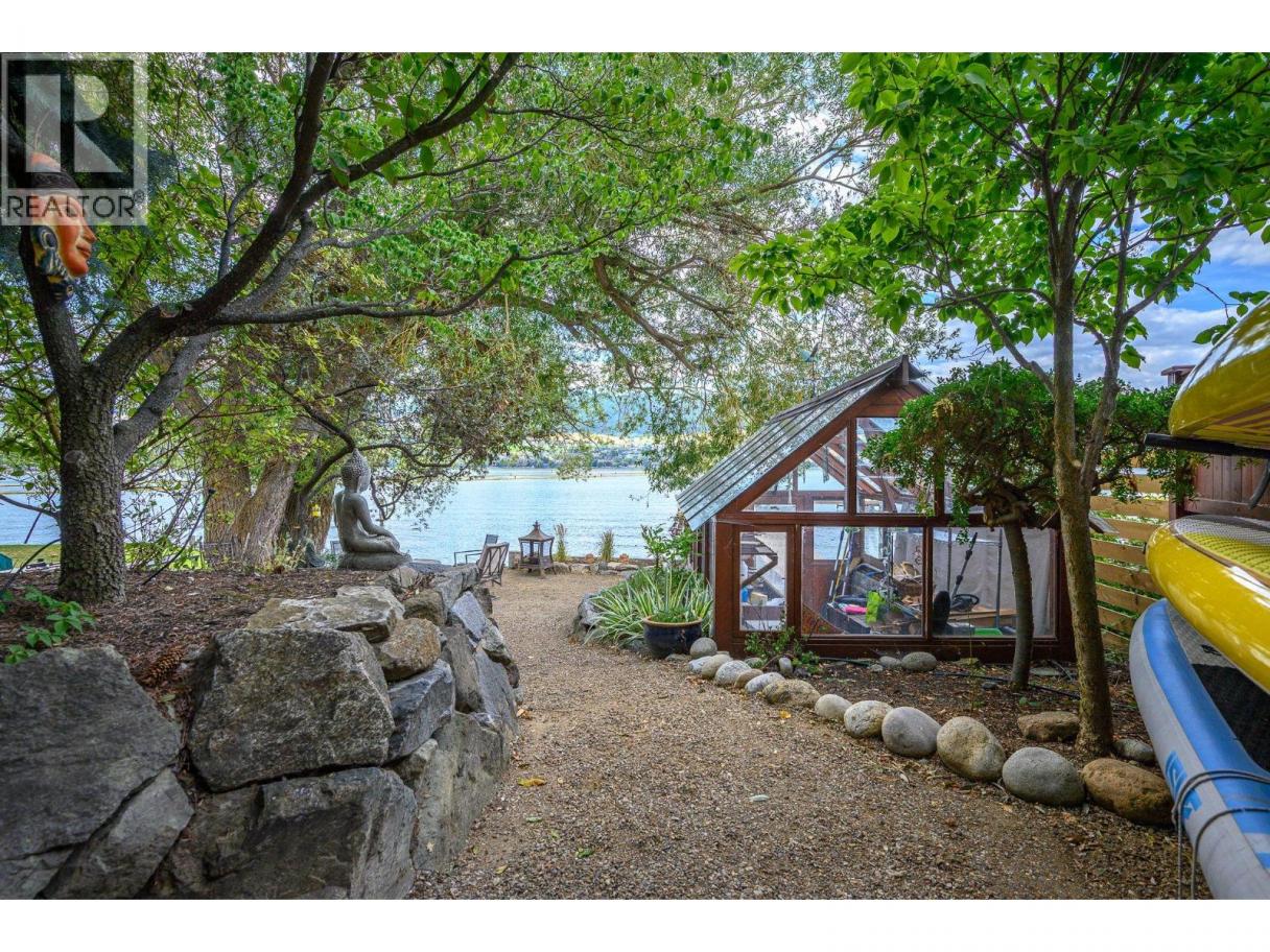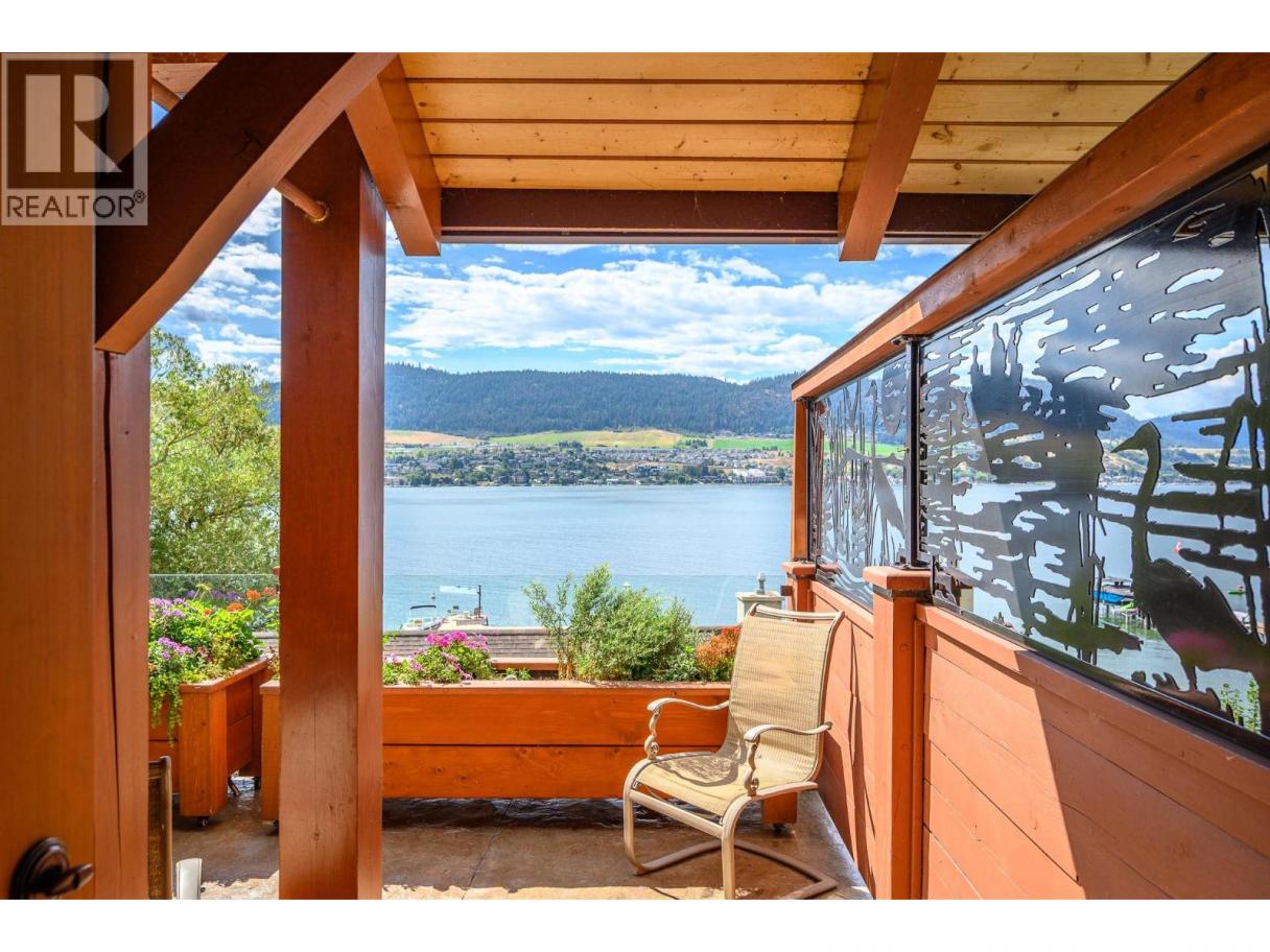 Experience Okanagan lakeside living in this exquisite custom timber frame chalet with European-inspired craftsmanship located on bare land strata. Striking exposed beams, intricate metal art accents, and 2 carved wood doors create a warm, timeless atmosphere. A private walkway leads to a newly constructed large, shared dock with boat moorage, perfect for summer adventures, water sports, or sunset cruises with friends and family. Inside, hardwood and tile floors flow throughout for durability and style. The chef’s kitchen is a showpiece with stainless steel counters, a granite peninsula, and a powered walk-in pantry that keeps appliances neatly tucked away. Laundry is conveniently located off the kitchen with extra storage. The top-floor primary suite is a true sanctuary with panoramic lake views, private deck, walk-in closet, spa-inspired ensuite, and enough room for a generous sitting area. The second bedroom below offers spacious accommodations and its own private ensuite ideal for family or guests. The walk-out lower-level features a private entry; excellent potential for a self-contained studio suite or an additional bedroom. Outside, ample parking for up to 6 vehicles via garage, two carports, and driveway parking. Three storage sheds, and abundant space for lake toys makes lakeside living effortless. 10 mins to city center and steps to Kin Beach, this is a rare property combining artisan detail, exceptional design, and the true Okanagan lifestyle in a coveted location. (id:6769)