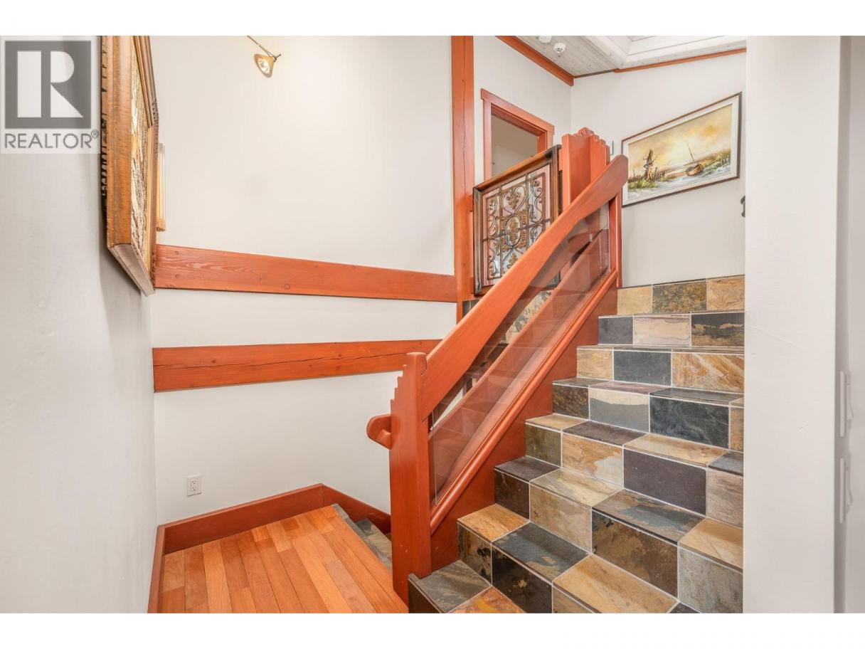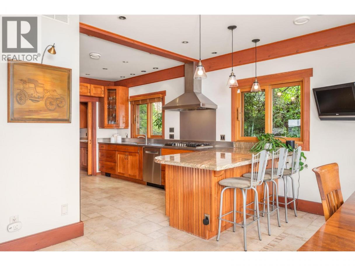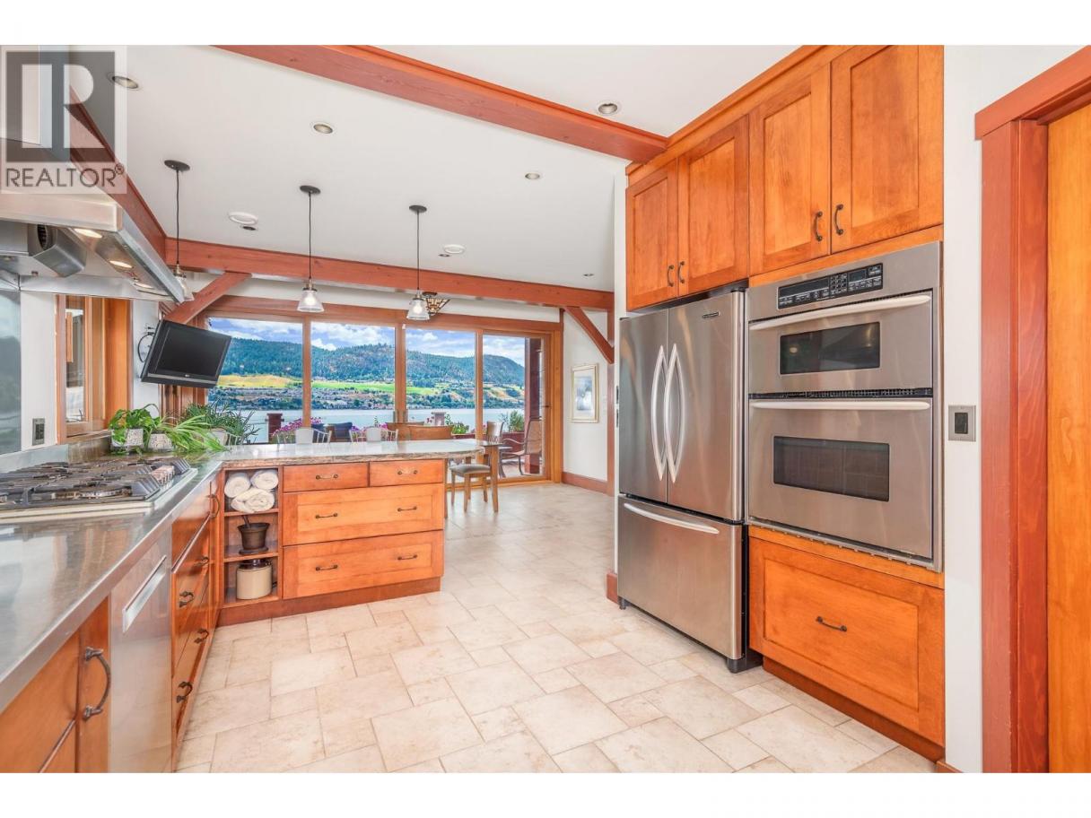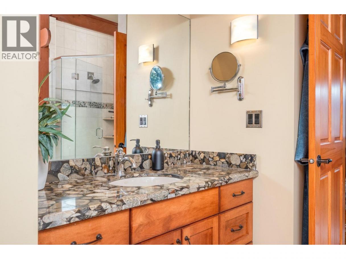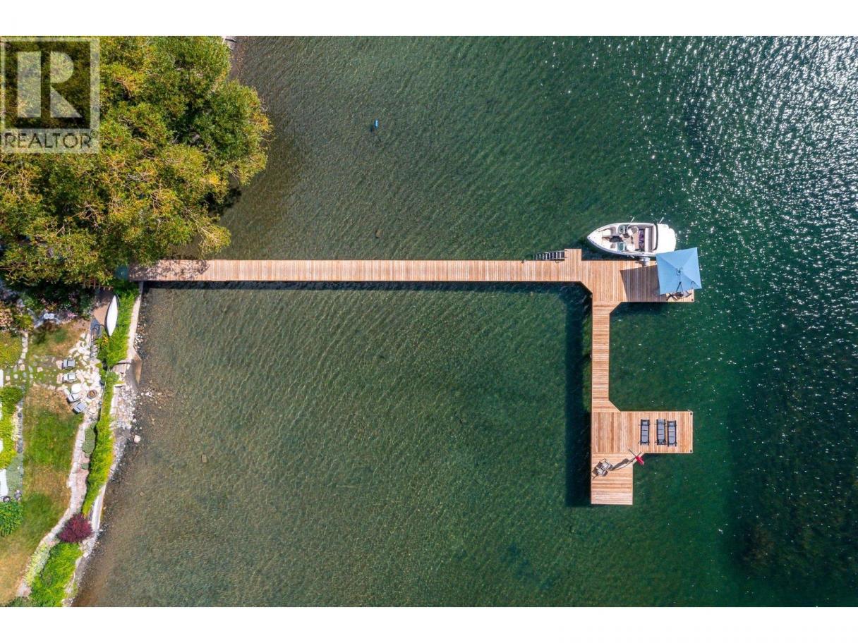 Experience Okanagan lakeside living in this exquisite custom timber frame chalet with European-inspired craftsmanship located on bare land strata. Striking exposed beams, intricate metal art accents, and 2 carved wood doors create a warm, timeless atmosphere. A private walkway leads to a newly constructed large, shared dock with boat moorage, perfect for summer adventures, water sports, or sunset cruises with friends and family. Inside, hardwood and tile floors flow throughout for durability and style. The chef’s kitchen is a showpiece with stainless steel counters, a granite peninsula, and a powered walk-in pantry that keeps appliances neatly tucked away. Laundry is conveniently located off the kitchen with extra storage. The top-floor primary suite is a true sanctuary with panoramic lake views, private deck, walk-in closet, spa-inspired ensuite, and enough room for a generous sitting area. The second bedroom below offers spacious accommodations and its own private ensuite ideal for family or guests. The walk-out lower-level features a private entry; excellent potential for a self-contained studio suite or an additional bedroom. Outside, ample parking for up to 6 vehicles via garage, two carports, and driveway parking. Three storage sheds, and abundant space for lake toys makes lakeside living effortless. 10 mins to city center and steps to Kin Beach, this is a rare property combining artisan detail, exceptional design, and the true Okanagan lifestyle in a coveted location. (id:6769)