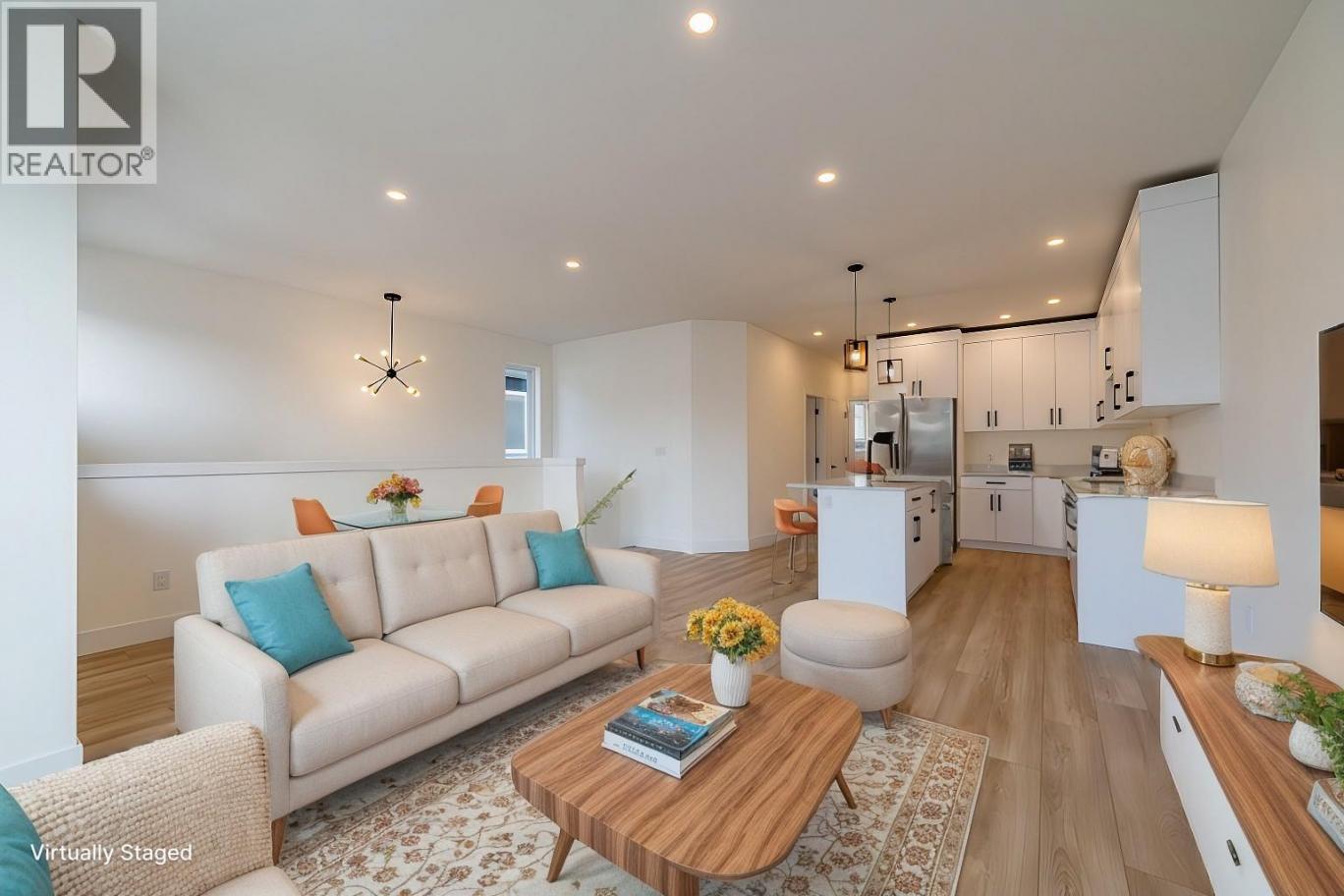 Welcome to this brand new basement entry home offering a bright, modern design with 2 bedrooms on the main floor and a finished daylight basement. The open concept main level is filled with natural light, showcasing a stylish kitchen with stone countertops, abundant cabinetry, and access to a front patio with hillside views. The spacious primary suite features a walk-in closet and a 4-piece ensuite, while a second bedroom and another 4-piece bathroom complete the main floor. The entryway is warm and inviting, with a mudroom that connects to the garage and includes laundry hookups. The lower level offers excellent flexibility with a large family room, third bedroom, and full 4-piece bathroom. A separate side entry and rough-ins for a wet bar provide great potential for a private suite, teen space, or extended family living. There’s also a private patio facing east to enjoy the morning sun, plus plenty of storage for your belongings. This home is finished with modern touches including stone counters, laminate flooring, and neutral décor. Located in a bare land strata of 20 duplex-style homes, fees are just $150/month and include water, sewer, garbage, and road maintenance. Steps away you’ll find the Rivers Trail along Aviation Way, river access, and a fenced dog park. Shopping, schools, and transit are minutes from your door. Quick possession available. (id:6769)