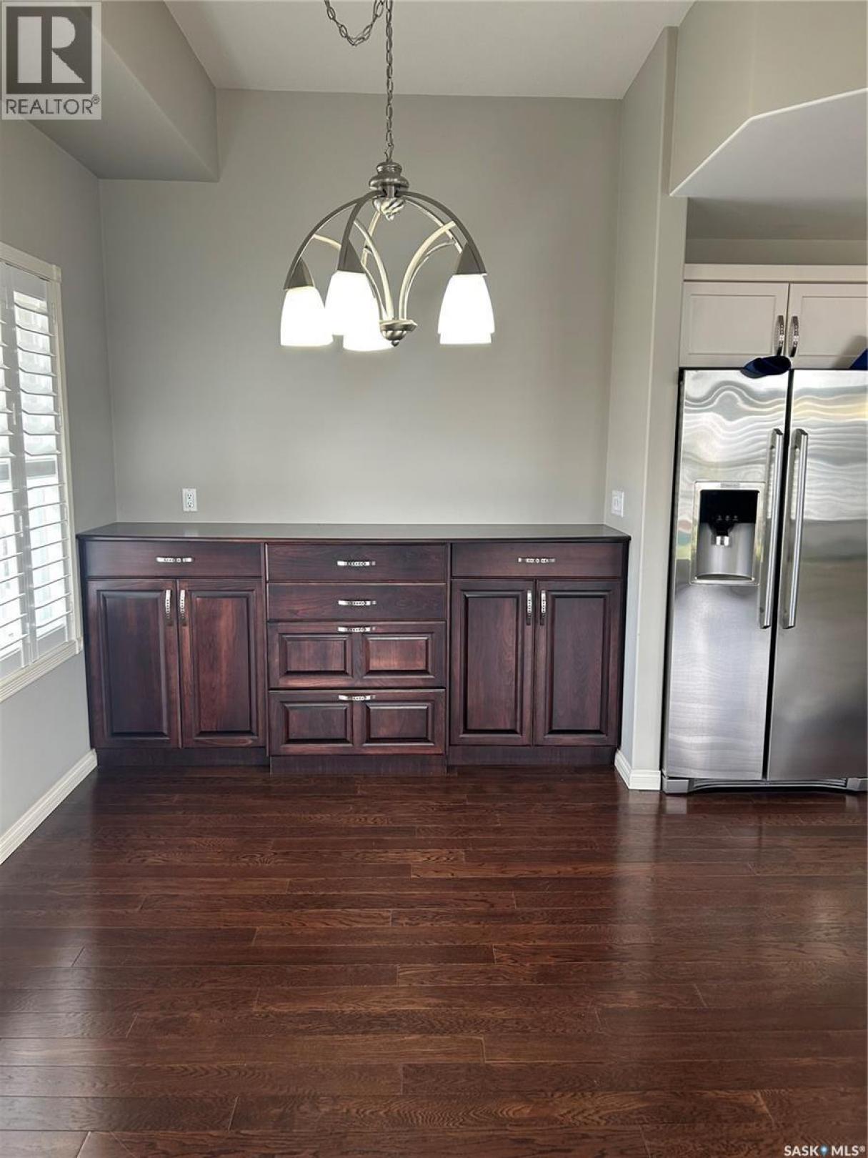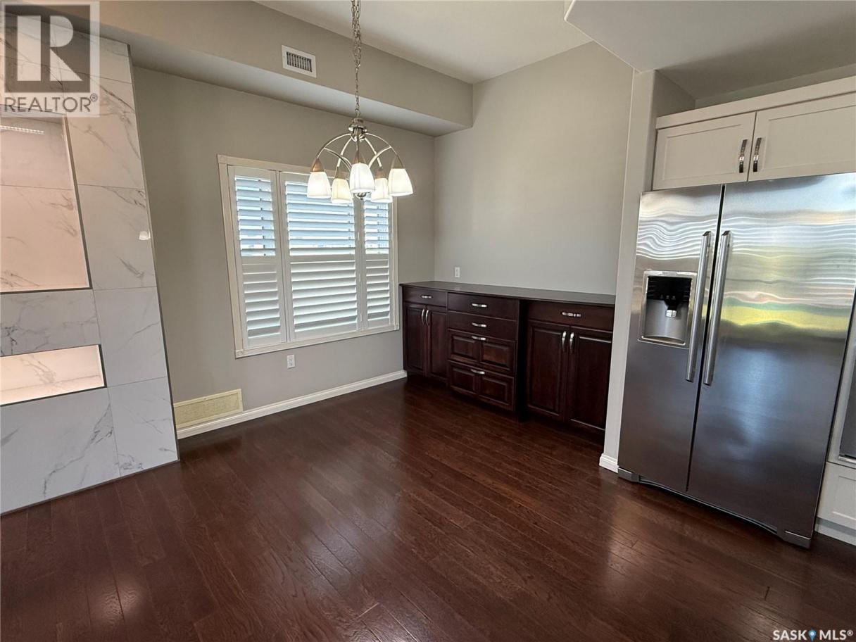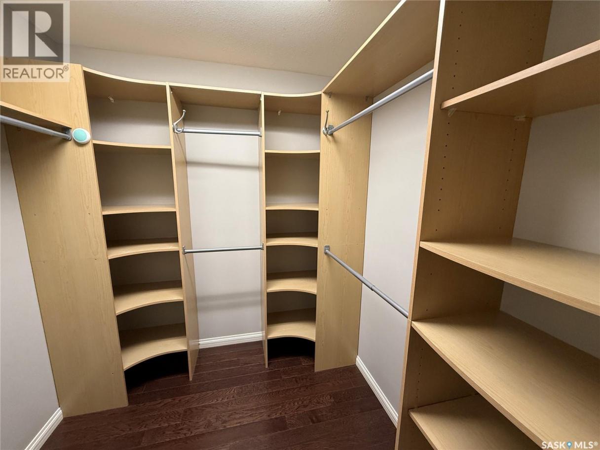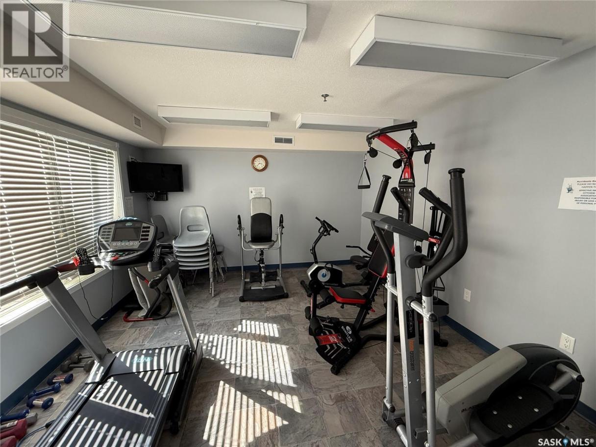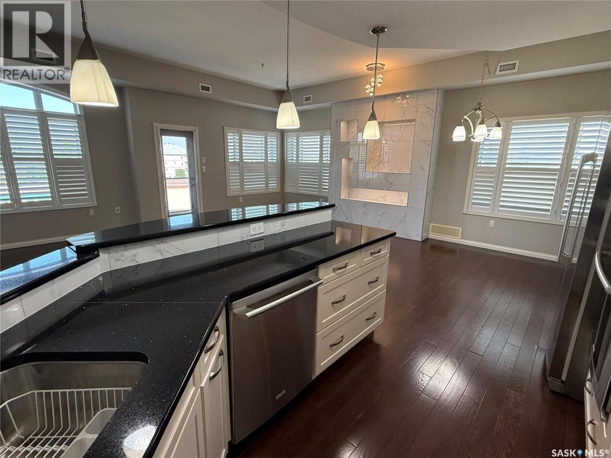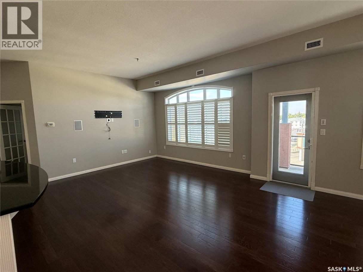 Executive 4th Floor Condo with Sweeping Views. Step into this beautiful condo where luxury and comfort meet. With soaring 11' ceilings and expansive windows, the home feels bright, airy, and welcoming. The two-sided balcony is the perfect spot to sip your morning coffee or enjoy an evening sunset while taking in the panoramic views. The heart of the home is the white kitchen, featuring upgraded solid countertops, fresh backsplash, and plenty of storage with an abundance of drawers. Just off the kitchen, a beverage centre makes entertaining a breeze, while a custom lit display wall adds elegance and personality to the living space. Thoughtful touches are found throughout—custom wood shutters, built-in storage, and even a Murphy bed for when friends or family come to stay. The primary suite is a private retreat with a walk-in closet and a spa-like ensuite, complete with double sinks, and jacuzzi tub. A second bedroom and full bathroom with a walk-in shower ensure comfort for guests. Practical and stylish details add ease to daily living: In-suite laundry with built-in shelving, mini fridge, and stand-up freezer included. Warm hardwood and tile flooring throughout and a private furnace and central A/C tucked away off the balcony for year-round comfort. Another notable feature of this building is the wide hallways and ample visitor parking. Enjoy access to a welcoming common room, fitness area, and a handy wash bay in the heated underground parking garage, where your car stays comfy inside all year long. The building also offers a recycling program and a sense of community. More than just a place to live, City View Estates is where you will find the perfect balance of style, comfort, and convenience. (id:6769)