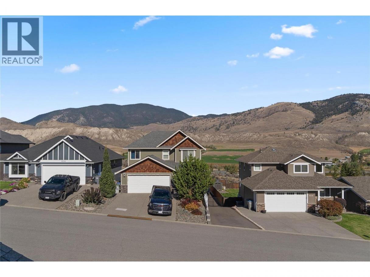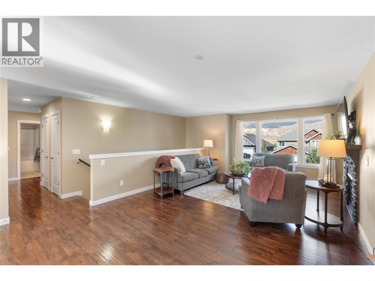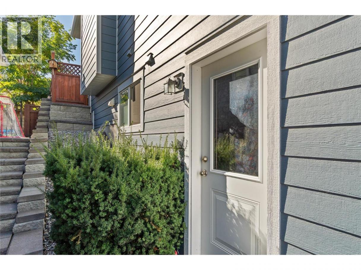 Beautiful family home with great street appeal, xeriscaped front yard & generous 3 car wide driveway for your RV or boat with easy care manual UG sprinklers for the front plantings. Welcoming foyer with front bedroom/office and access to the oversized, heated double garage with tandem bay for a 3rd vehicle or workshop. Upper level features engineered hardwood floors, open concept living with island kitchen with appliances included & lots of cabinets for storage. Spacious living room has gas fireplace & stunning river and mountain vineyard views. Dining area with built-in buffet opens to a private fenced yard with negotiable gazebo — perfect for kids & pets. Three bedrooms up including a spacious primary with 4pc ensuite, double sinks & large shower. Entry level offers a bright bachelor in-law suite with Murphy bed, private entrance & full kitchen with all appliances and full bath — ideal mortgage helper or guest space. New hot water tank, in-house sprinkler system, well maintained & serviced furnace & A/C. Backs onto greenspace with trails & close to neighborhood park — the perfect home for a growing family! (id:6769)