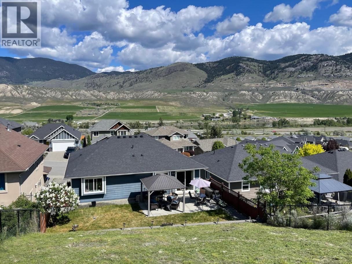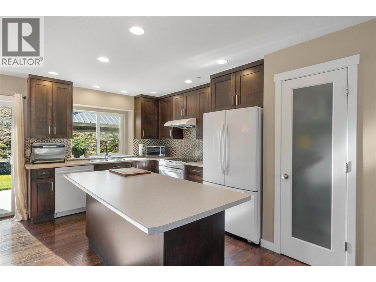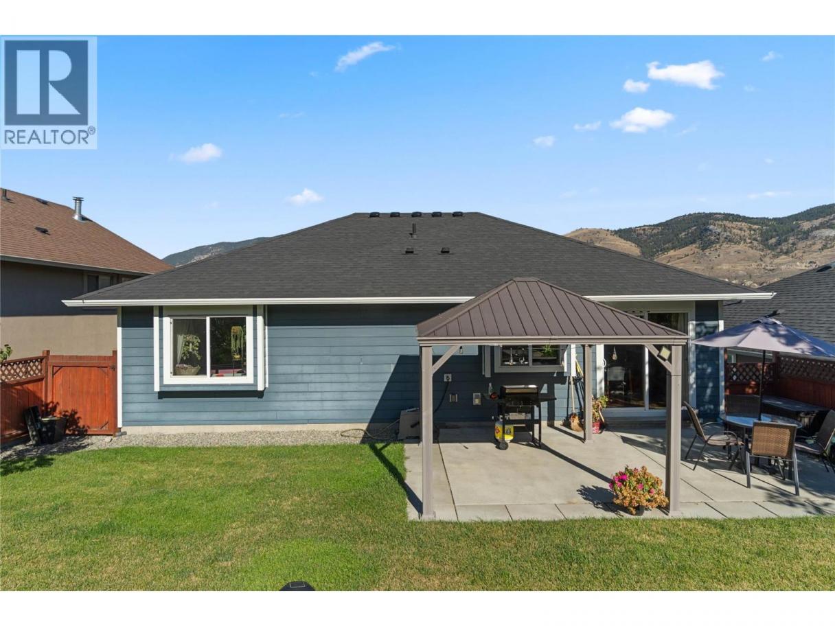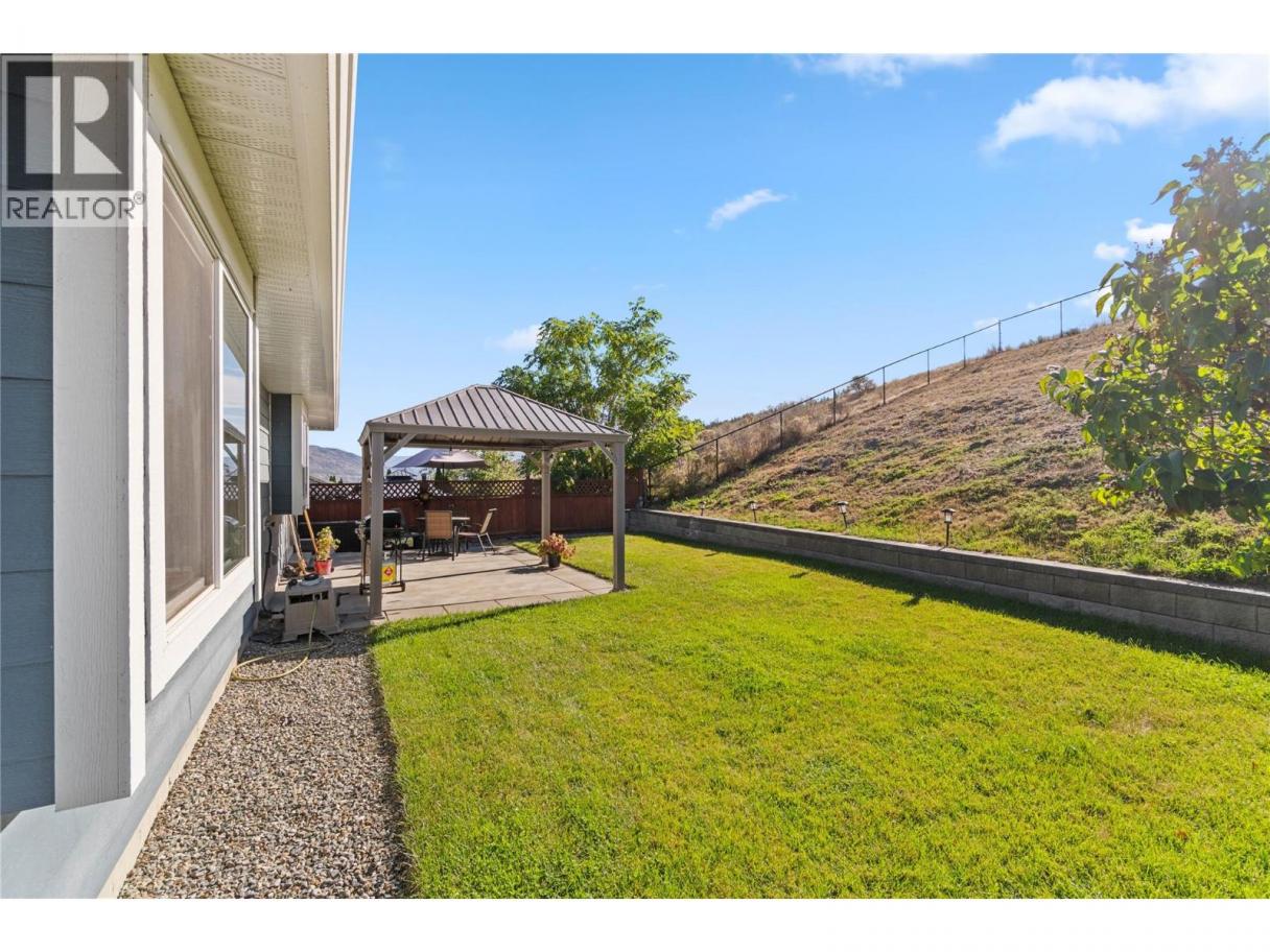 Beautiful family home with great street appeal, xeriscaped front yard & generous 3 car wide driveway for your RV or boat with easy care manual UG sprinklers for the front plantings. Welcoming foyer with front bedroom/office and access to the oversized, heated double garage with tandem bay for a 3rd vehicle or workshop. Upper level features engineered hardwood floors, open concept living with island kitchen with appliances included & lots of cabinets for storage. Spacious living room has gas fireplace & stunning river and mountain vineyard views. Dining area with built-in buffet opens to a private fenced yard with negotiable gazebo — perfect for kids & pets. Three bedrooms up including a spacious primary with 4pc ensuite, double sinks & large shower. Entry level offers a bright bachelor in-law suite with Murphy bed, private entrance & full kitchen with all appliances and full bath — ideal mortgage helper or guest space. New hot water tank, in-house sprinkler system, well maintained & serviced furnace & A/C. Backs onto greenspace with trails & close to neighborhood park — the perfect home for a growing family! (id:6769)