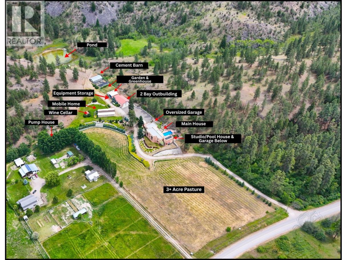Welcome to your private South Okanagan retreat, an extraordinary 10+ acre estate in the heart of wine country. This custom built Santa Fe inspired home with walkout lower level is a one of a kind offering privacy, timeless design, & seamless indoor-outdoor lifestyle. The 3,300 SF 3bdrm, 3bth residence showcases imported Mexican tile, bamboo flooring, & 10' ceilings. The chef’s kitchen features a Bubinga wood island, granite counters, premium appliances, & a walk-in pantry. The main living area centers around a stunning stone fireplace, adding warmth & architectural charm. A spacious primary suite offers a spa ensuite with a clawfoot tub & steam shower. Step outside to your private resort style oasis with an inground saltwater pool, firepit, putting green, & a covered outdoor kitchen. A 32' x 16' Studio/Pool House with Murphy bed, 3pc bth & built-in cabinetry offers flexibility. There is another heated workshop with garage door opening located directly below. The fully fenced acreage inc. a 36' x 50' heated 2 Bay Outbuilding with 16' ceilings, 2pc bth & Sani-dump, multiple outbuildings, equipment sheds, greenhouse, garden & a 14' x 66' 2bd, 2bth mobile home for guests, caretaker, or rental use. Whether you’re seeking a family estate, equestrian retreat, or vineyard vision – bring your ideas! Total sq.ft. calculations are based on the exterior dimensions of the building at each floor level & include all interior walls & must be verified by the buyer if deemed important. (id:6769)