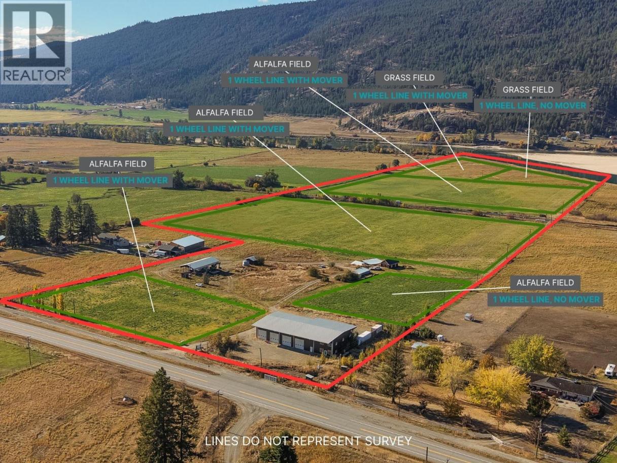 Welcome to 8533 Colt Road, just 20 minutes from Kamloops, a beautiful, gently sloped 64.97-acre organic hay farm that stretches along the North Thompson River. Surrounded by stunning rural views, this property offers peace, productivity, and huge potential for hobby farmers and agriculture-minded buyers alike. The property is currently producing a healthy organic alfalfa and grass hay mix and has a lovely garden, river intake with water license, drilled well, eight irrigation lines - all supports multiple set ups showing the potential for those wanting to expand their green thumb, thinking of starting a winery, cidery, lavender farm, home gardening skills or continue operations as a hay farm - you name it! A highlight is the ~60’ x 120’ steel-frame shop (approx. 7,200 sq.ft.)! Featuring high ceilings, 6 large bay doors, poured concrete foundation with in-floor hydronic heating in roughly one-third of the space, LED lighting, and 600V three-phase power, PLUS a ready-to-install 28’ x 60’ mezzanine area should the next owner wish to add it! Other outbuildings include a large hay shed ~30’ x 80’, smaller shop with cold storage ~24’ x 26’, two lean-tos (one large ~24’ x 40’, one smaller ~21’ x 24’), a log-built outbuilding ~20’ x 30’, a small storage structure ~16’ x 40’, and several other useful storage spaces. Opportunity knocks with this beautiful property with premium water access, great infrastructure and endless flexibility all within a peaceful, scenic setting! (id:6769)