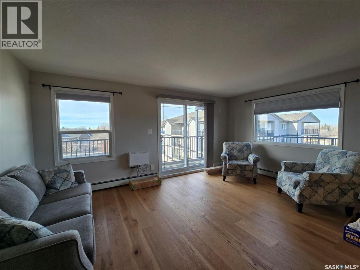 Welcome to Bannerman Park Estates, this is a corner unit on the 4th floor giving a wide expanse of views and a wrap around balcony. The main living area is an open floor plan with tons of natural light, and upgraded hardwood flooring throughout. The kitchen offers plenty of counter and cabinet space and nice appliances. The master bedroom is large, with lots of storage, and a three piece en-suite. There is a second bedroom , a full bath, and a laundry room completing the living space. Bannerman Park Estates offers a well cared for building, with heated parking , and plenty of fellowship. If you're looking for that perfect condo unit in the perfect location, this one is for you. (id:6769)