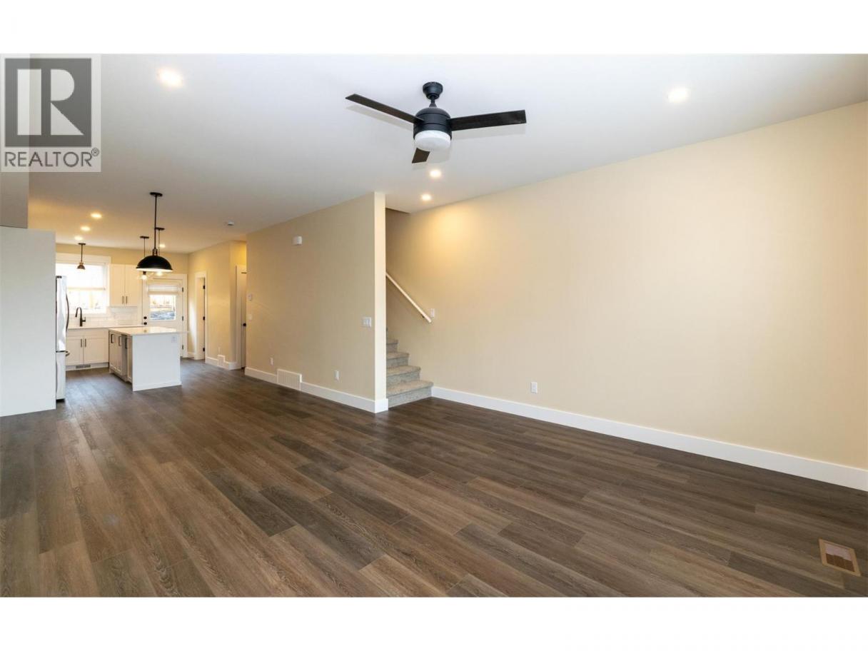 Welcome to Hillside Terrace, a neighbourhood of townhomes, with unit #5 offering 1567 sq/ft of tastefully designed living space, complemented by driveway parking and plenty of garage space. The open concept main level features plank flooring throughout, and contains the living room, dining area, powder room, and kitchen with shaker-style cabinets, quartz counters, and an 8’ sit-at island with a spot for your beverage fridge. Just off the kitchen, enjoy views of the lake, mountains and the city lights from your 15'x6' deck-a great spot for your BBQ and some chairs to relax. Upstairs, the plush carpeting introduces the primary bedroom with an ensuite, a second and third bedroom, and the main bathroom. On the lower level you can step out to your backyard which is privately fenced and includes artificial turf and patio space (Low maintenance=low strata fees). For additional space, you have a flex-room that awaits your plan: This is where you could have a media room, an office, he/she-cave, a storage room, or leave it open to accompany motor toys or a 2nd vehicle, and save $4000. Sound-proofed, gas heat, central air, window coverings, LG stainless fridge, gas range and dishwasher and a white Whirlpool stacker washer and dryer all included for exceptional value! Centrally located, to schools, recreation/events, shopping, restaurants, theatres, pet friendly. Purchase early to pick out some of your finish colours, like light fixtures & interior paint colour. (id:6769)