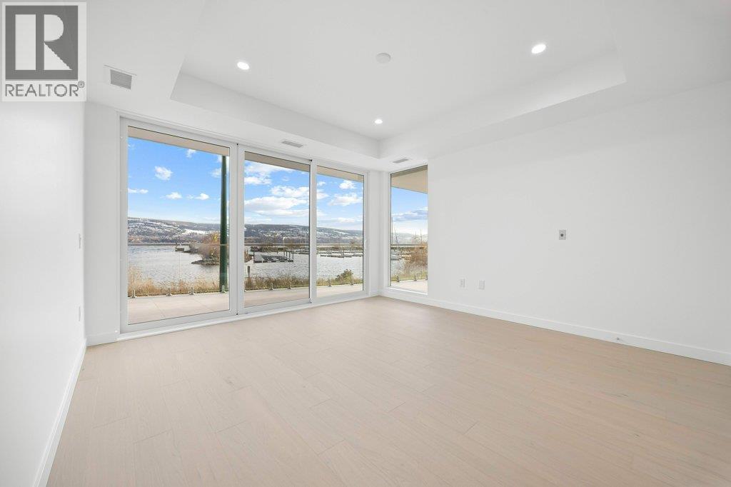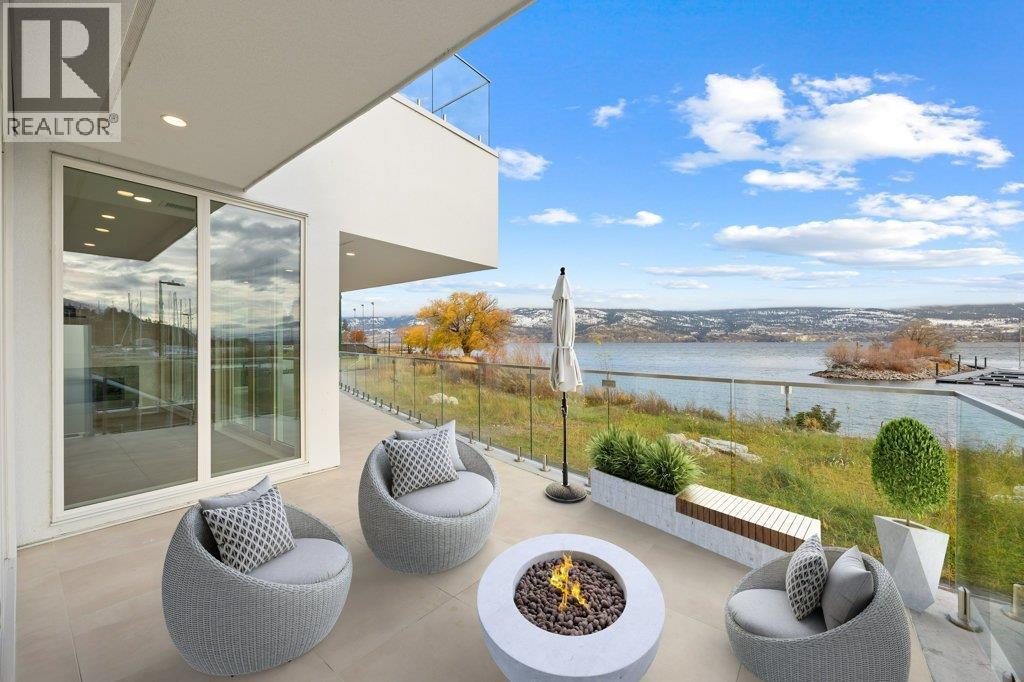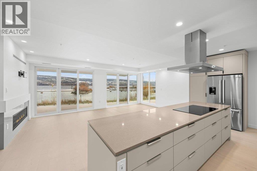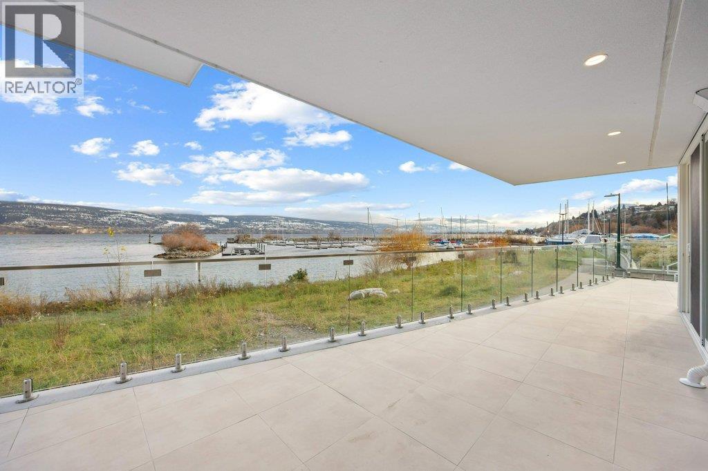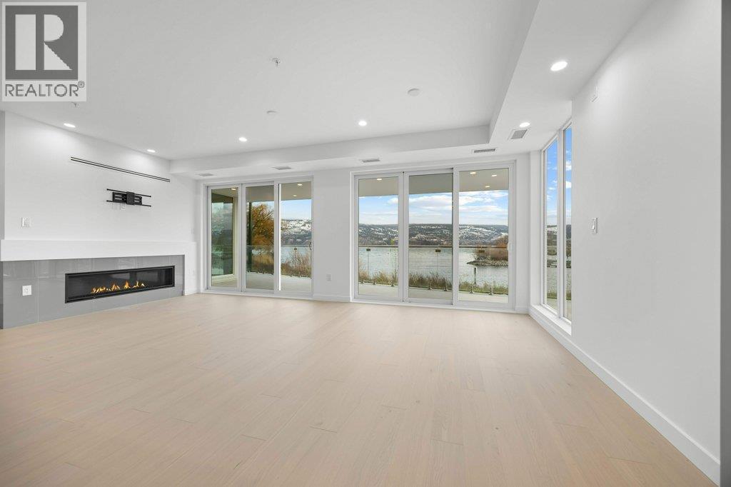 This gorgeous, luxurious, brand-new ground level lake front home awaits you, with expansive views that dreams are made of. Lavish 2 Bedroom & Den, 1829 sq ft, high ceilings, open floor plan, lovely gas fireplace for cozy winter nights, upgraded hardwood & tile throughout, quartz countertops: This Riviera living style blends coastal chic with Mediterranean elegance. Experience joyful meal prep & entertaining with the Bosch appliance package, oversized island, ample cabinetry & lake views galore. Enjoy spectacular Okanagan outdoor living on the 731 sq ft porcelain paver deck with NG BBQ outlet. The laundry room is spacious - includes countertop, sink, cabinetry, & large adjoining pantry. The mechanical room has a NG forced air furnace & there is central air, for hot summer nights. The upgraded electrical package accommodates ceiling fans if desired, & rear wall speakers to enjoy true surround sound. Construction of this complex is steel & concrete – only the best will do! 2 secure parking stalls are included in the heated garage, the breezeway from parkade to front door is tiled with luxury porcelain pavers, and there is a 260 sq ft, private & secure, heated storage unit included. The Oasis is just steps away from several beaches, water park, dog park, extensive waterfront walking paths, & upscale Shaughnessy’s Cove, for dining out with family and friends. Dreams can come true – your Oasis awaits you! Please contact your favourite Realtor to view. Measurements by iGuide. (id:6769)