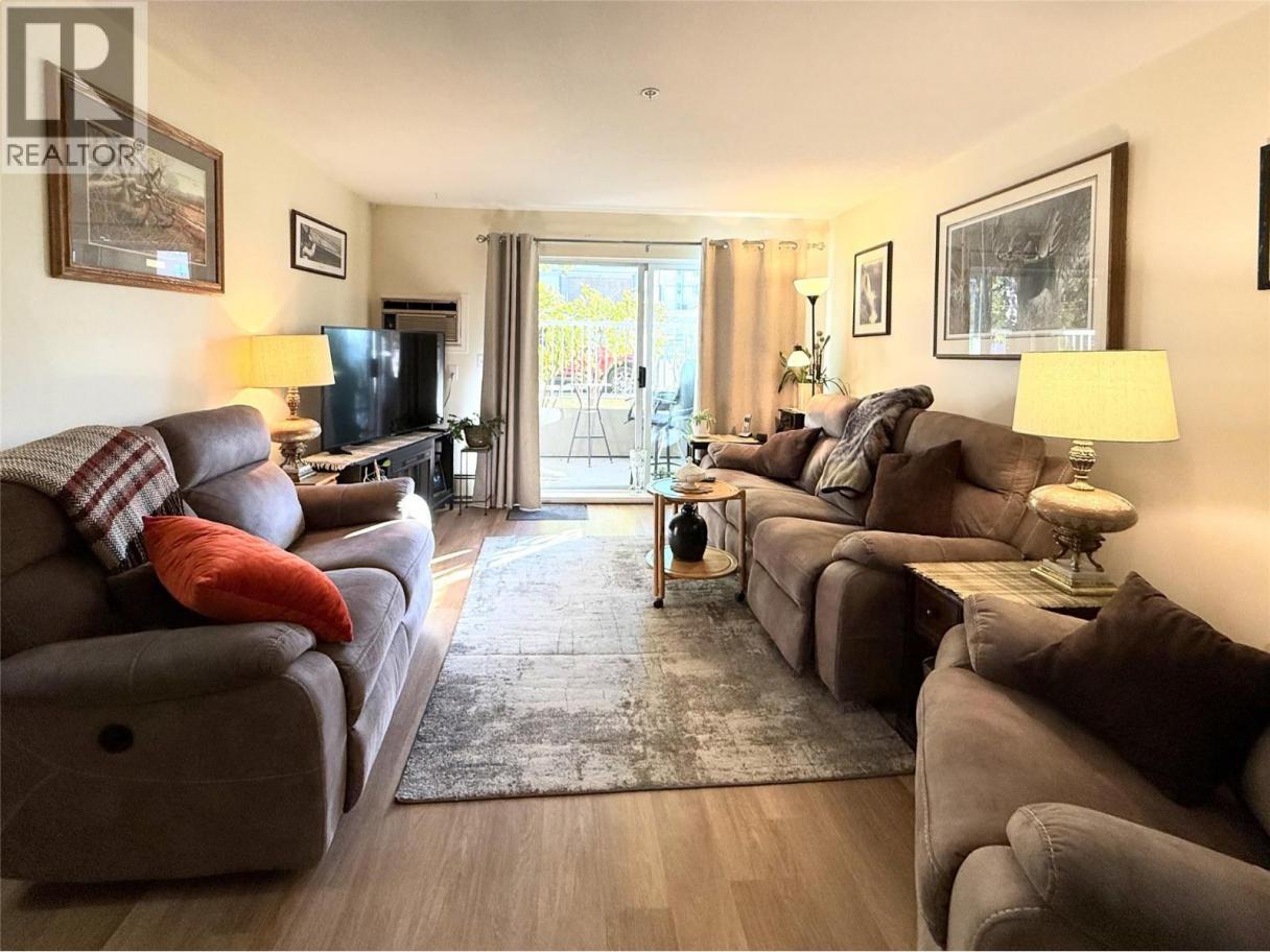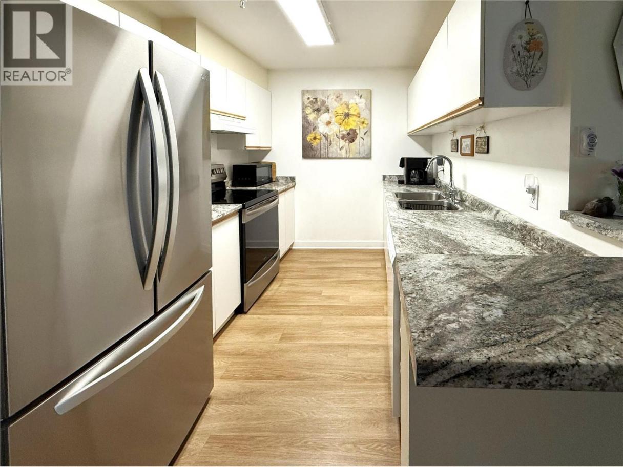 Bright & Comfortable 55+ Living at Manor House. Great opportunity to own in the highly desired, centrally located Manor House. This 55+ community offers comfort, convenience, and a welcoming atmosphere. This updated, 2-bedroom, 2-bath unit is move-in ready with end of November possession. Enjoy the benefits of a main floor location, perfect for easy access and relaxing on your covered private deck surrounded by trees. Inside, you’ll find easy-care laminate flooring, an updated bathroom with a large walk-in shower., plus a spacious open-plan living and dining area. The bright kitchen comes with all appliances & new counters with wider bar for entertaining. Added conveniences include a wall A/C unit, in-suite laundry with stacking washer & dryer, and extra storage. Manor House also offers a community recreation room for social gatherings with neighbours. Parking available by strata waitlist. (id:6769)