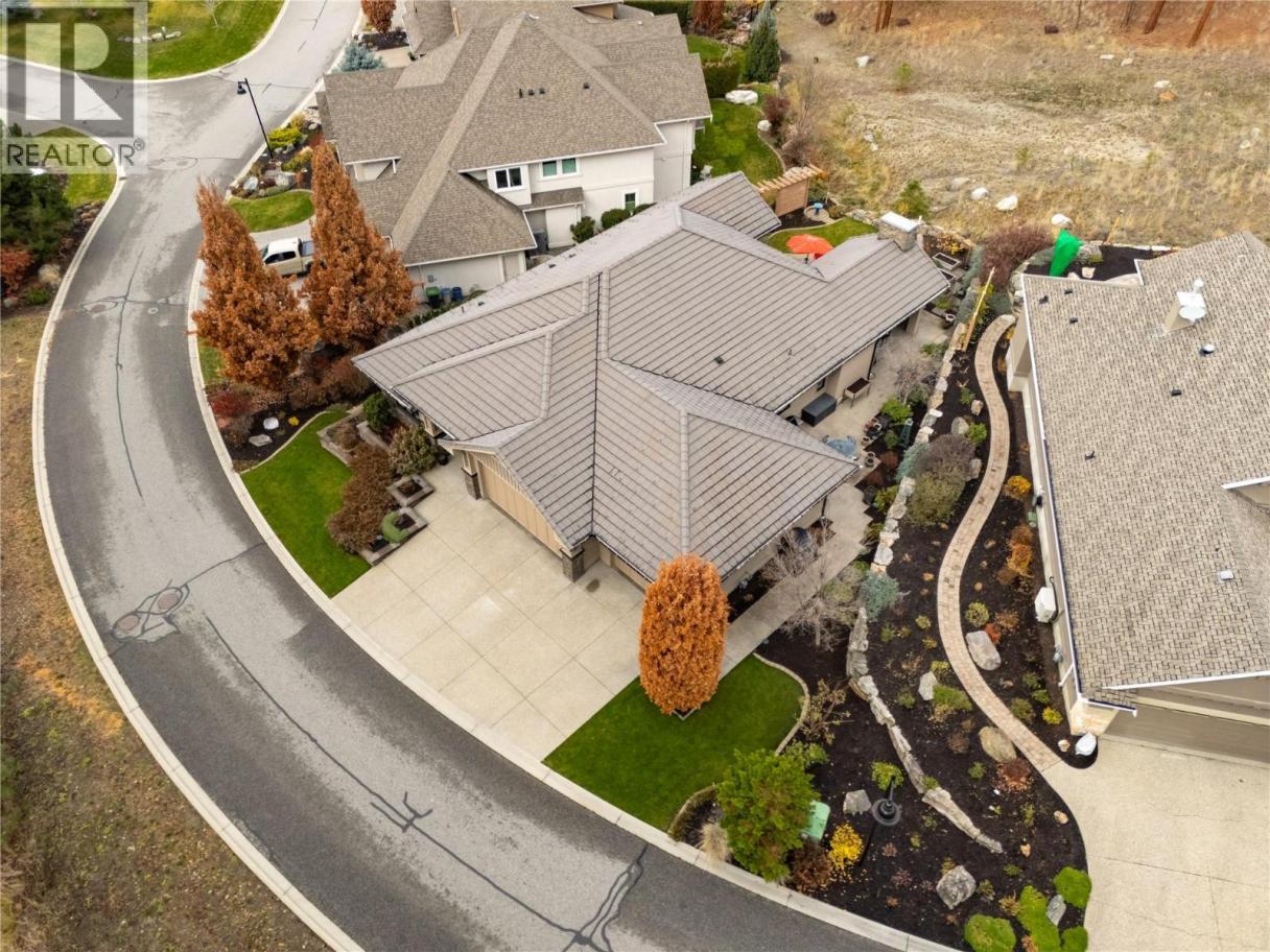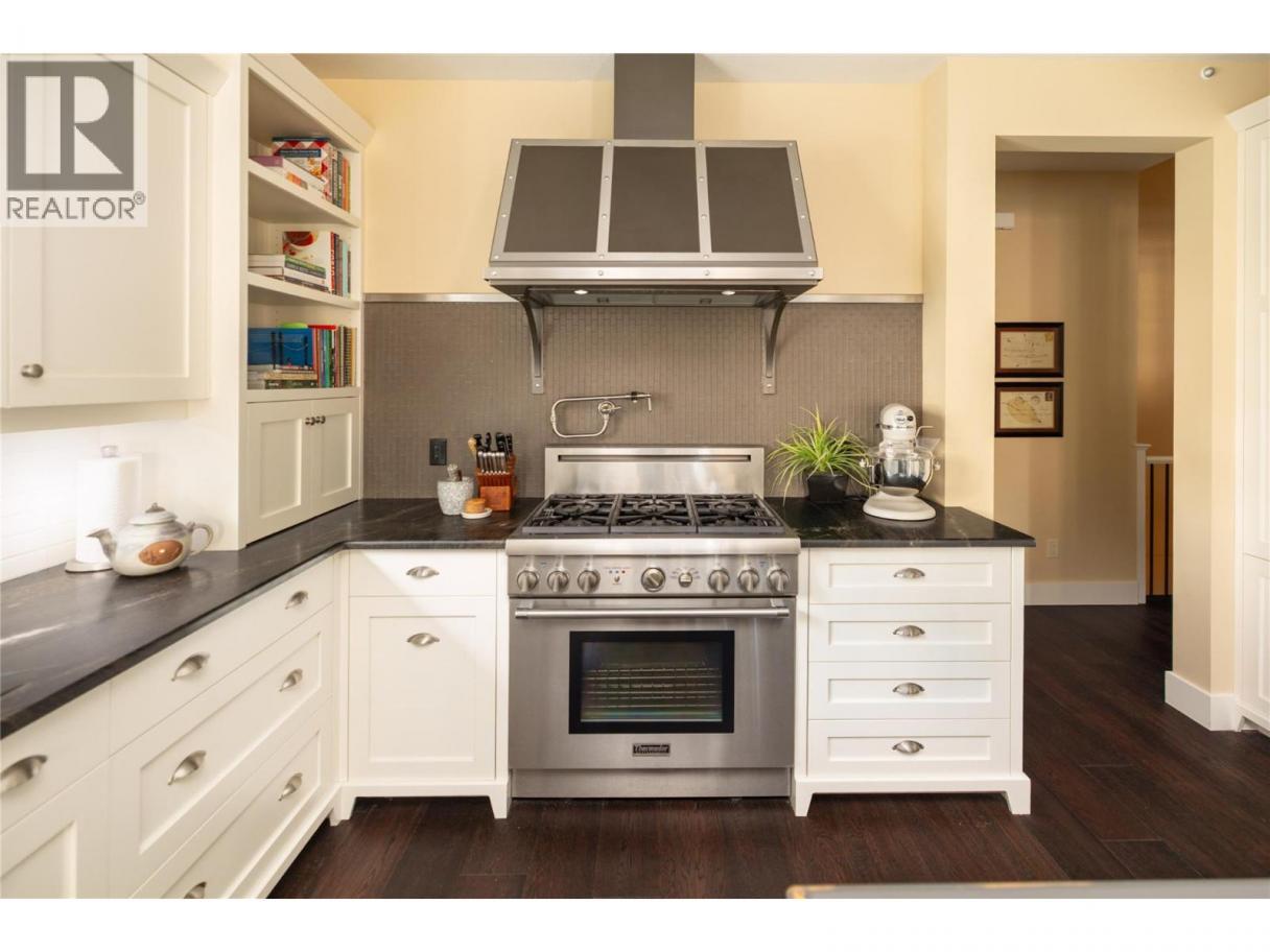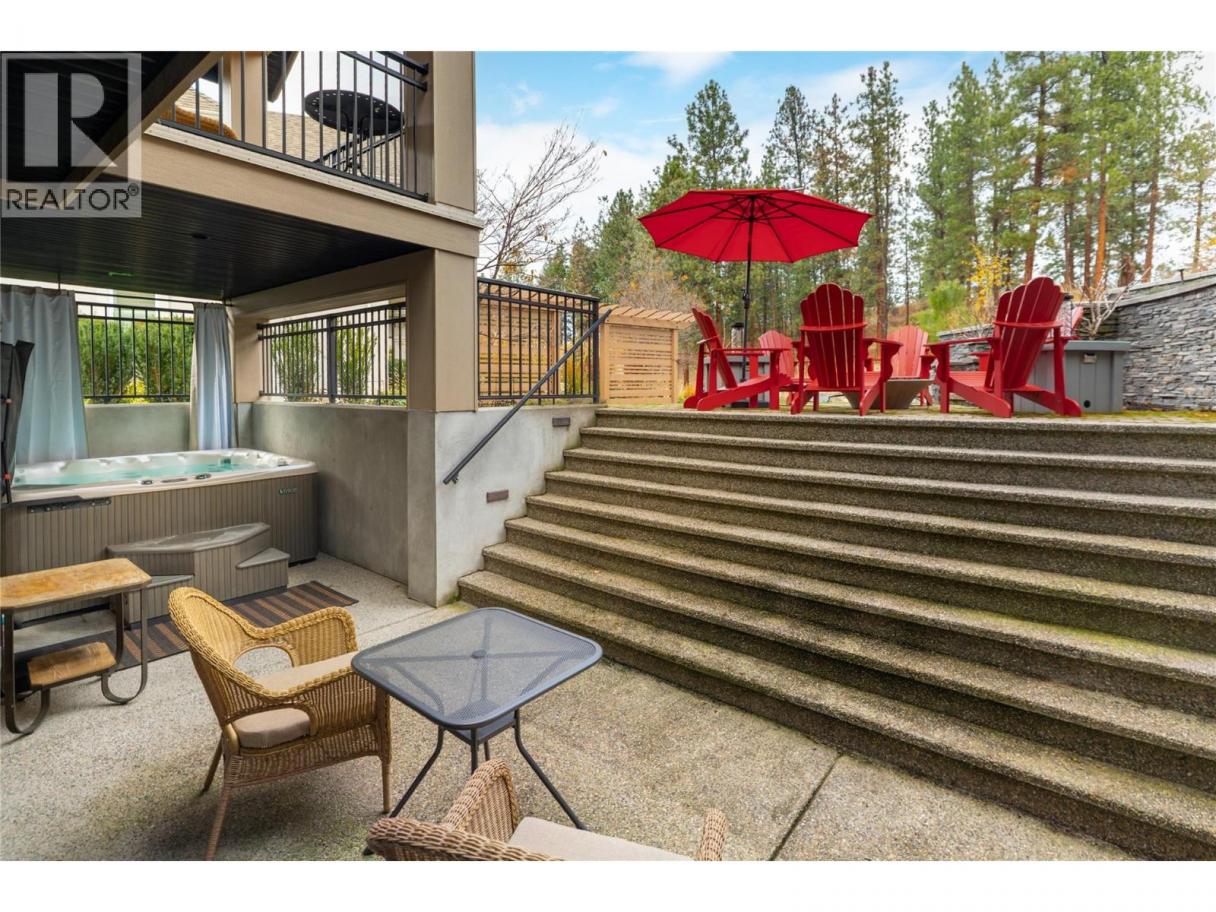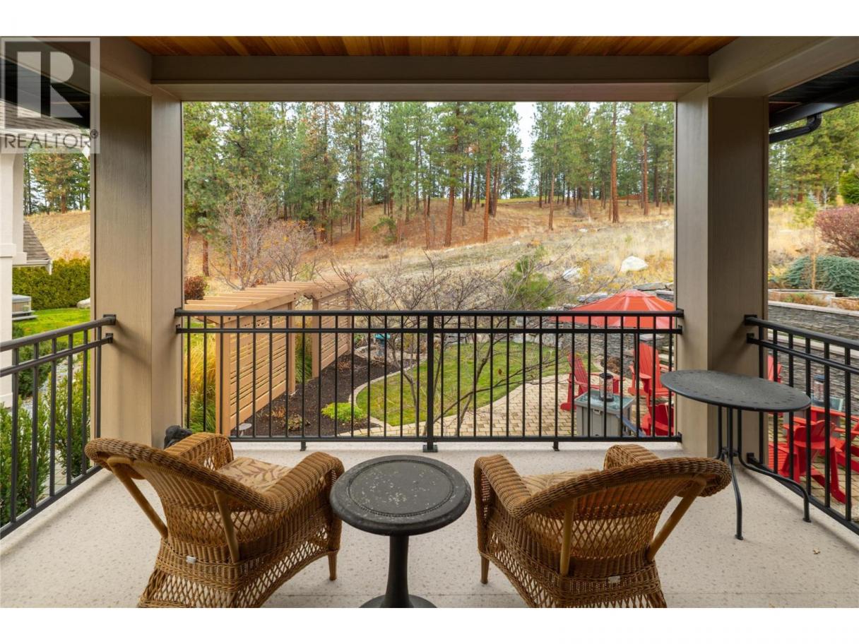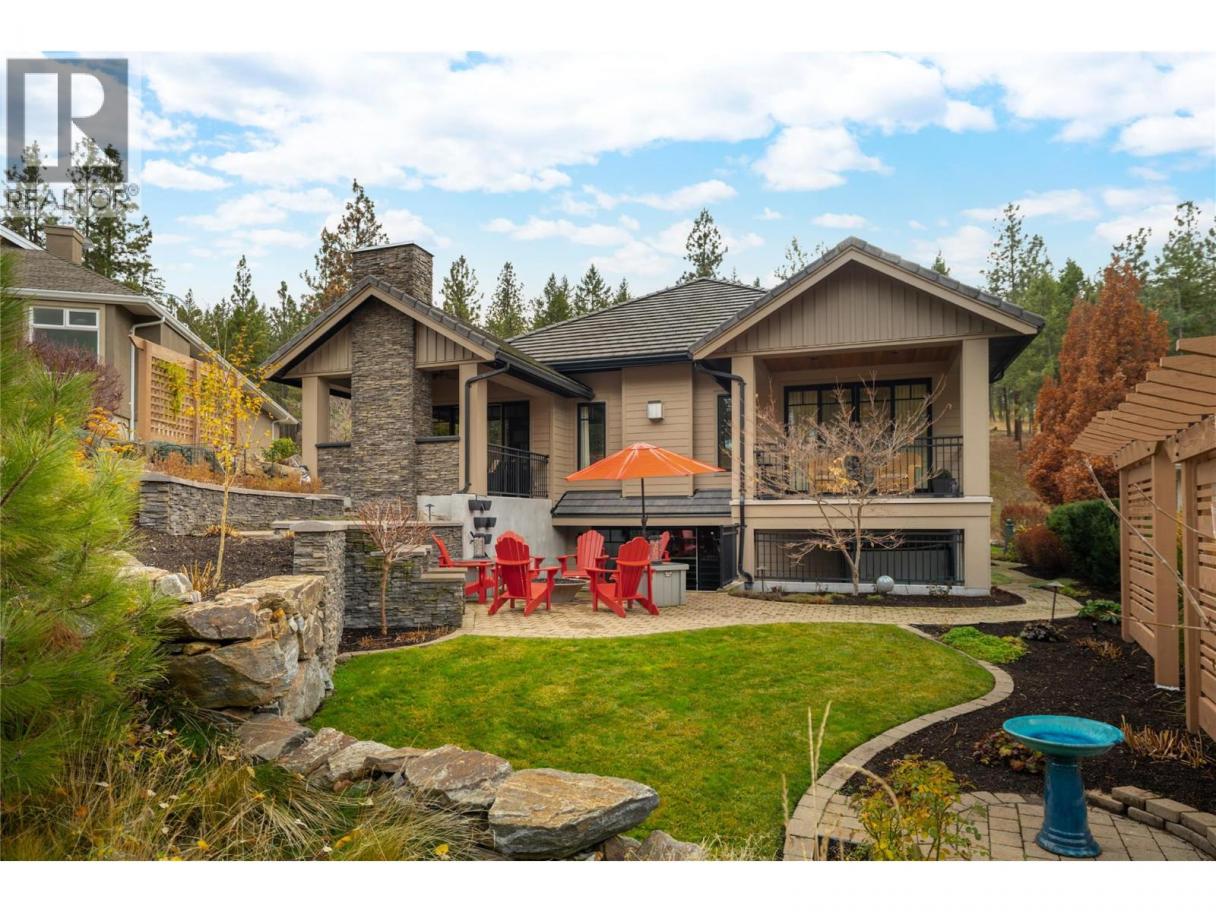 Privately positioned in an exceptionally quiet setting with no neighbours in front or behind, this thoughtfully designed residence is surrounded by mature trees and meticulous landscaping, offering a rare sense of seclusion. Built with longevity and quality in mind, the FireSmart Hardie Board exterior, concrete tile roof, Loewen windows, and handcrafted fir front door set the tone for the level of finish carried throughout. Engineered hardwood flooring, solid core doors, and all-wood casings create a cohesive, timeless interior. The kitchen is the heart of the home, featuring Brazilian soapstone countertops, solid maple cabinetry, an expansive custom island, six-burner gas range, Thermador appliance package, and a dedicated beverage centre. Indoor-outdoor living is seamless with a covered upper deck complete with gas fireplace and BBQ hookup. The walk-out lower level offers impressive ceiling heights, a custom wet bar, gas fireplace, theatre room, and access to a private patio with Beachcomber hot tub and Restoration Hardware fire bowl. A hybrid heat pump/gas furnace, EV-ready 3 car garage, grade-level windows, and thoughtful accessibility features further enhance this exceptional home designed for comfort, privacy, and everyday enjoyment. Set within the prestigious Gallaghers Canyon community, residents enjoy an unmatched lifestyle with world-class golf, scenic walking trails, and a strong sense of community—just minutes from Kelowna’s amenities. A rare combination of privacy, craftsmanship, and lifestyle — this is a must-see to be fully appreciated. (id:6769)