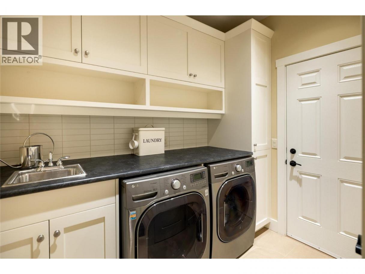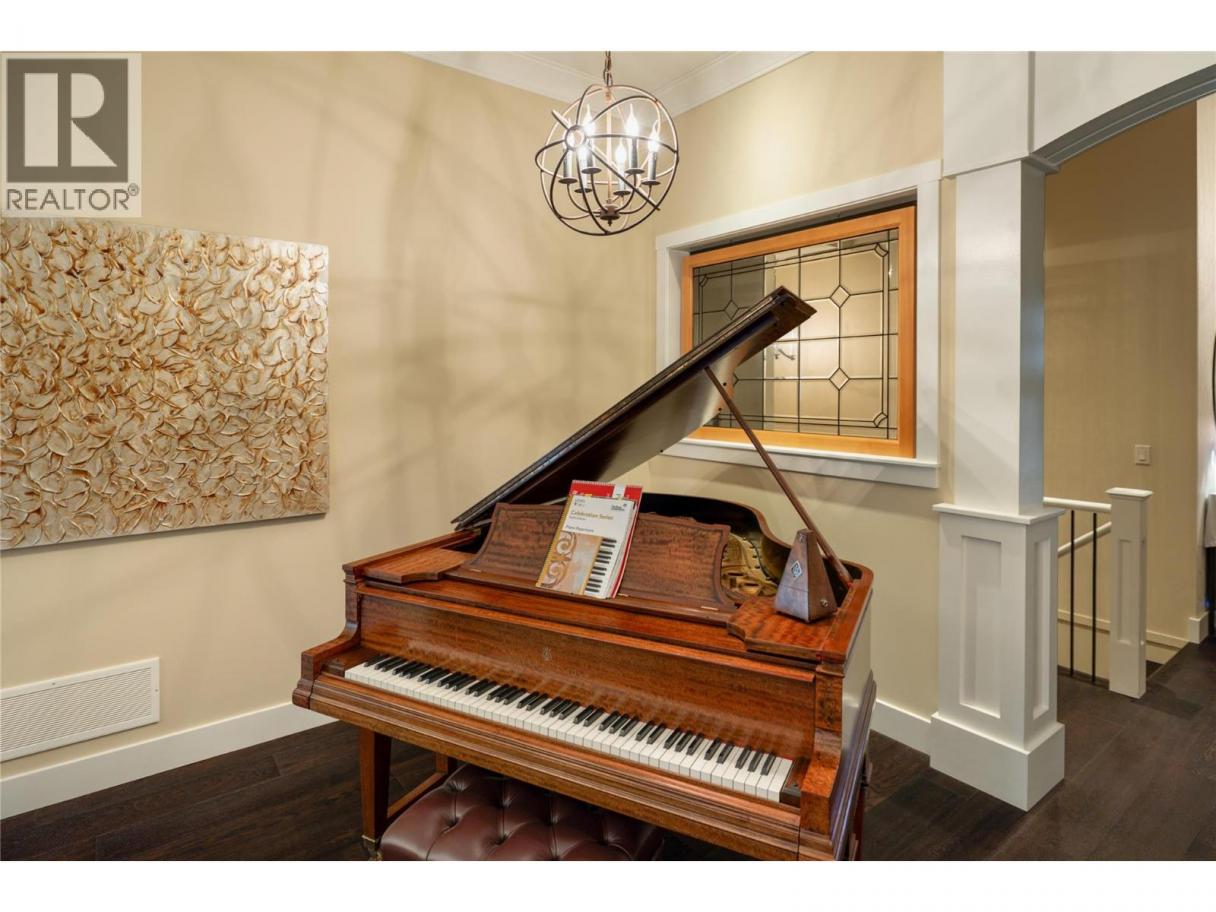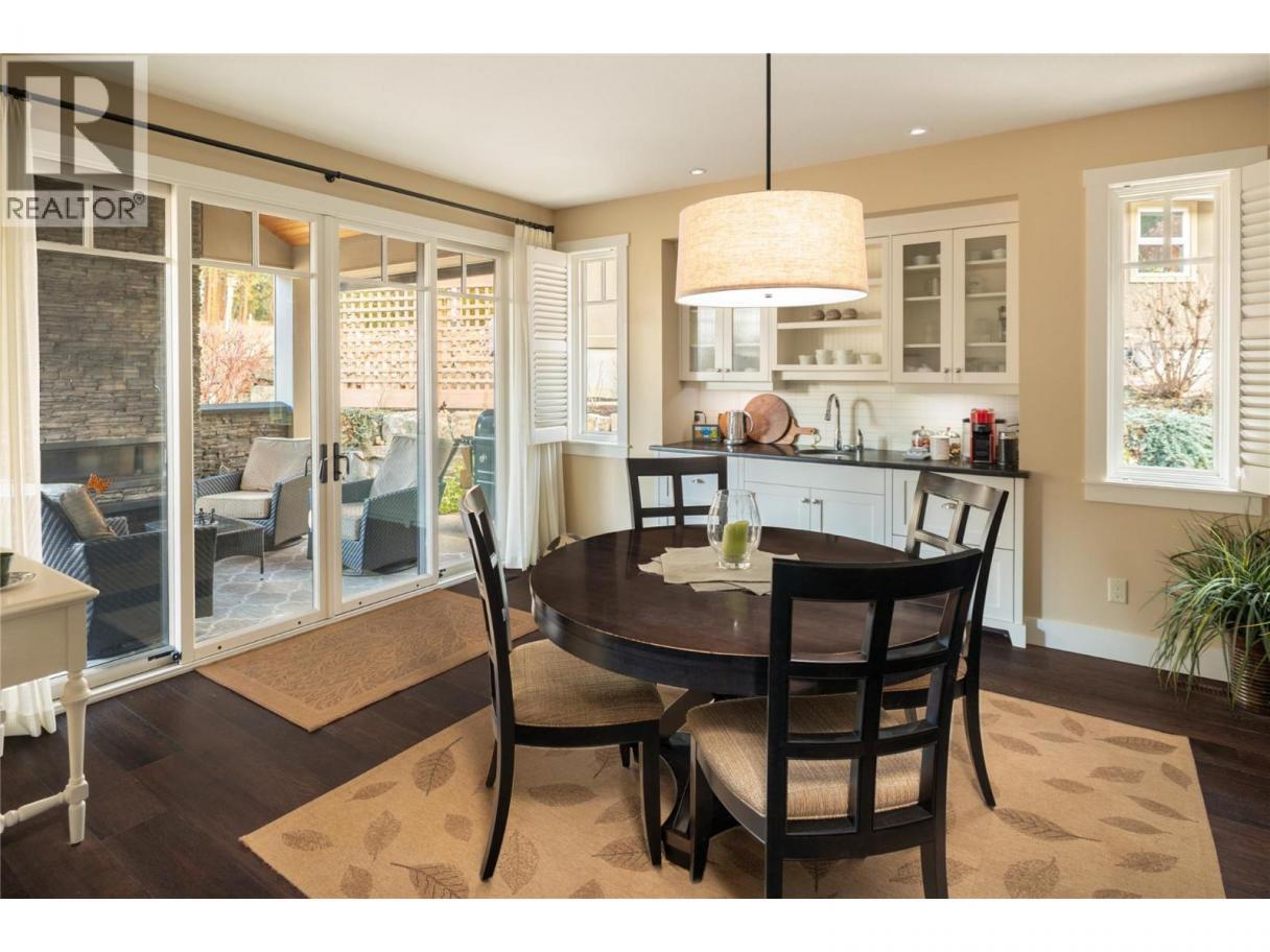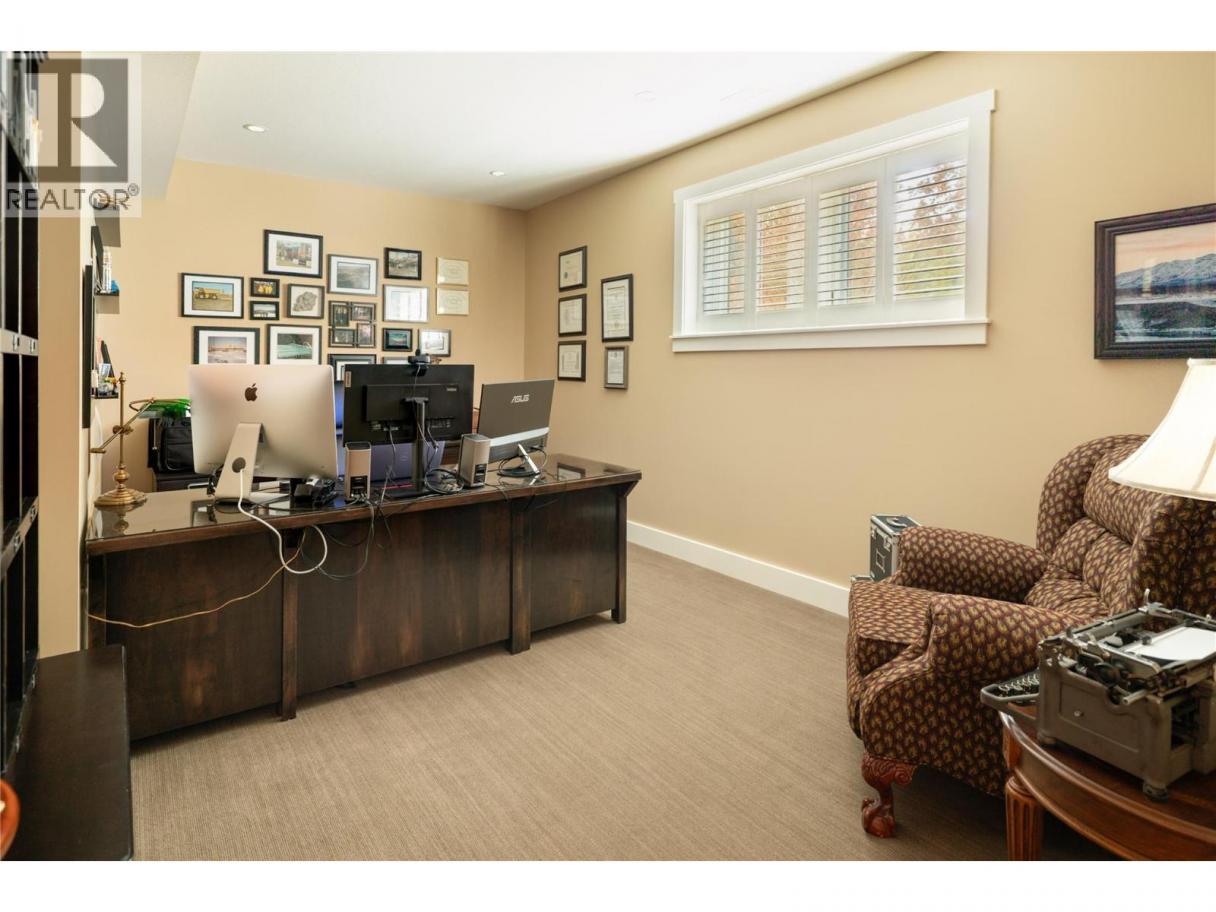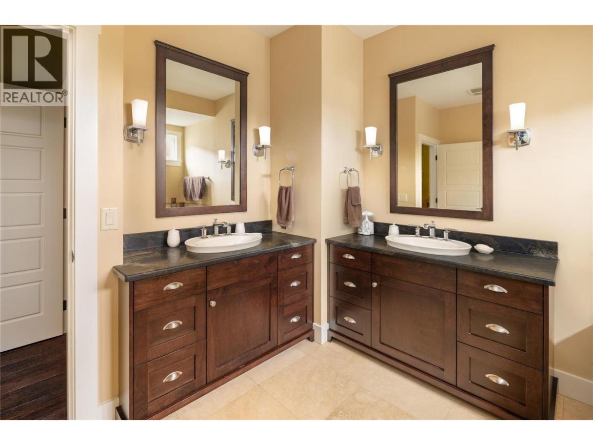 Privately positioned in an exceptionally quiet setting with no neighbours in front or behind, this thoughtfully designed residence is surrounded by mature trees and meticulous landscaping, offering a rare sense of seclusion. Built with longevity and quality in mind, the FireSmart Hardie Board exterior, concrete tile roof, Loewen windows, and handcrafted fir front door set the tone for the level of finish carried throughout. Engineered hardwood flooring, solid core doors, and all-wood casings create a cohesive, timeless interior. The kitchen is the heart of the home, featuring Brazilian soapstone countertops, solid maple cabinetry, an expansive custom island, six-burner gas range, Thermador appliance package, and a dedicated beverage centre. Indoor-outdoor living is seamless with a covered upper deck complete with gas fireplace and BBQ hookup. The walk-out lower level offers impressive ceiling heights, a custom wet bar, gas fireplace, theatre room, and access to a private patio with Beachcomber hot tub and Restoration Hardware fire bowl. A hybrid heat pump/gas furnace, EV-ready 3 car garage, grade-level windows, and thoughtful accessibility features further enhance this exceptional home designed for comfort, privacy, and everyday enjoyment. Set within the prestigious Gallaghers Canyon community, residents enjoy an unmatched lifestyle with world-class golf, scenic walking trails, and a strong sense of community—just minutes from Kelowna’s amenities. A rare combination of privacy, craftsmanship, and lifestyle — this is a must-see to be fully appreciated. (id:6769)