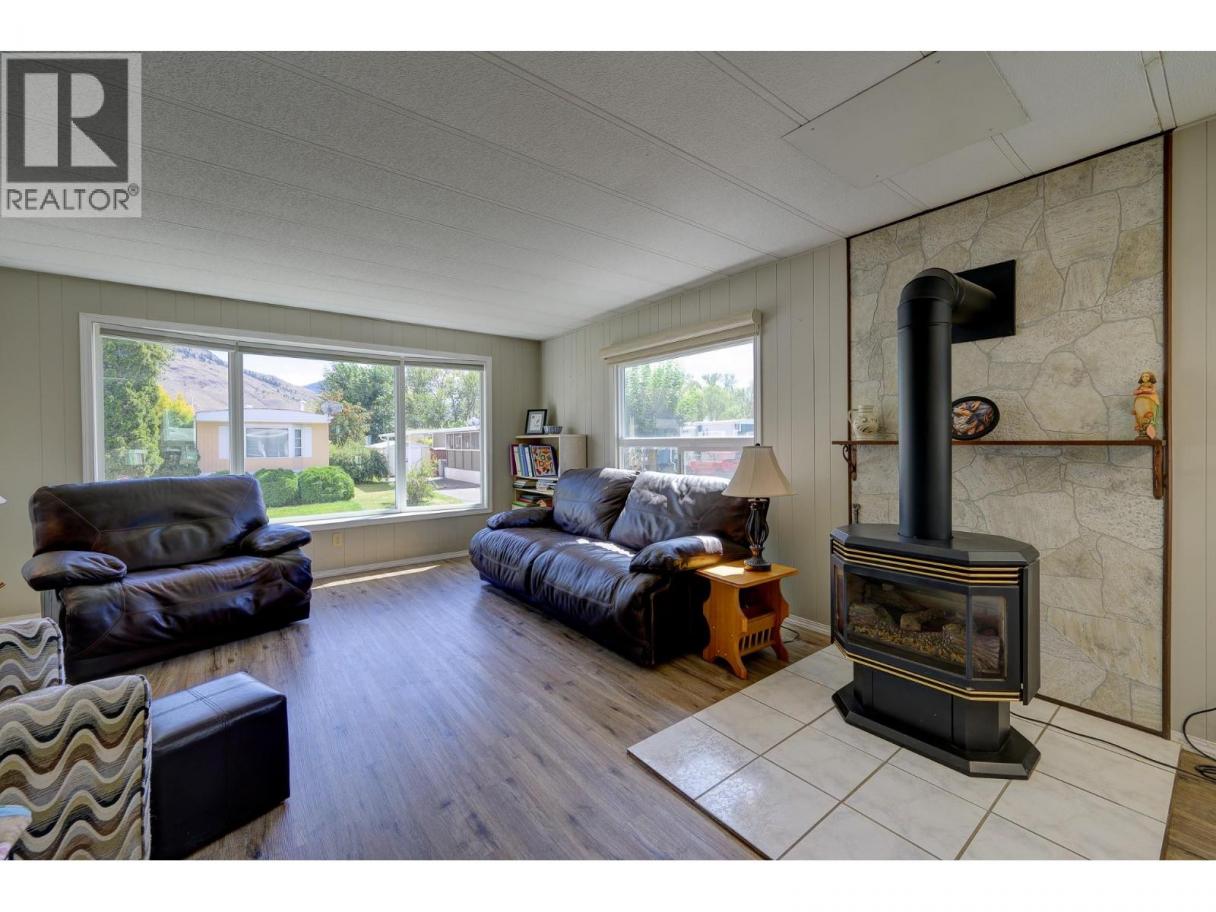 Nestled in the welcoming 55+ section of Oakdale Mobile Home Park, this well-maintained modular home offers comfort, convenience, and charm. Featuring 2 bedrooms and a thoughtfully designed bathroom with a walk-in accessible shower, the layout is both functional and inviting. The bright, open living room boasts a freestanding gas fireplace and flows seamlessly into the kitchen and dining area—perfect for cozy evenings or casual entertaining. A compact laundry space with built-in storage adds everyday practicality. Outside, enjoy a nice yard with a newer fence, a handy storage shed, and a concrete stone patio ideal for relaxing or hosting. Recent updates include vinyl windows, a new furnace and hot water tank (2022), and roof sealant applied in 2022. Just steps from the scenic Rivers Trail and minutes from Centennial Park, this move-in-ready home is a gem waiting to be enjoyed. All meas approx. (id:6769)