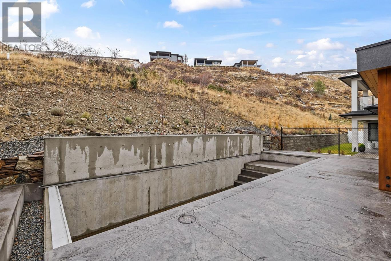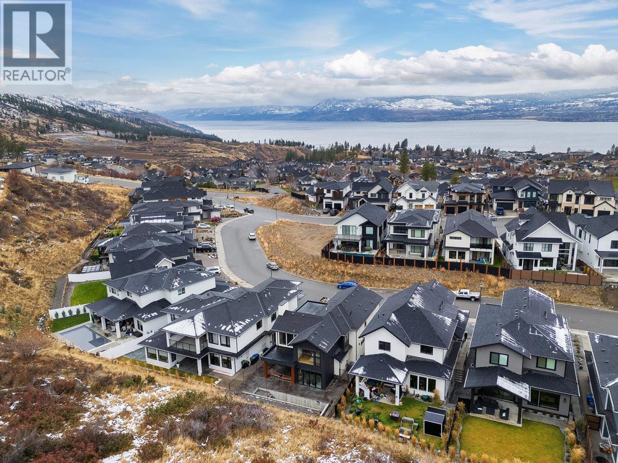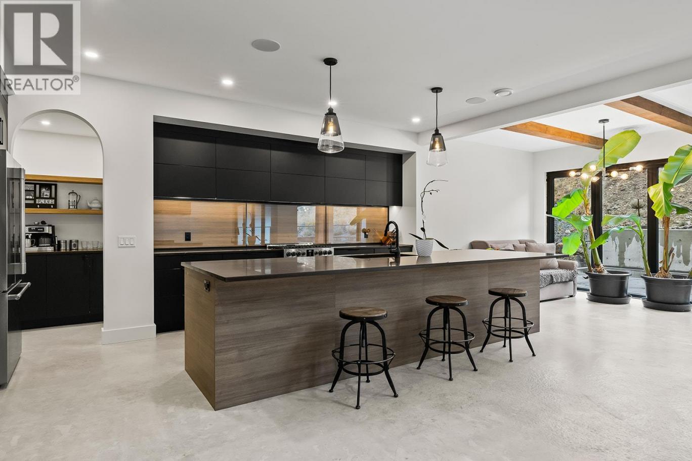 This Kettle Valley contemporary home blends luxury Okanagan living with striking architectural detail and a bright, polished interior. Approx. 2,384 sq ft across two levels creates easy flow, starting with an impressive main floor featuring soaring ceilings, floor to ceiling windows, and a seamless connection to the covered patio with two folding doors and in-ground pool area. The kitchen pairs sleek black cabinetry with warm wood accents, stainless steel appliances, a walk-in coffee bar area, and a large island that opens to the dining and living spaces. Enjoy in-floor hydronic heating throughout the entire main floor, office, and entryway. A natural gas fireplace anchors the room, while the glass enclosed wine cabinet adds a bold focal point. The main level also includes an office, mudroom, bathroom, and access to the garage. Upstairs, you’ll find three bedrooms including the spacious primary with a modern ensuite and generous walk-in-closet. A full bathroom, and laundry room complete the upper level. The backyard sits against natural rockwork for privacy and a dramatic backdrop, the opportunity to add your own finishing touches to this 12x34 concrete pool. Located in a quiet pocket of Kettle Valley near parks, trails, schools, and the new Mission Park Shopping Centre, this home suits families or investors seeking a unique and modern property in a highly desirable neighbourhood. (id:6769)