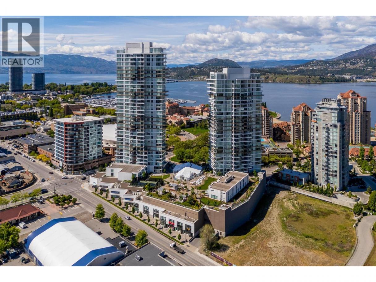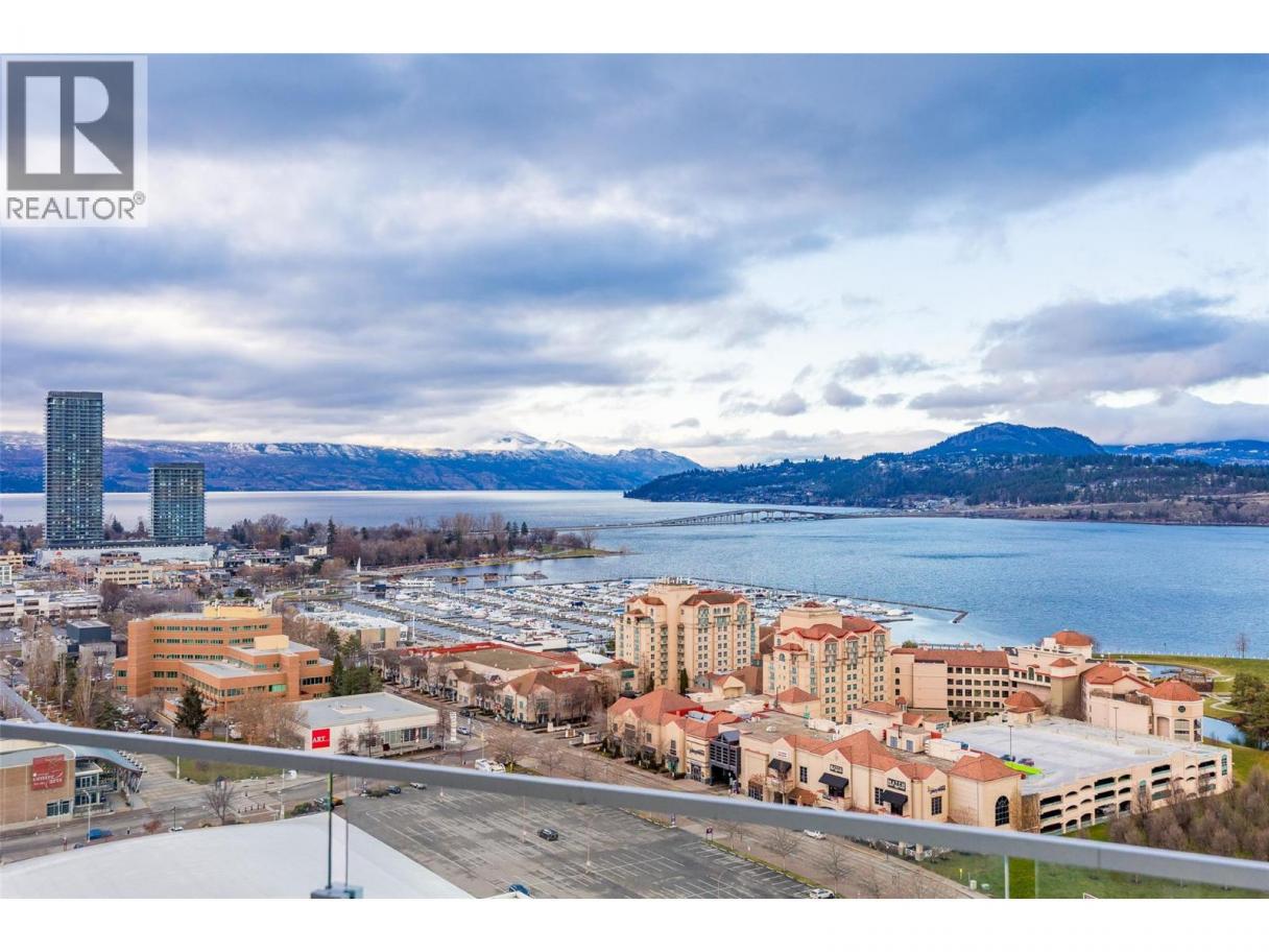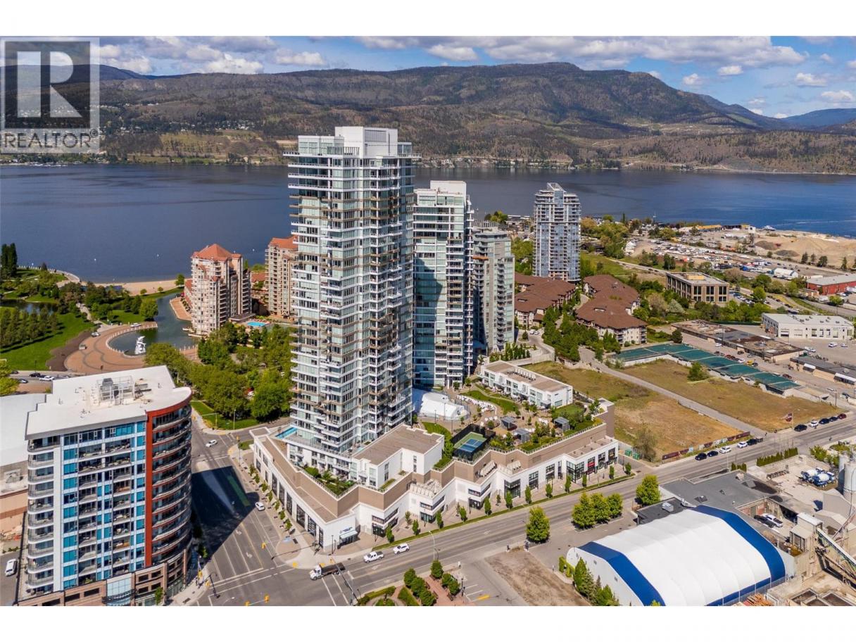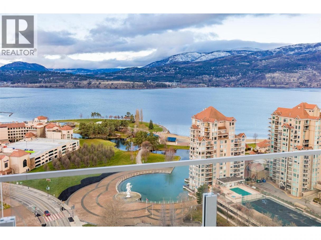 PANORAMIC LAKE VIEWS. Perched high above the city, unit 2205 at One Water Street delivers a true condo-in-the-sky experience with a sweeping west-facing vistas, capturing lake, city mountain & sunset views from every angle! This 2 bed, 2 bath corner unit features an open floor plan where the kitchen, dining and living spaces flow seamlessly to a massive covered sundeck overlooking Kelowna’s waterfront park & Okanagan Lake. The best spot in town to watch boats pass and a front row seat to take in the fireworks! The kitchen blends warm beach tones inspired by Knox Mountain with stainless steel appliances, gas range, island seating, upgraded lighting & near floor to ceiling windows. Custom upgrades include Westwood cabinetry in the primary bedroom and a built-in laundry closet with stacked washer & dryer. The primary bedroom offers a walk-in closet & 3-pc ensuite, while the 2nd bedroom captures jaw-dropping lake views. Ideal as a guest room, office, or flex space! This condo also has a second 4-pc bath with rain shower. Enjoy resort-style amenities: 2 pools, hot tub, fitness centre, yoga studio, steam room, pickleball court, BBQ stations, fire pits, security, guest suites, car wash bay, dog park & more! Includes 1 parking stall near the elevator + 1 storage locker. Convenience meets luxury - live steps to the beaches, restaurants, breweries, coffee shops, Prospera Place, the Cultural District, yacht club + city transit! Move in this spring! A fast possession is possible! (id:6769)