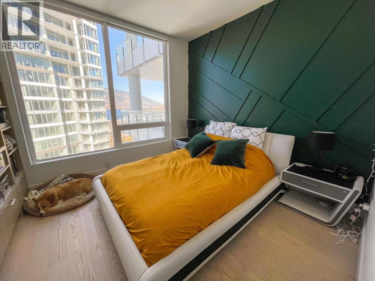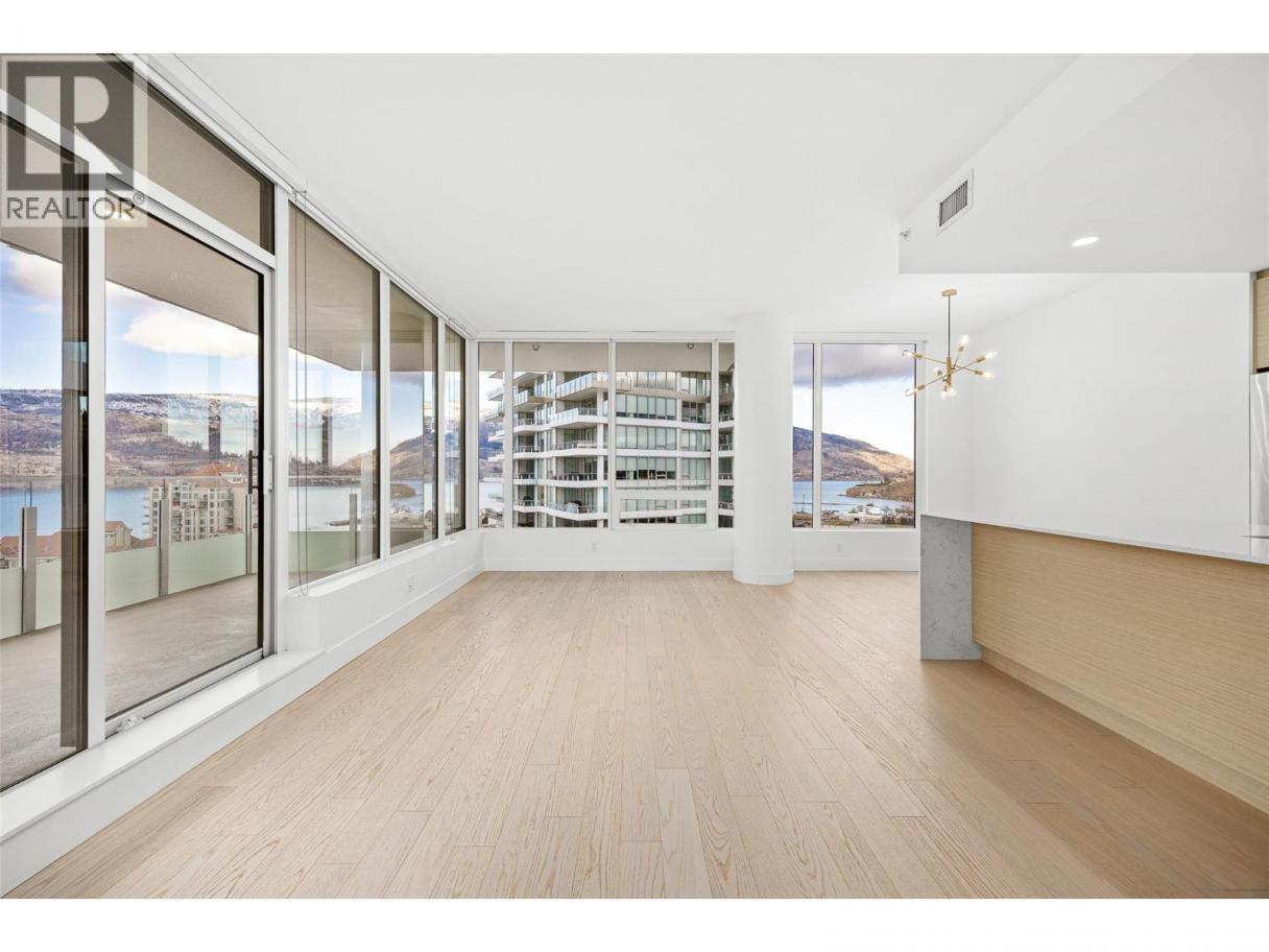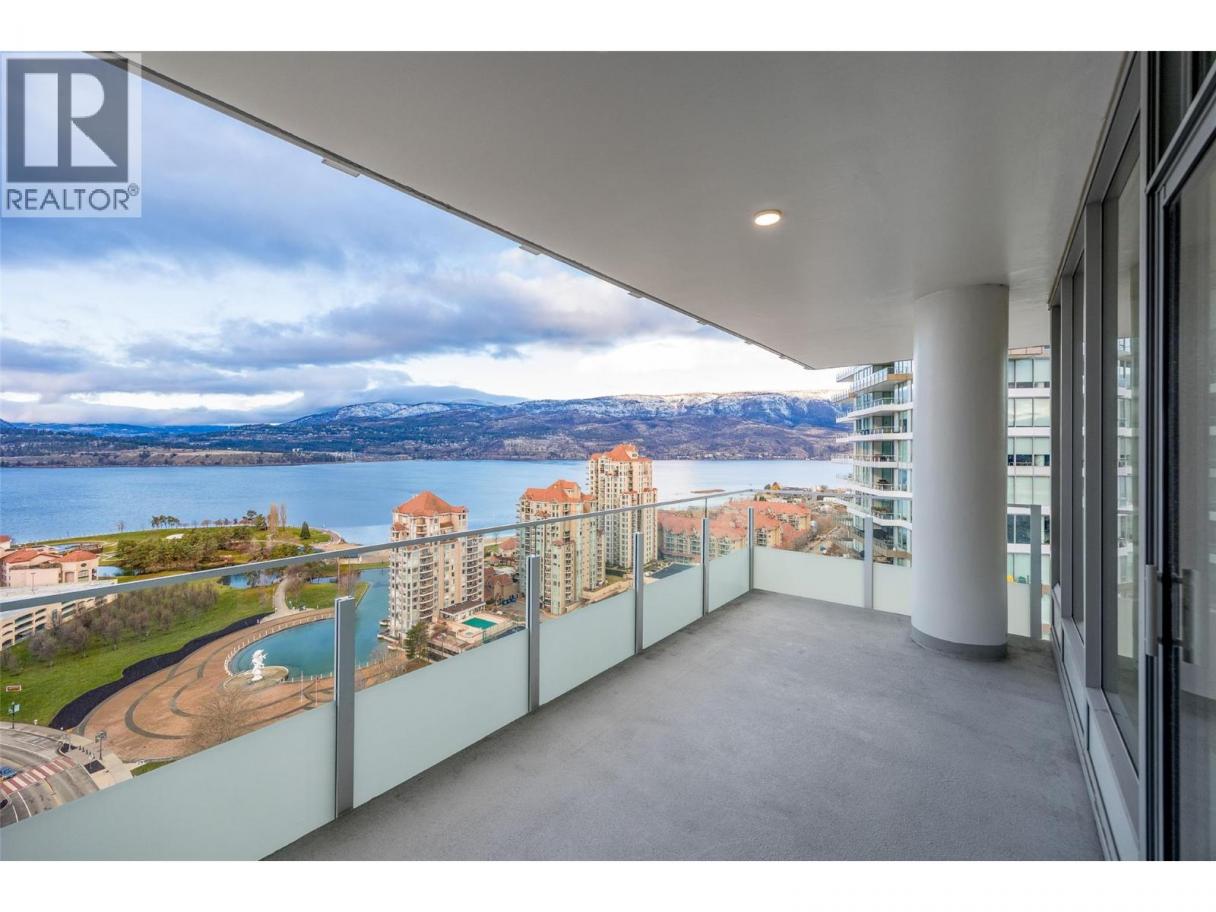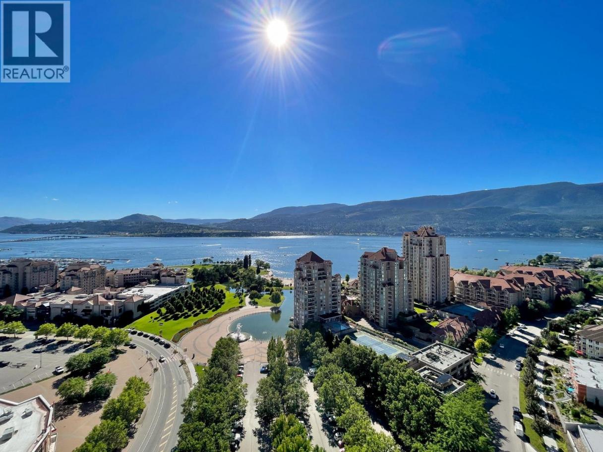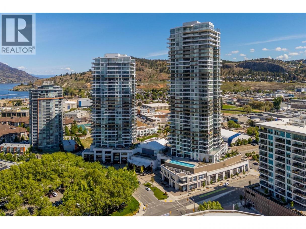 PANORAMIC LAKE VIEWS. Perched high above the city, unit 2205 at One Water Street delivers a true condo-in-the-sky experience with a sweeping west-facing vistas, capturing lake, city mountain & sunset views from every angle! This 2 bed, 2 bath corner unit features an open floor plan where the kitchen, dining and living spaces flow seamlessly to a massive covered sundeck overlooking Kelowna’s waterfront park & Okanagan Lake. The best spot in town to watch boats pass and a front row seat to take in the fireworks! The kitchen blends warm beach tones inspired by Knox Mountain with stainless steel appliances, gas range, island seating, upgraded lighting & near floor to ceiling windows. Custom upgrades include Westwood cabinetry in the primary bedroom and a built-in laundry closet with stacked washer & dryer. The primary bedroom offers a walk-in closet & 3-pc ensuite, while the 2nd bedroom captures jaw-dropping lake views. Ideal as a guest room, office, or flex space! This condo also has a second 4-pc bath with rain shower. Enjoy resort-style amenities: 2 pools, hot tub, fitness centre, yoga studio, steam room, pickleball court, BBQ stations, fire pits, security, guest suites, car wash bay, dog park & more! Includes 1 parking stall near the elevator + 1 storage locker. Convenience meets luxury - live steps to the beaches, restaurants, breweries, coffee shops, Prospera Place, the Cultural District, yacht club + city transit! Move in this spring! A fast possession is possible! (id:6769)