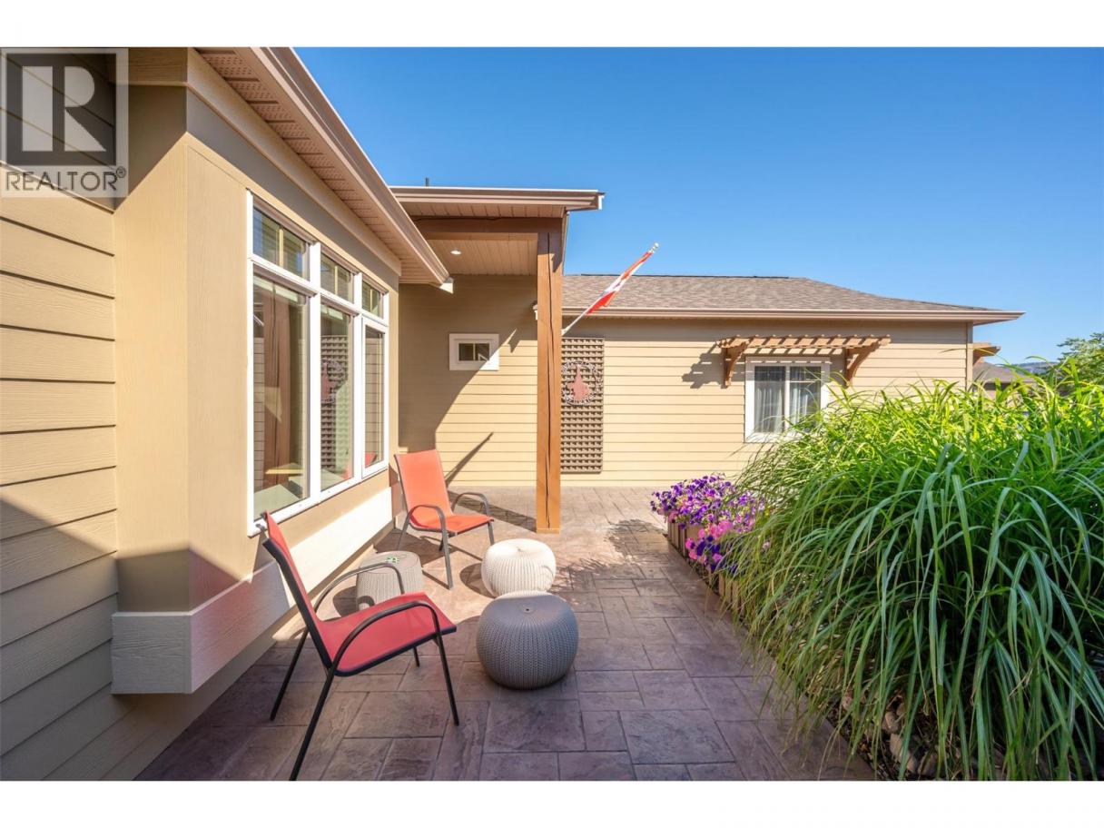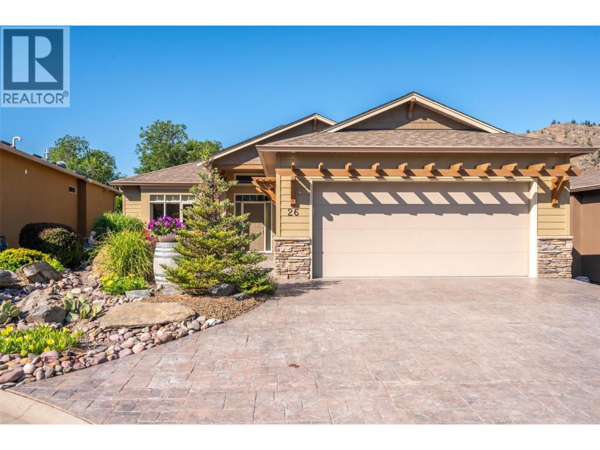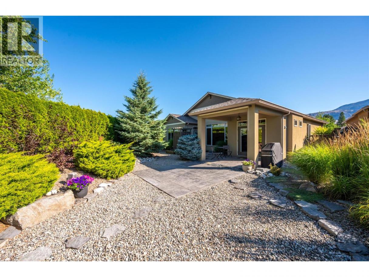 Arbour Crest is a sought-after 55+ gated community offering carefree, lock-and-leave living in a beautifully maintained setting. This stylish 2-bedroom plus den rancher features easy one-level living with vaulted ceilings and a bright, open-concept design. The kitchen boasts quartz countertops, a large island, and flows seamlessly into the dining and living areas, complete with a cozy gas fireplace—perfect for relaxed entertaining. The primary suite is a private retreat with French doors to the backyard, walk-in closet, double vanities, and walk-in shower. A flexible den offers space for a home office, TV room, or potential third bedroom, while the guest bedroom enjoys its own private wing with full bath—ideal for visitors. Outdoor lovers will enjoy the low-maintenance xeriscape landscaping including a dry riverbed feature, a spacious stamped concrete patio for outdoor living or a hot tub (wiring and pad ready to go), tasteful landscaped pie shaped lot (one of the larger lots) with private backyard. The generous driveway offers parking for multiple cars while use of the double garage for cars or storage give you plenty of flexibility. With low strata fees and a prime location just minutes from golf courses, shopping, lake access, and downtown Oliver, this move-in-ready home is perfect for active retirement living with peace of mind and convenience. (id:6769)