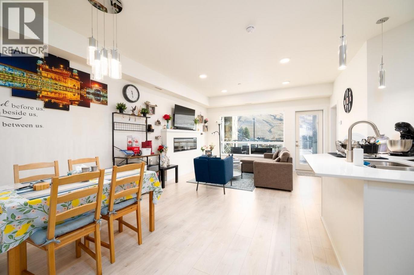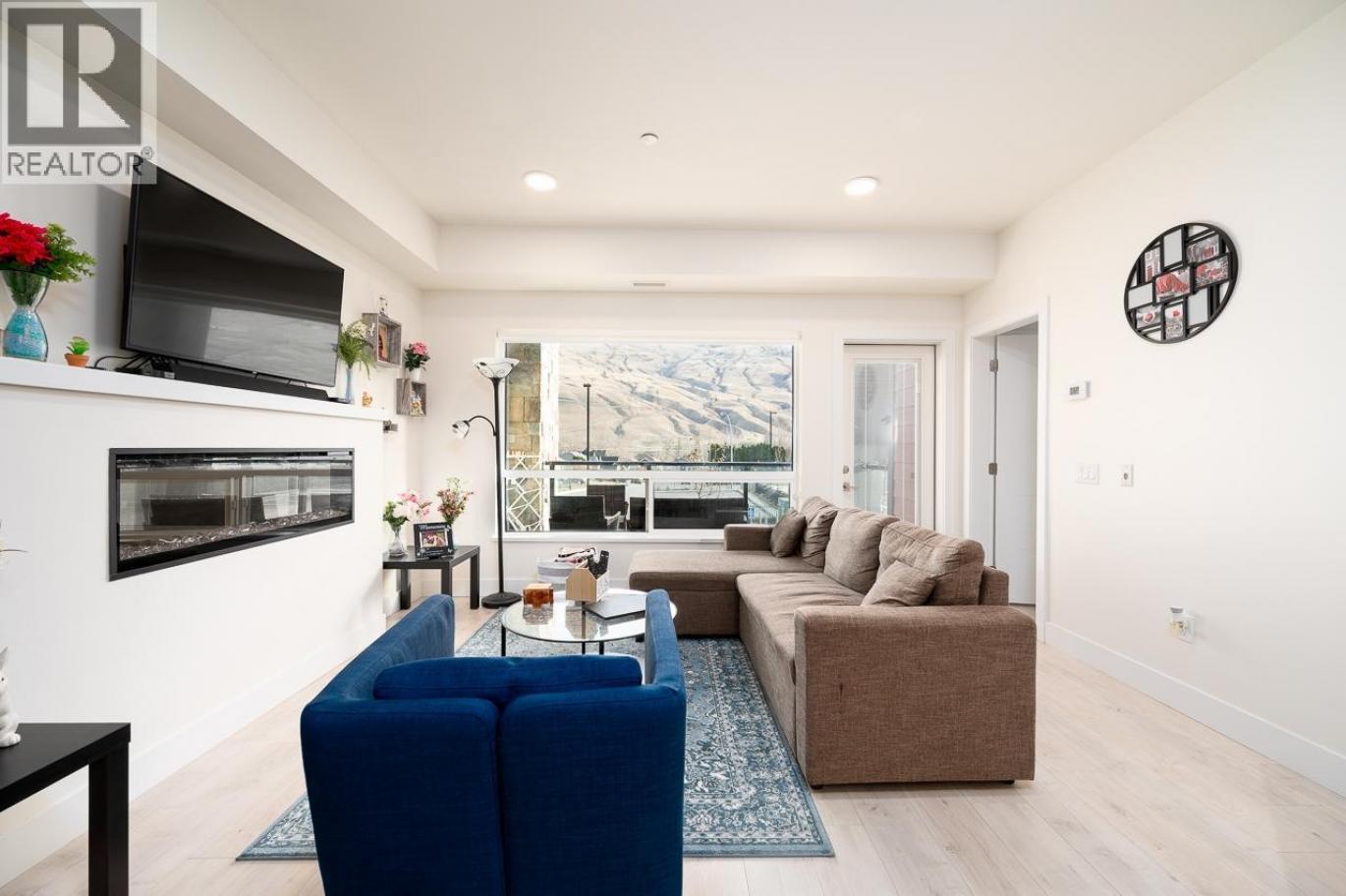 Rare opportunity to own a stunning ground-floor condo at Fairway 10, located directly on the Dunes Golf Course in Westsyde. This 1 bedroom plus den unit perfectly blends modern sophistication with a neutral color scheme and an open-concept design, the interior is built for both comfort and style. Kitchen features premium stone countertops, shaker style cabinetry, a tiled backsplash, and stainless steel appliances (including a gas range). Enjoy a cozy afternoon by the electric fireplace and relax on the impressive covered deck with unobstructed mountain views of Mt Paul. The spacious primary bedroom featuring a walk-through closet and a 4-piece ensuite bathroom with a tiled tub surround and stone vanity. The den can be used as a home office, hobby space or secondary guest bedroom. Additional features include in suite laundry and air conditioning. 1 secure parkade stall included, plus ample outdoor parking for guests. Rentals and pets are permitted, and the strata fee is $305.12 per month. Enjoy being minutes away from the Westsyde Shopping Centre, public transit, and various local amenities. (id:6769)