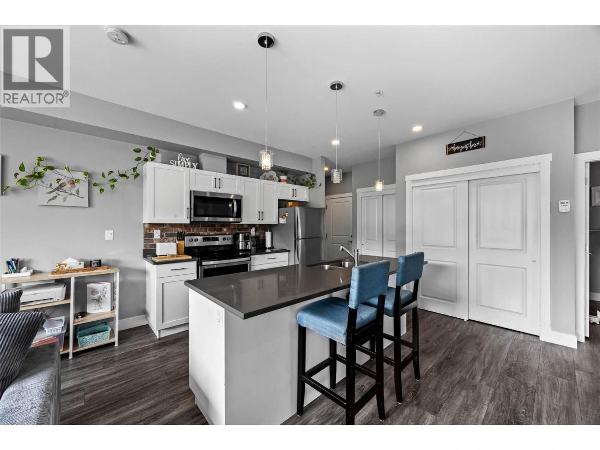 Southeast facing upper level corner unit will impress from the moment you walk in. Situated above the tree line, with incredible views, this 2 bedroom, 1 bathroom unit has an open concept feel and will make you feel at home. Freshly painted 2025 & built in 2019, this property still has 4 years remaining on the Revitalization Tax Exemption, which saves you on property taxes. In the kitchen you have a large island and a great area for cooking and gathering with friends. 2 large bedrooms with windows encasing the rooms, lots of natural light. Nicely appointed 4 pc bathroom and plenty of storage in the unit as well. The patio is 100sqft and provides plenty of space to relax and enjoy the sunsets. Above the unit is a large common area roof-top patio. The strata fees are 455.33/month, pets and rentals permitted. This unit is conveniently located close to Bright Eye Brewing, Rivers Trail, Logjam Coffer, 5 Bean Brew Bar, Kamloops Art Party, Red Beard Cafe and only minutes from the beach and MacArthur Island and TRU. This property comes with 1 secured parking space and common bike storage. Quick Possession is possible. (id:6769)