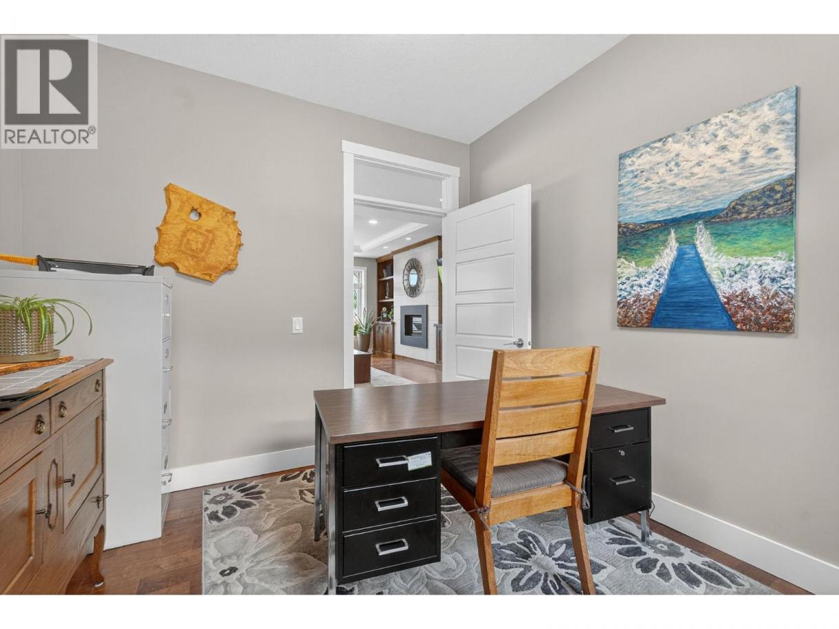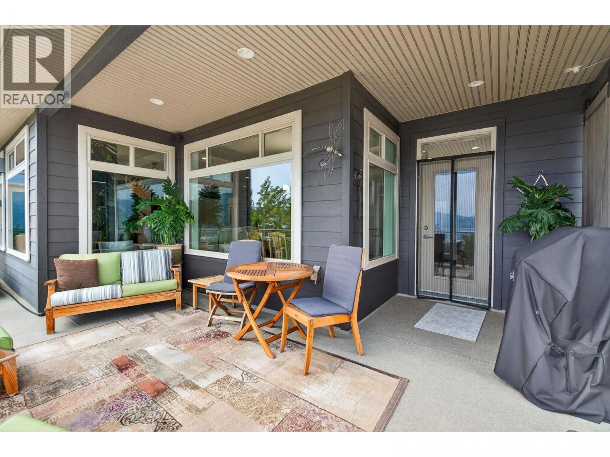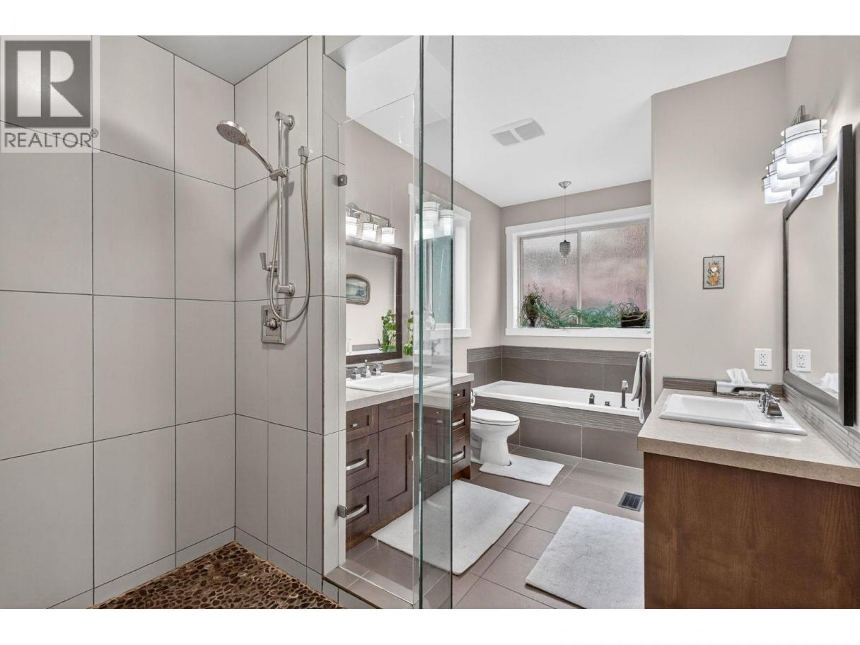 Set in a cul-de-sac, this custom craftsman home was built by an award-winning builder. This 4 bedroom + den walk-out rancher offers lake and mountain views and a layout that works for everyday living. You’ll notice attention to detail and a plan that takes full advantage of its surroundings while maintaining privacy. The main floor is bright and open, with expansive windows framing the view and filling the space with natural light. The living room with tray ceiling is anchored by a gas fireplace with built-in solid wood cabinetry and flows into the dining area and kitchen. The kitchen is functional and inviting, featuring a gas range, generous storage, granite countertops, a large sit-up island, and a sink positioned to enjoy the scenery. Step outside to the upper deck to relax, entertain, or take in nature. The primary bedroom offers a private escape with direct deck access, walk-in custom closet system, and an ensuite with dual sinks, a soaker tub, and a separate shower. There is also an office and large laundry room for one-level living convenience. The lower level is ideal for teens, guests, or extended family, with two additional bedrooms (potential for a third), a full bathroom, and a flexible bonus room under the suspended slab garage—perfect for a gym, games room, or studio. The outdoor living sets this home apart. The landscaped yard features multiple seating areas, including a front patio and a deck with stairs to the tiered backyard designed for privacy and enjoyment. Highlights include barn doors for privacy, an infinity hot tub, and an outdoor shower, all positioned to make the most of sun and the views. There’s also boat or RV parking along the side of the home. Located minutes from Peachland, nearby beaches, and West Kelowna amenities, this property delivers space, views, and lifestyle in one package. (id:6769)