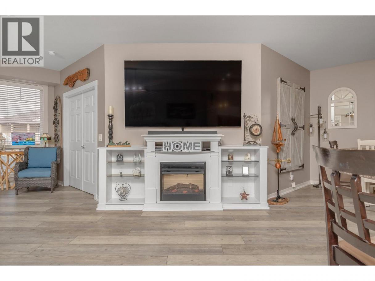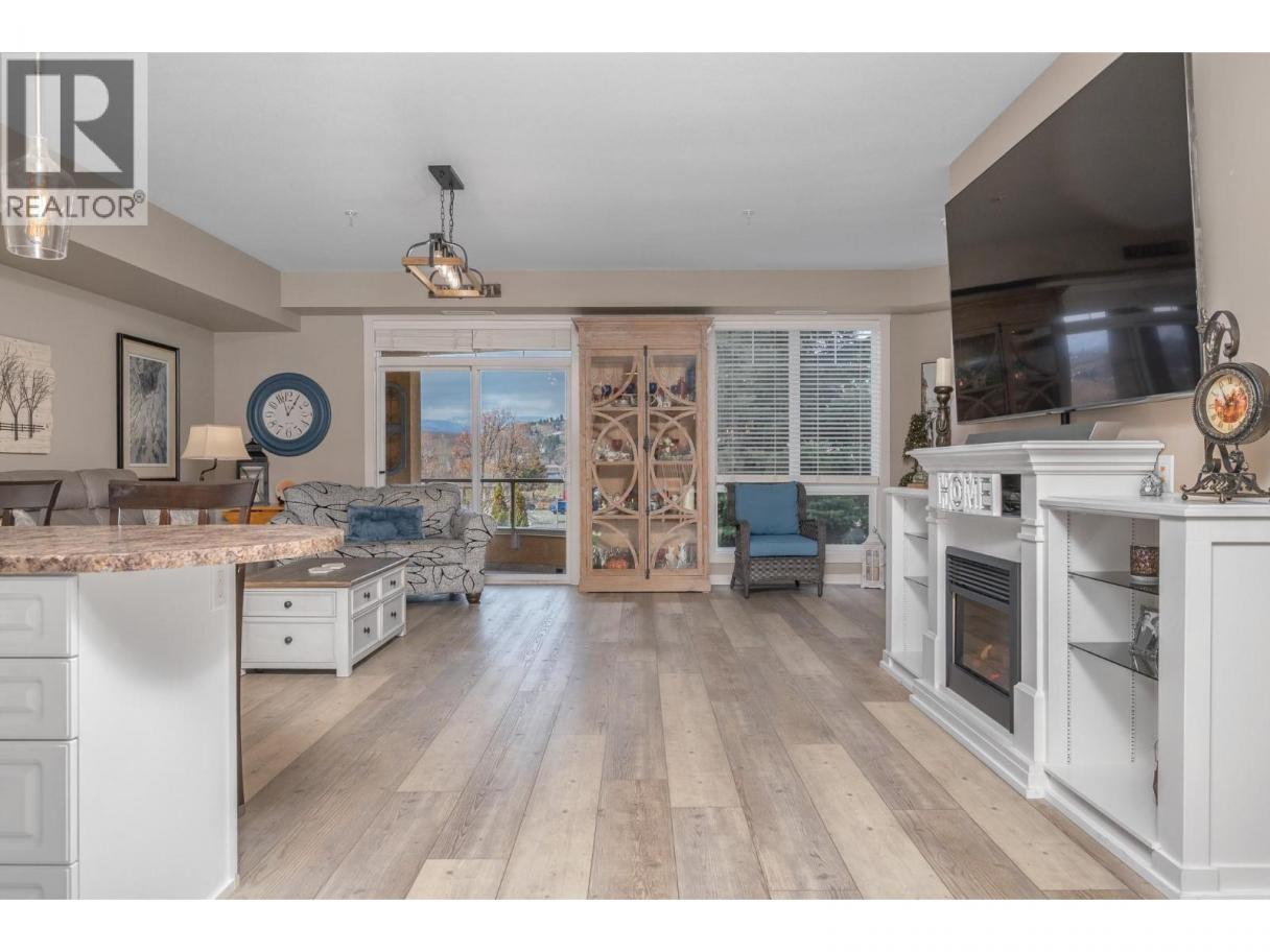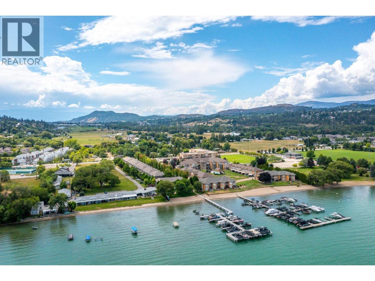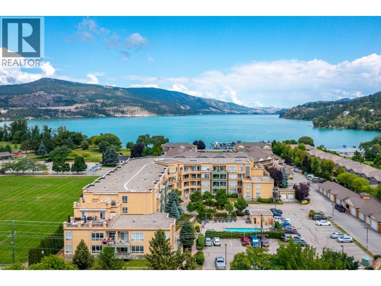 Enjoy resort-style living in this spacious 1,359 sq. ft., 2-bedroom, 2-bathroom condo at the sought-after Emerald Point community. Located on the second floor and facing northwest towards Wood Lake, this beautifully maintained home offers breathtaking sunset views and an unbeatable location. The open-concept layout features 9’ ceilings and floor-to-ceiling windows, flooding the space with natural light. The generous primary bedroom easily accommodates a king-size bed and includes a walk-in closet with custom built-ins and a full ensuite. The second bedroom is equally spacious with a double closet and built-ins—perfect for guests or a home office. The kitchen boasts stainless steel appliances, including a new over-the-range microwave/convection oven, providing the convenience of two ovens for entertaining. Rigid engineered luxury vinyl plank flooring (2021), an electric fireplace with built-ins and under-cabinet lighting, and extensive closet organizers throughout. Additional highlights include: Geothermal heating and central air conditioning with a new heat pump (2021)/Large laundry/utility room with new stackable washer & dryer (2023)/New hot water tank (2024) and new refrigerator (2023)/ . Enjoy the heated outdoor pool and hot tub, exercise room, dry sauna, and a social room with a full kitchen and large patio, ideal for gatherings. With no age restrictions, pet-friendly policies, and proximity to the airport, UBCO, and shopping ,this one has it all! (id:6769)