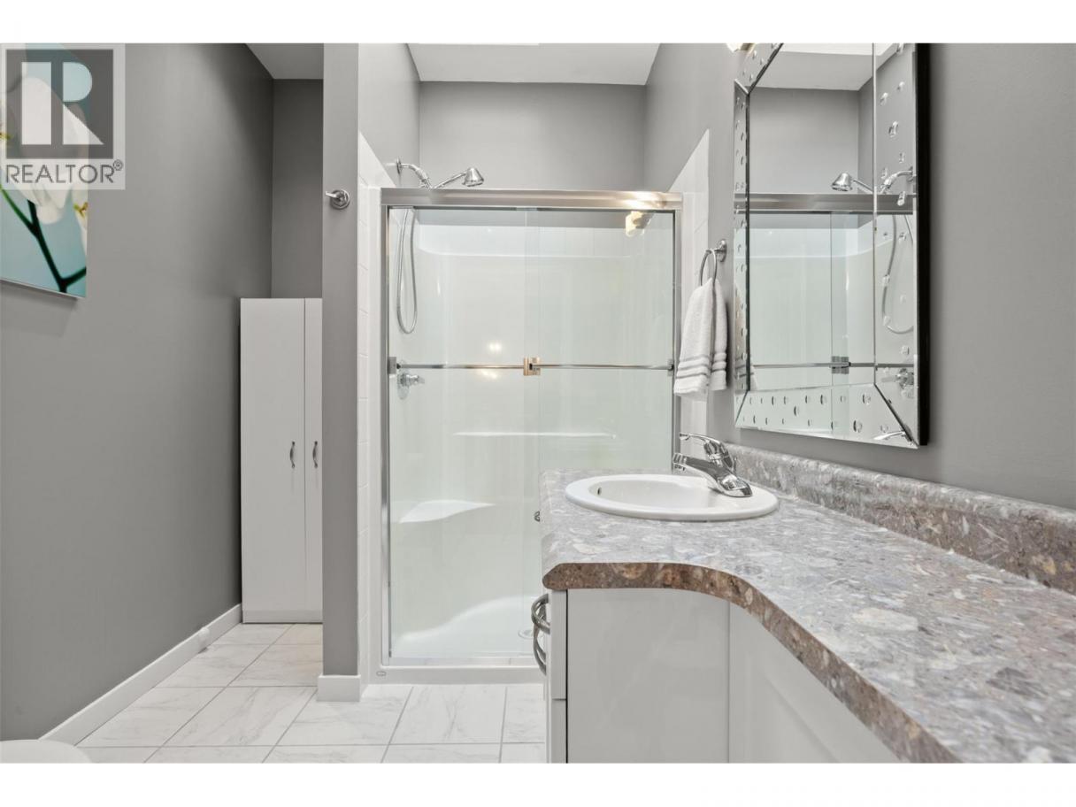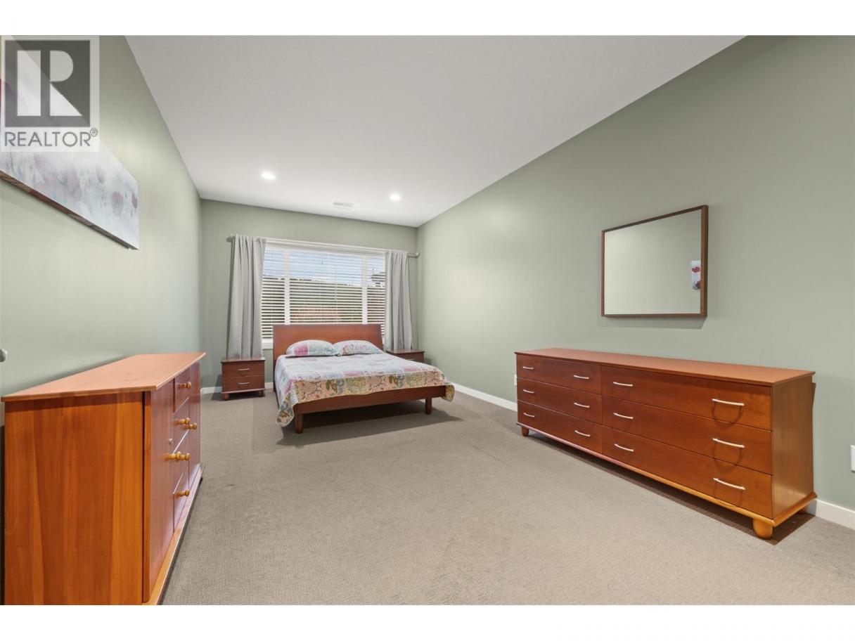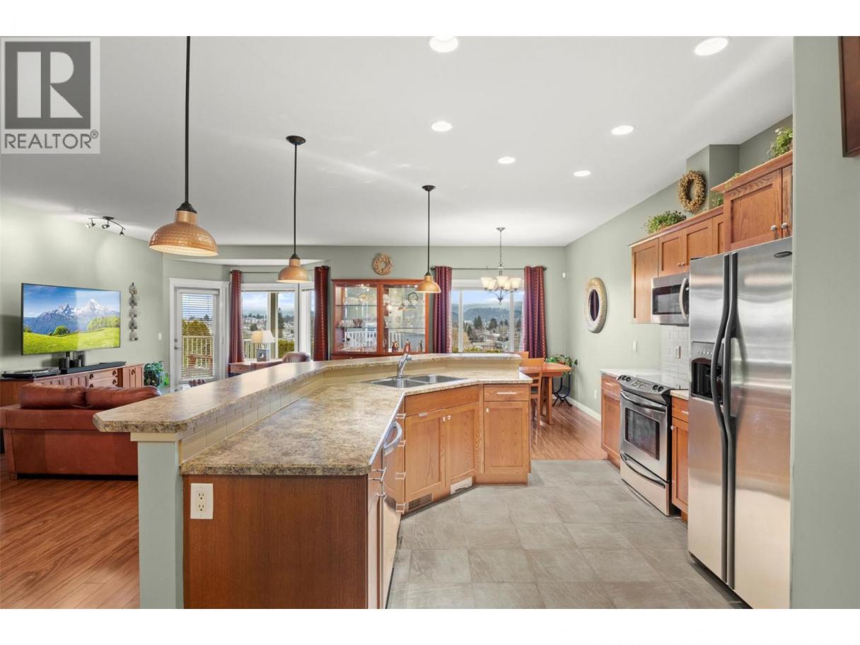 Walkout rancher half-duplex in The Ridge offering mountain views and a spacious 2,700+ sq ft layout with 4 bedrooms, 3 bathrooms, and potential for a 5th bedroom. Flat driveway parking for two plus an oversized double garage with an 18’ door. The open-concept main level features a bright kitchen, dining, and living area that opens to a covered view deck with gas BBQ hookup. The main floor also includes a primary suite with ensuite and walk-in closet, a guest bedroom or office, full bath, pantry and laundry. The fully finished walkout level offers generous family and recreation space, an additional guest bedroom, full bath, office/den, and a private patio with landscaped yard. Pet-friendly (2 pets: one dog + one cat, or two dogs or two cats - no size restrictions), no age restrictions, and quick possession available. Ideally located within 400 m of transit and under 1 km to schools, the YMCA, shopping, parks, trails, and the Big White shuttle, with easy access to UBCO and the airport. (id:6769)