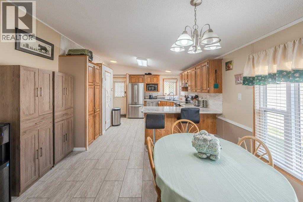 Welcome to perfect retirement living in Country Lodge! This large home boasts a spacious open layout featuring 3 bedrooms, 2 full bathrooms & laundry area. The vaulted ceiling adds to the grandeur of the living area & makes it feel even more spacious. You will love the bright & airy feel of this home, which is filled with natural light. The large kitchen is perfect for whipping up your favorite meals & features plenty of counter space & storage for all your cooking needs. Stainless steel appliances with newer fridge, beautiful stone backsplash & deep corner sink. Flooring is a mix of tile, laminate & hardwood in the main bedroom. Generous sized bedrooms, and primary bedroom has the convenience of a 4-piece ensuite. Large laundry room with new washer & dryer and room for a small freezer. Added features include a new A/C unit and upgraded metal roof. Enjoy your morning coffee or watch the sunset from the covered front porch, enclosed for a pet but can be opened up to enhance your view. The low maintenance yard is perfect for those who want to enjoy outdoor living without extensive upkeep. Two outdoor storage sheds included. Electrical inspection completed for peace of mind. Country Lodge welcomes age 55+ and one small indoor pet. Owner occupied only, no rentals permitted. Pad rent is only $500/mth and includes sewer, water & garbage. Located close to recreation, golf, wineries, shopping & town amenities. Make your move to affordable living in the beautiful South Okanagan! (id:6769)