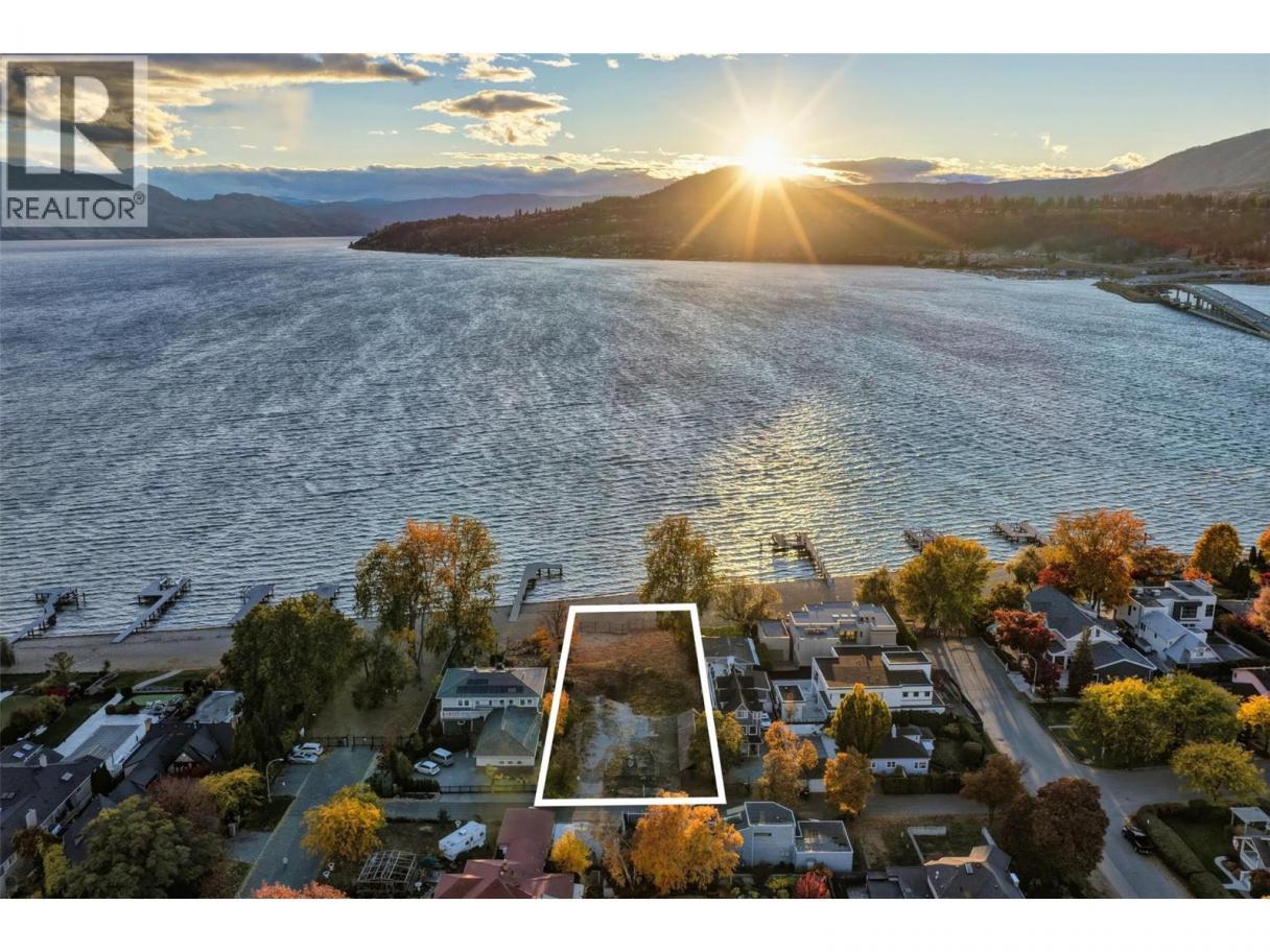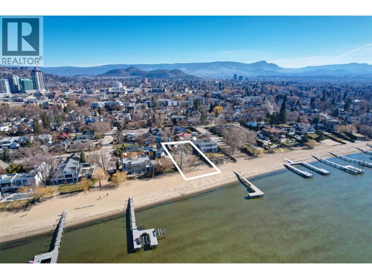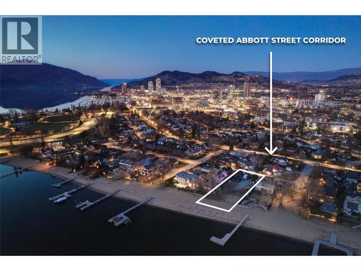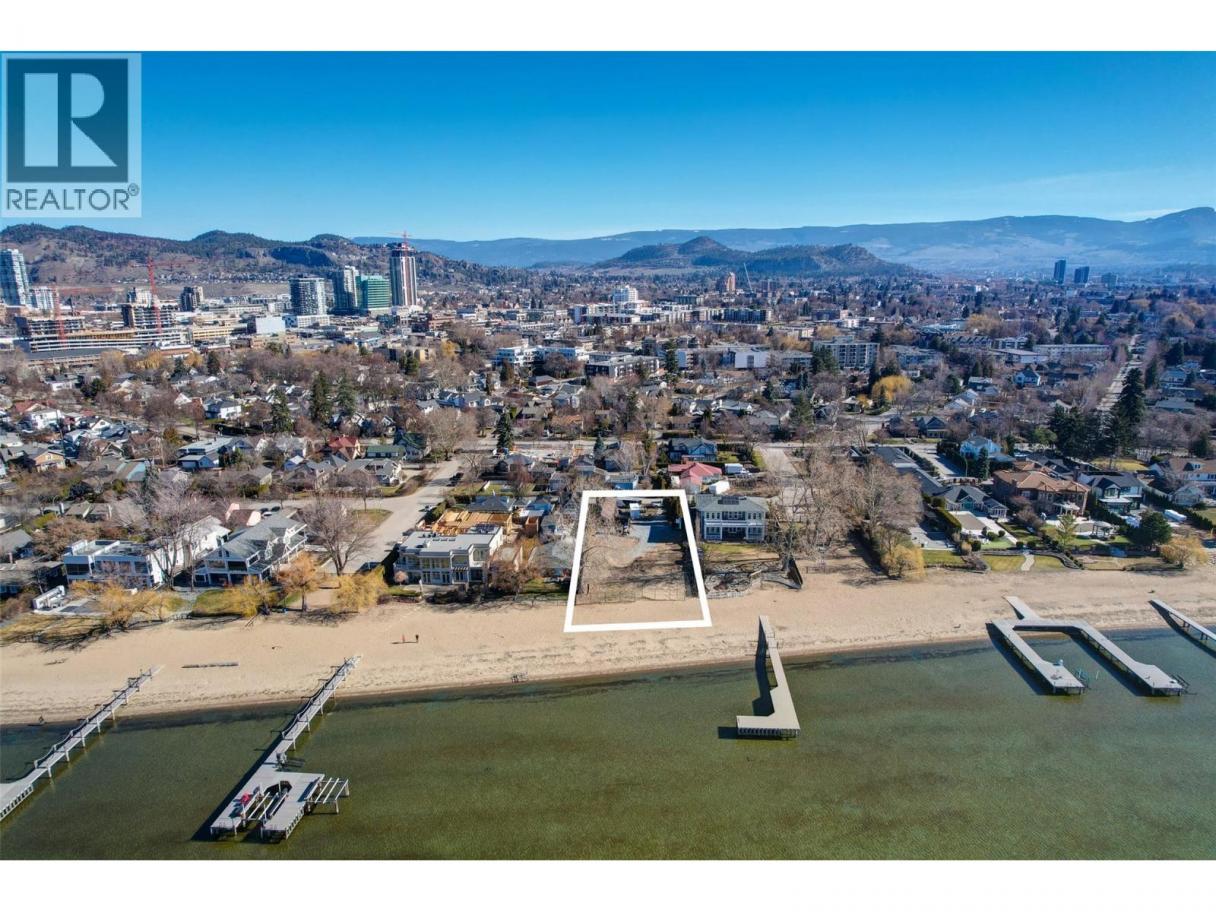 One of Kelowna's most desirable lakeshore properties, on Okanagan Lake, this rare 0.44-acre vacant lakeshore lot is nestled in one of Kelowna’s most prestigious iconic neighborhoods secluded just off the coveted Abbott Street corridor. This 19,000+ sq ft parcel is a vacant blank canvas to build your vision for your family’s legacy dream home. With almost 88 feet of level, expansive natural sand beach, an unobstructed South-West exposure, you can enjoy stunning sunsets and direct access to the crystal waters of Okanagan Lake. This wide lot provides ample room for a large dock, accommodating multiple boats, entertaining guests, swimming, and beach activities. Perfect for lakeside entertainment! Whether you envision a luxurious private estate with historic architecture or a modern contemporary masterpiece – the possibilities are endless! Ideally located just a short stroll to Kelowna’s City Park and vibrant downtown core - boutique shopping, galleries, casual and fine dining, cultural districts, and Kelowna General Hospital. Proximity to World-class wineries, orchards, golf courses, the University of British Columbia Okanagan, and Kelowna International Airport. This iconic property offers a rare fusion of lakeside serenity and convenience blending natural beauty with a vibrant four-season lifestyle in the heart of the Okanagan Valley. The property may allow for up to four dwellings under the new Provincial density regulations and is free from Canada’s foreign buyer ban. (id:6769)