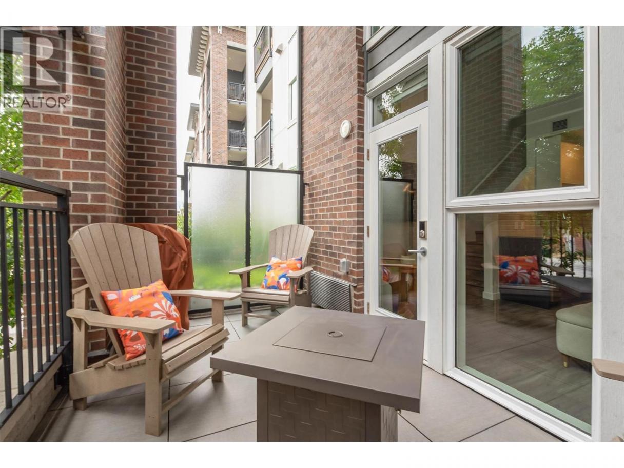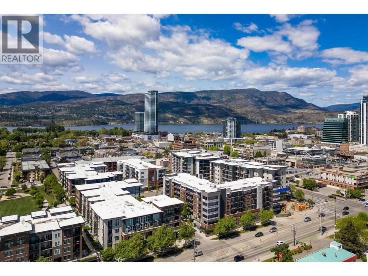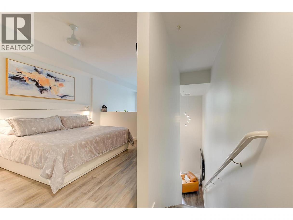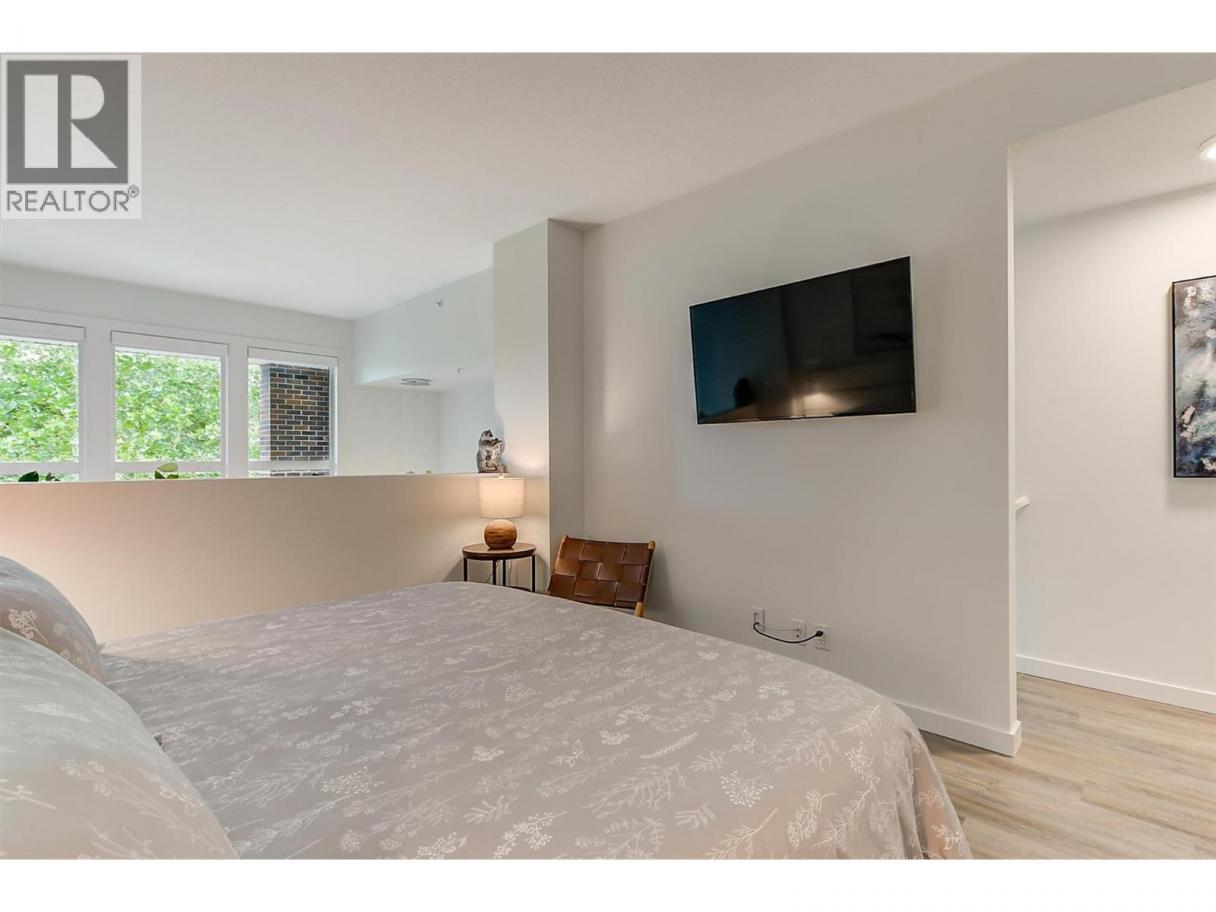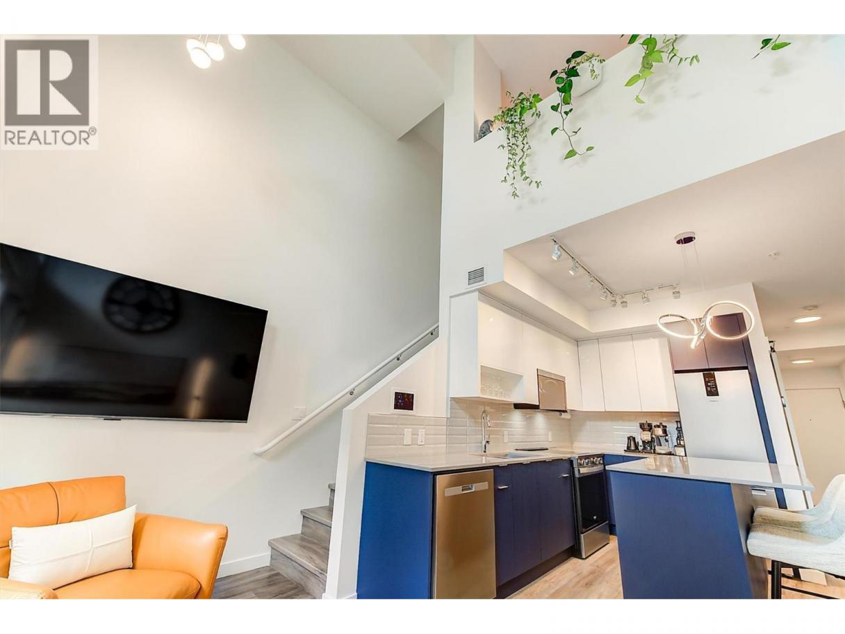 Bright, Urban Chic Loft-style condo at Central Green! This 2-bedroom, 2-bathroom home offers entrances to both levels with towering 18 ft ceilings and impressive oversized floor to ceiling windows allowing the natural light to flood your living space. The open layout showcases a sleek kitchen with contemporary dual tone cabinetry, Upgraded Stainless Steel appliance package, light quartz countertops, a moveable island workstation, all flowing into a cool, luxe living area with elegant modern lighting. Durable, great looking & easy care Luxury Vinyl plank is found throughout, perfect for entertaining & ideal for pets ( 2 dogs, 2 cats or 1 of each allowed - no size restriction here). Find an east-facing terrace with a beautiful brick facade and black accented frosted glass privacy panels to enjoy your morning coffee as the sun rises or enjoying a fresh Okanagan evening. The Lofted primary bedroom overlooks the main living area below, offering ample closet space, a 3pc ensuite bath & laundry. The main floor 2nd bedroom is ideal for guests, crafts, a home office, or a studio. Practical perks include a secure Underground parking stall, plus a convenient, same floor storage locker. Central Green is situated beside the pristine Rowcliffe Park with running loop, playground, and beautiful green space. THIS is all in walking distance to beaches, schools, shopping, dining, and Kelowna’s vibrant downtown easily accessible via the Bertram Pathway & Multiuse Overpass & transit is out front! (id:6769)
