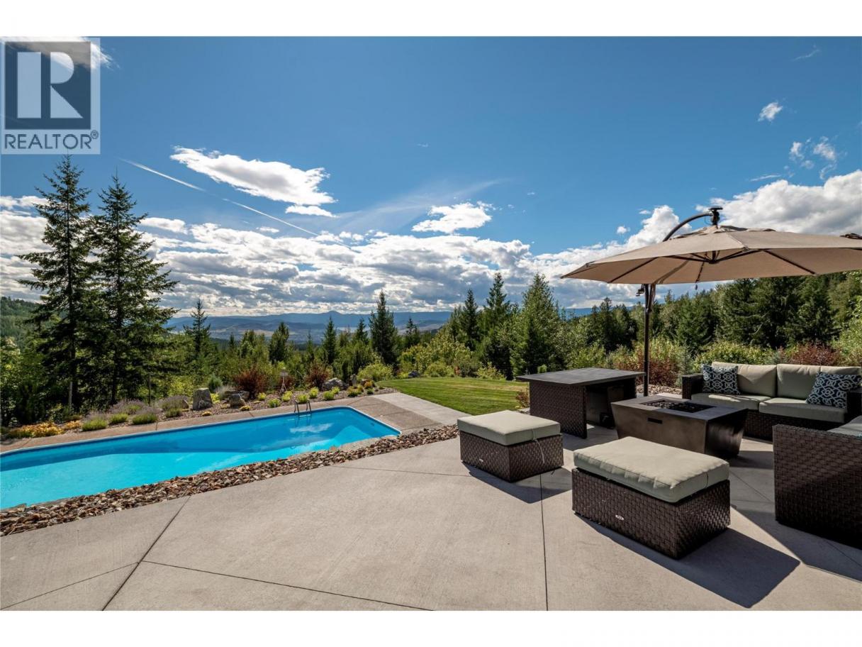 Welcome to this ultra-private, pristine 40-acre Okanagan luxurious estate featuring two homes and exceptional amenities! The fully renovated 5,995 sq ft main residence (4 bed/5 bath) by Bercum Builders offers unrivaled timeless craftsmanship with incredible views of both the pool and lakes below. Perched nearby yet secluded in itself the equally stunning yet smaller 1,431 sq ft legal carriage house (2 bed/2 bath) also has been renovated with perfection mirroring the same modern elegance throughout much like the primary home. Soak in the panoramic views and secluded heated swimming pool with 3,000 sq ft of concrete patio or drift away in the hot tub under the stars. Added amenities include an oversized heated shop , equipment storage, and a fully equipped equestrian barn with hay storage and cross-fenced paddocks. Revel in 180° lake and city views, relax in the home theatre, or entertain in style—this property balances sophistication with smart functionality. Interior features include heated floors, smart home tech, fire mitigation system, exquisite wood finishes, upgraded electrical, and more. Outside, find a private well, cistern, diesel generator, stunning water feature, low-maintenance landscaping, and mature cedar forest. Non-ALR zoning offers potential for future development. Perfectly located between Vernon and Silver Star Resort for quick access to recreation and amenities. A rare opportunity to own an unparalleled mountain retreat—schedule your viewing today! (id:6769)