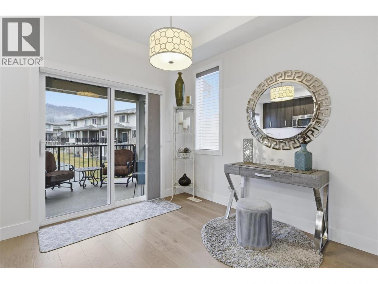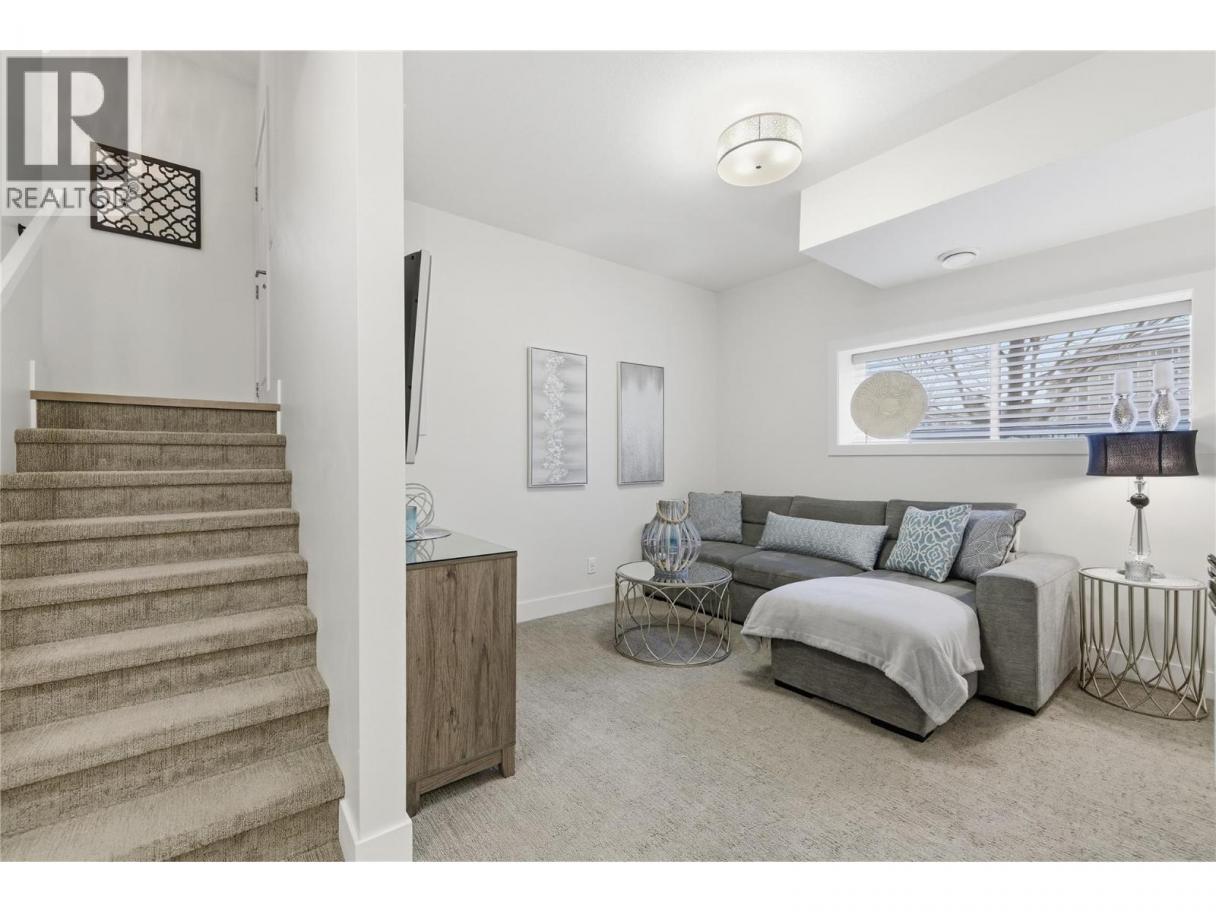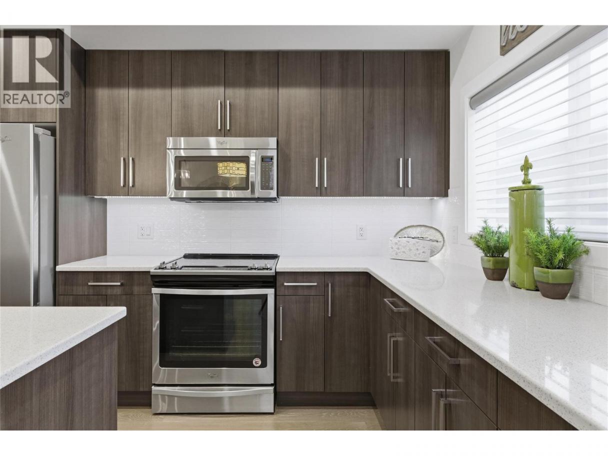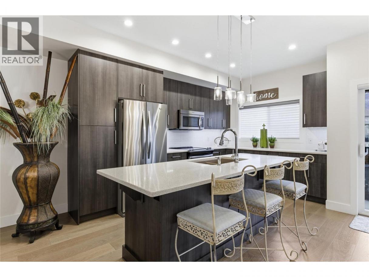 Bright and beautiful corner unit in the highly sought-after Grove development, offering modern lifestyle living in the heart of Glenmore. This like-new 3-bedroom, 4-bath townhome with a finished lower-level flex space is one of the largest units in the complex, blending comfort and style while being flooded with natural light throughout. High-end finishes include wide-plank engineered hardwood floors, high ceilings, and European-tiled bathrooms with luxurious fixtures. The open-concept main level showcases a chef’s kitchen with soft-close cabinetry, oversized island, quartz countertops, stainless steel appliances, and an electric fireplace in the living room. Two distinct outdoor living spaces enhance the home’s appeal: a covered deck off the kitchen—perfect for morning coffee—and a walk-up front patio ideal for entertaining. A heated double car garage and low strata fees add to the convenience. The finished lower-level flex space includes a full 4-piece bathroom and large walk-in closet, offering versatile options for guests, family, or work-from-home needs. Centrally located just steps to shopping, restaurants, Brandt’s Creek Linear Park, hiking trails, and the new Glenmore Recreation Park with skateboard park, pickleball courts, sports fields, and more. Close to Dr. Knox Middle School and three elementary schools. Don’t miss this opportunity for high-end, convenient Okanagan lifestyle living for the whole family. (id:6769)