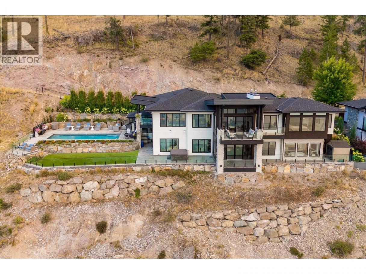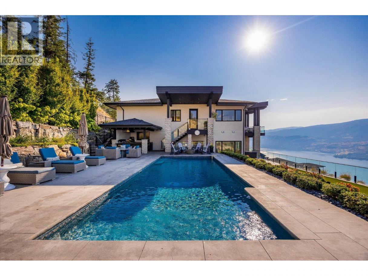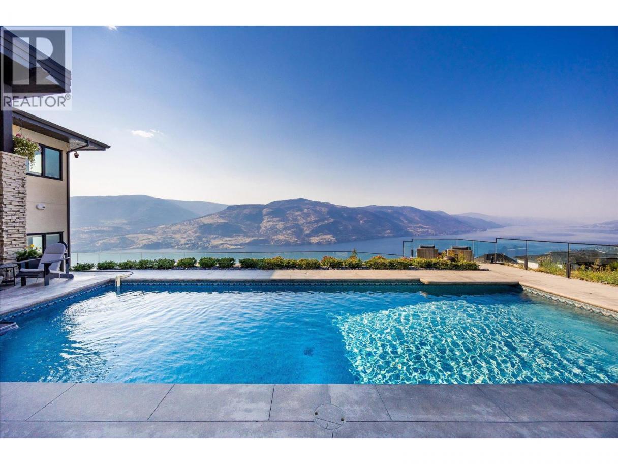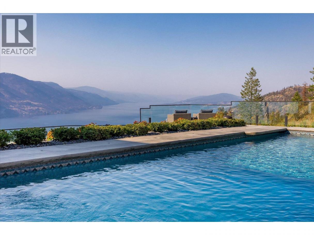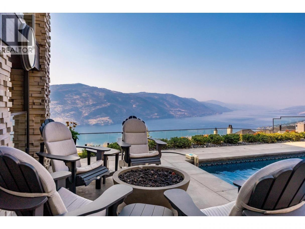 NEW PRICE!! Located in one of Kelowna’s most desirable neighborhoods, this property captures 180-degree panoramic views of the lake and mountains. Set on a quiet cul-de-sac, it offers rare privacy while remaining just minutes from downtown, wineries, golf, restaurants, and all the best of Okanagan living. The open-concept main level seamlessly connects indoor and outdoor living. A chef’s kitchen, designed by Carolyn Walsh, features a Thermador six burner range, two panelled fridges and dishwashers, a panelled freezer along with a striking two-tone island. A new working pantry and custom wine room elevate the home’s entertaining potential. Two primary suites provide private retreats with spectacular lake views. The main-level suite includes a fireplace sitting area and spa-inspired ensuite with a curbless steam shower. The lower-level suite mirrors the same luxury finishes, offering flexibility for guests or family. Designed for entertaining, the lower level also boasts a twelve seat theatre, wet bar, and recreation space, with a separate entrance for guests. Lower level radiant in-floor heating keeps every space warm and inviting. Resort-style outdoor living awaits with a saltwater pool, pool bath, artificial turf yard, and an outdoor kitchen - ideal for summer gatherings. Combining luxury, functionality, and effortless living, this home also grants direct access to Knox Mountain Park and Kelowna’s outdoor lifestyle. With its privacy and breathtaking views, this property delivers the quintessential Okanagan experience. (id:6769)