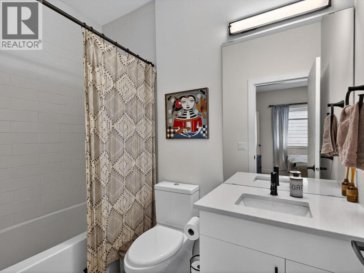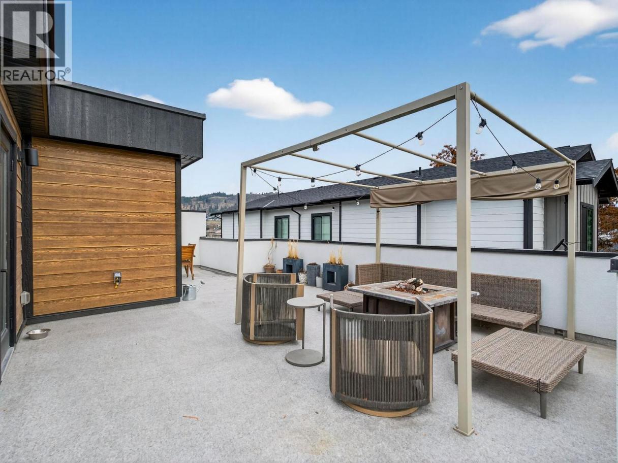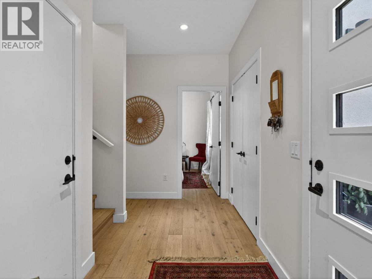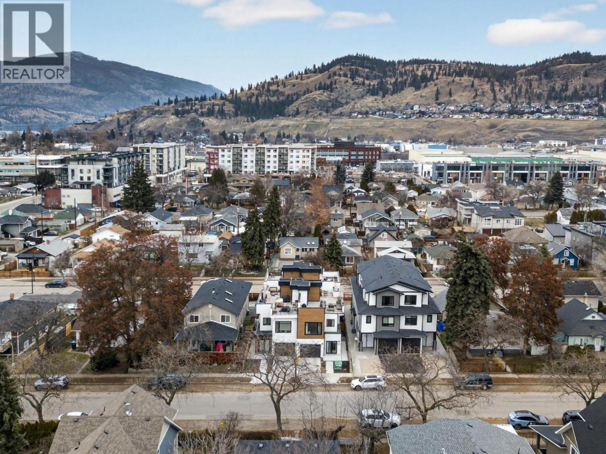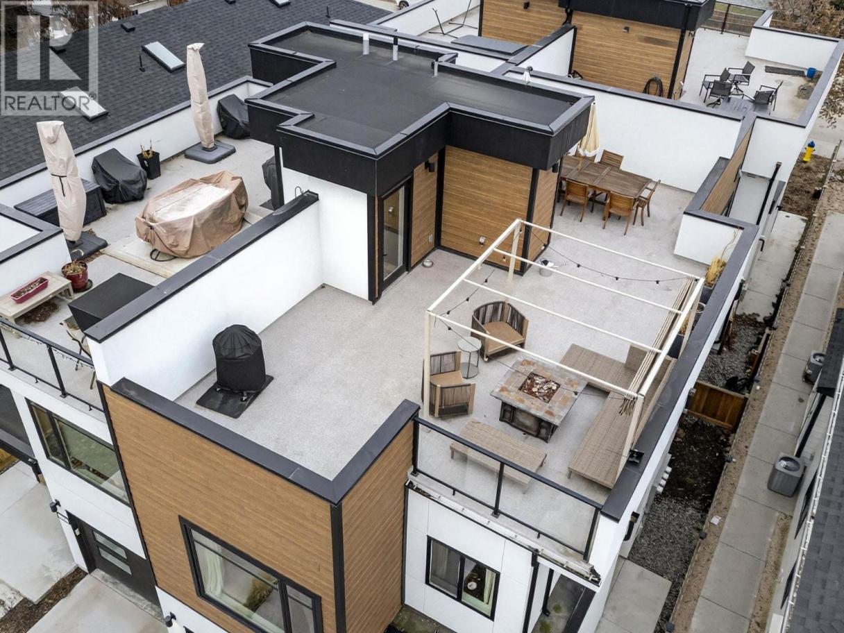 Set on a quiet, treelined street just steps from the downtown core, this modern townhome offers outstanding walkability to the waterfront, restaurants, coffee shops, and everyday conveniences. The main level features a welcoming entry with generous storage, a full bathroom, a bedroom, and a separate flex space that works well as a home office, gym, or another bedroom. This level also includes an attached garage with direct street access, plus an additional driveway parking space. A crawl space provides valuable extra storage, a rare bonus for townhome living. The second level is bright and well laid out, offering an open concept living and dining area designed for both everyday comfort and entertaining. The modern kitchen features clean lines, a gas range, and a large island with seating for four. Hardwood flooring runs throughout the home, with no carpet. A spacious bedroom, full bathroom, and in unit laundry complete this level. The top level is dedicated to outdoor living, highlighted by an expansive private rooftop deck. With plenty of room for entertaining or relaxing, the deck offers beautiful views toward Knox Mountain and is ideal for enjoying Okanagan summers. The building is self-managed, keeping strata fees very low, and water is included. In short, this is a well designed, low maintenance home, offering quiet surroundings with unbeatable access to the city. (id:6769)