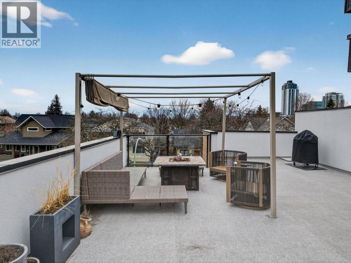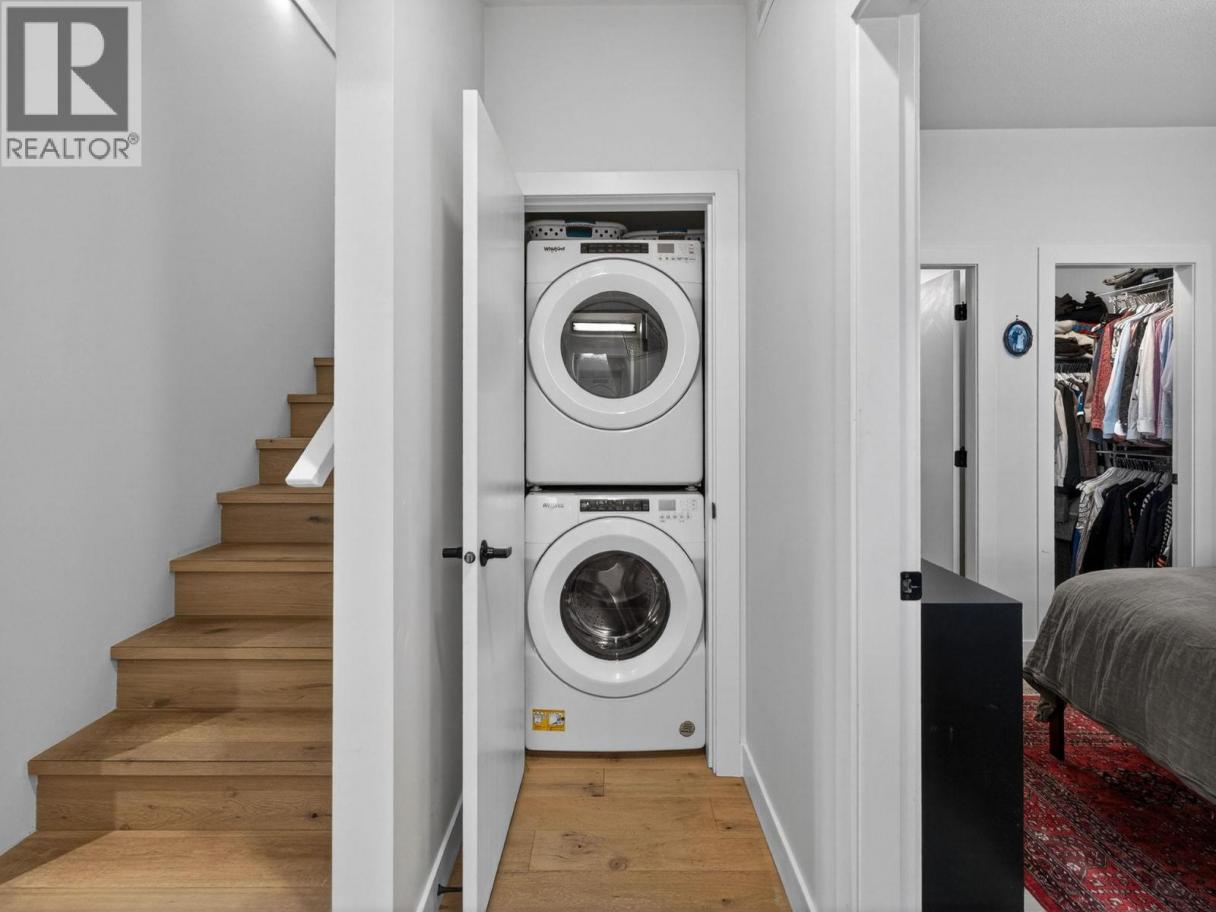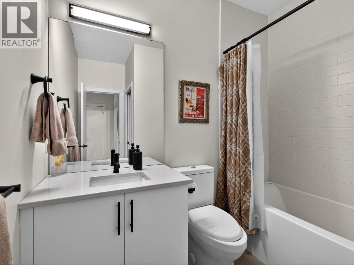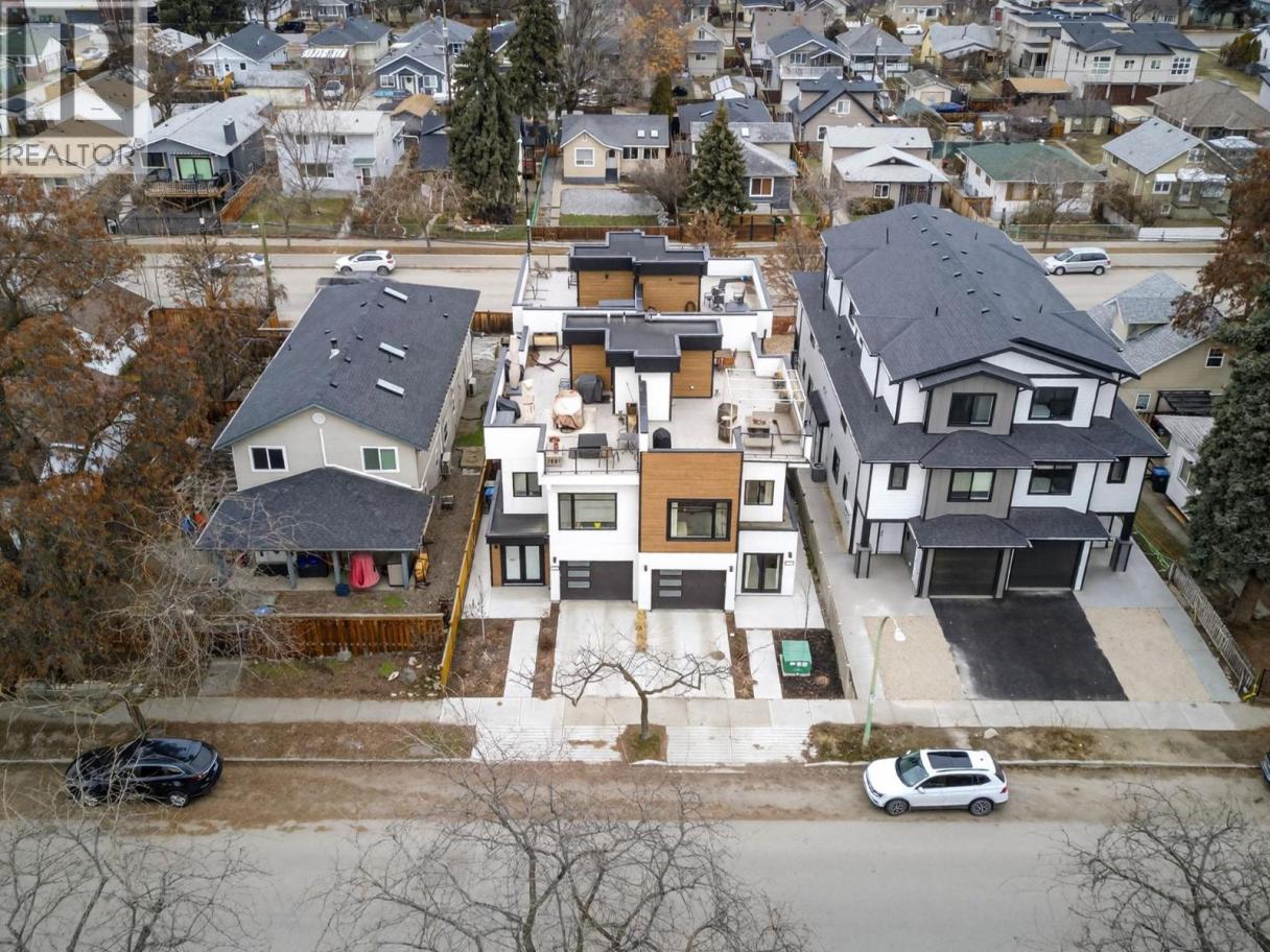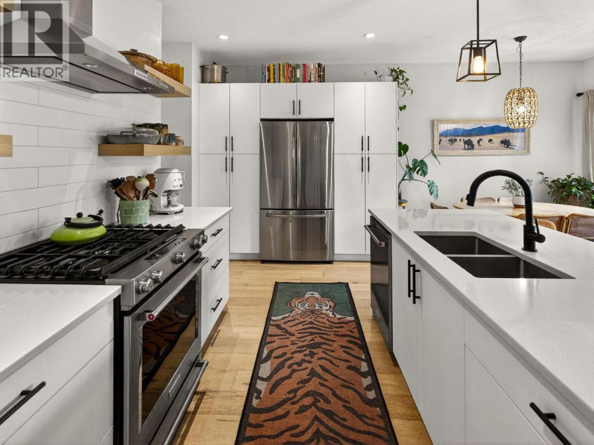 Set on a quiet, treelined street just steps from the downtown core, this modern townhome offers outstanding walkability to the waterfront, restaurants, coffee shops, and everyday conveniences. The main level features a welcoming entry with generous storage, a full bathroom, a bedroom, and a separate flex space that works well as a home office, gym, or another bedroom. This level also includes an attached garage with direct street access, plus an additional driveway parking space. A crawl space provides valuable extra storage, a rare bonus for townhome living. The second level is bright and well laid out, offering an open concept living and dining area designed for both everyday comfort and entertaining. The modern kitchen features clean lines, a gas range, and a large island with seating for four. Hardwood flooring runs throughout the home, with no carpet. A spacious bedroom, full bathroom, and in unit laundry complete this level. The top level is dedicated to outdoor living, highlighted by an expansive private rooftop deck. With plenty of room for entertaining or relaxing, the deck offers beautiful views toward Knox Mountain and is ideal for enjoying Okanagan summers. The building is self-managed, keeping strata fees very low, and water is included. In short, this is a well designed, low maintenance home, offering quiet surroundings with unbeatable access to the city. (id:6769)