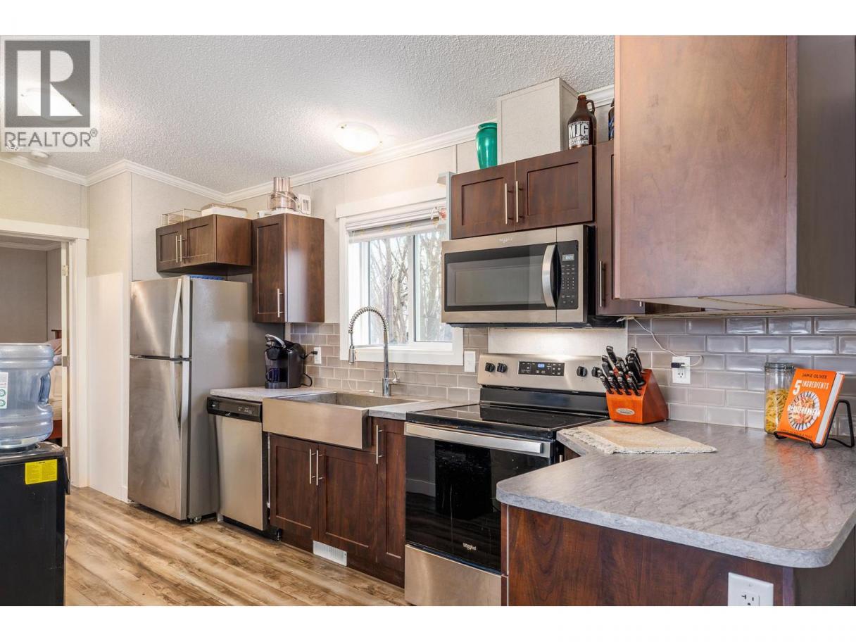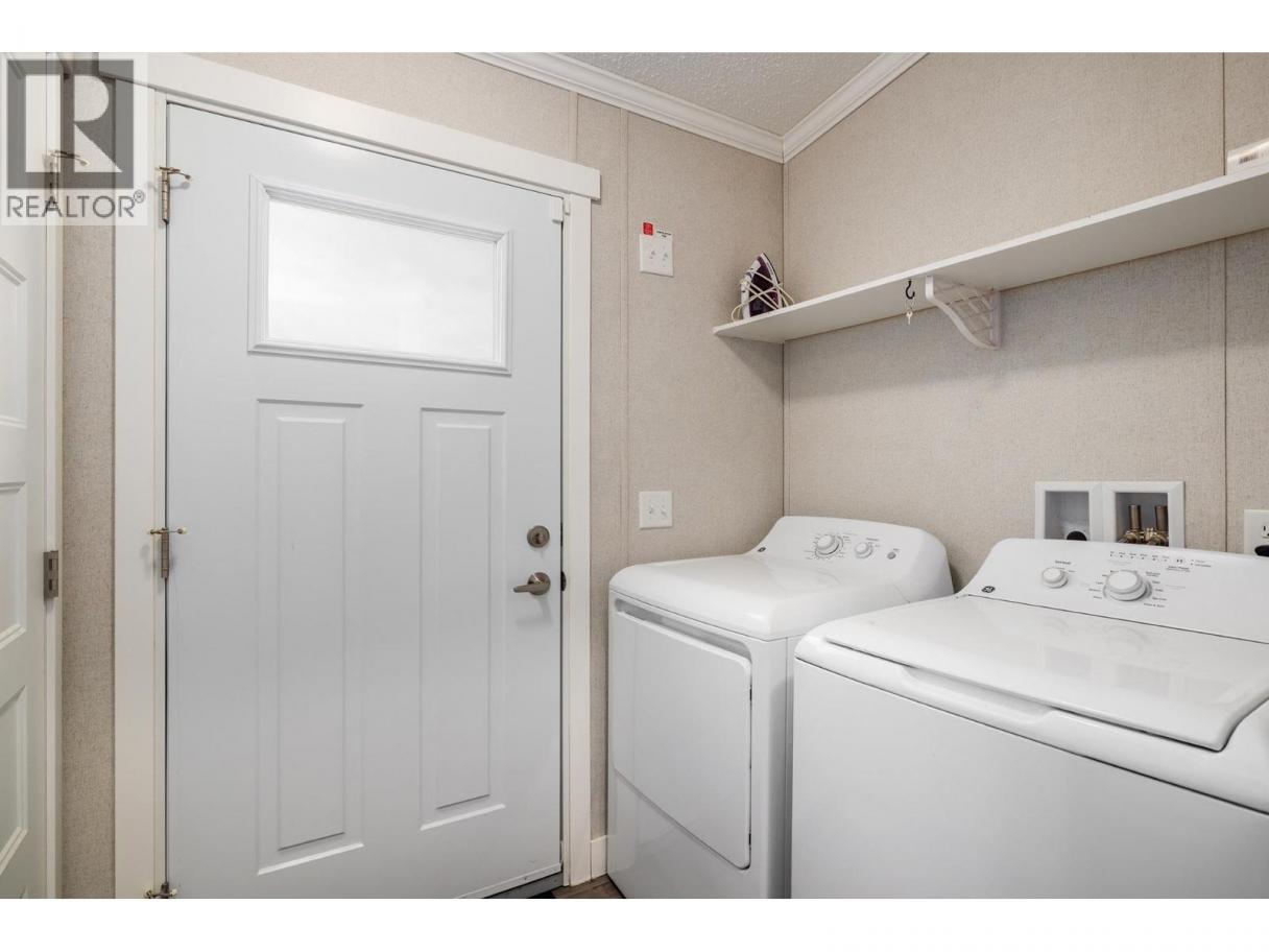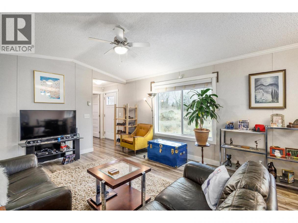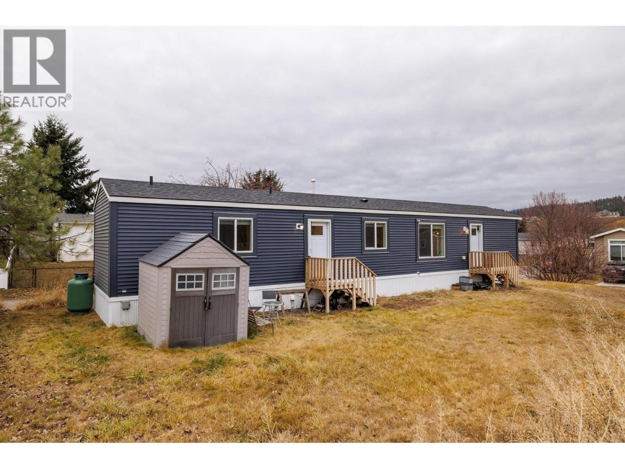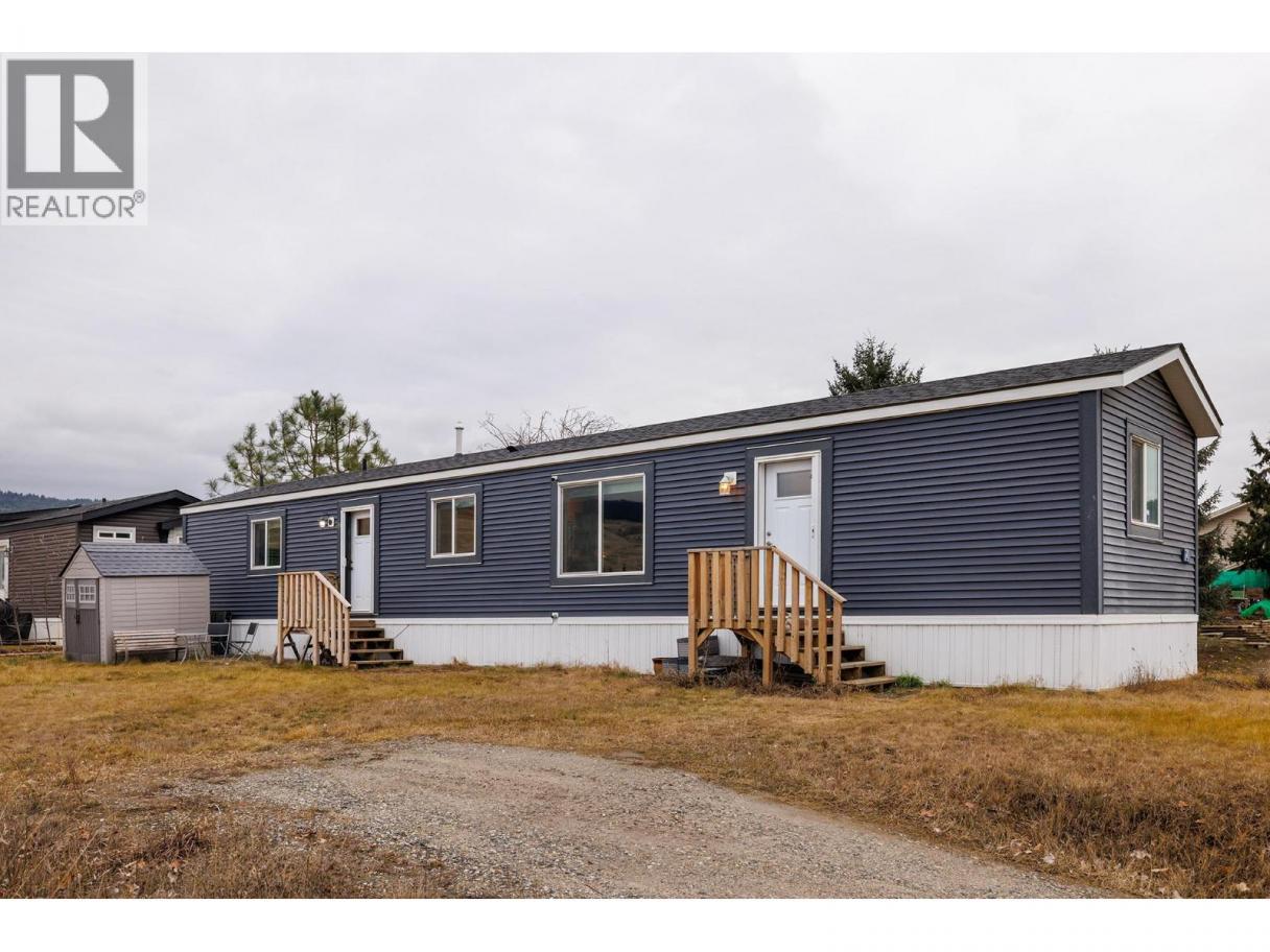 Stylish, modern living at Duck Lake Estates! Built in 2021, this beautiful 905 sq. ft. manufactured home offers 2 bedrooms and 2 bathrooms in a bright, open-concept layout. Cathedral ceilings enhance the spacious feel, while the thoughtfully designed floor plan places the bedrooms at opposite ends for optimal privacy. The stylish kitchen is the heart of the home, equipped with stainless steel appliances, an over-sized farm house sink, and ample work space. The primary bedroom includes a walk-in closet and a private ensuite with 5-ft walk-in shower. A convenient laundry/mud room provides exterior access in addition to the main front entry. Situated on a generous lot looking out over green space, this property includes a 7’x7’ shed and ample space to potentially add a carport or garage. Conveniently located just steps to the Okanagan Rail Trail - and minutes from the airport, UBCO, shopping, restaurants, and lakes. Two pets are permitted (no size restrictions). A perfect blend of comfort, style, and location, this home is move-in ready and waiting to welcome its next owners—book your private showing today. (id:6769)