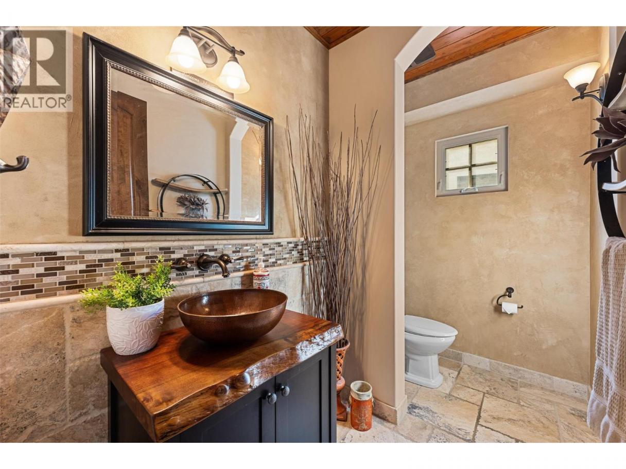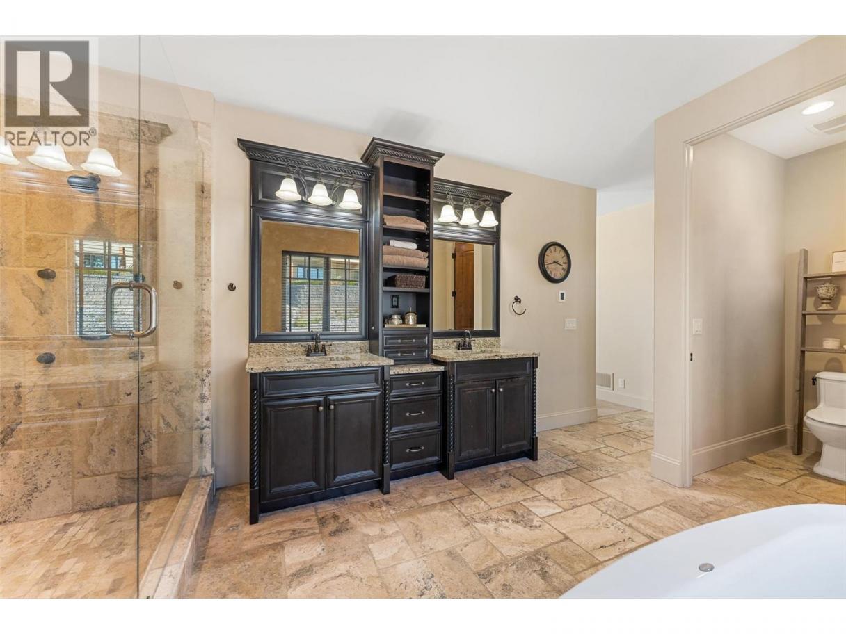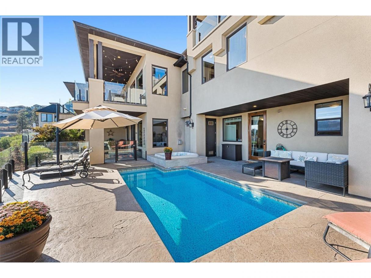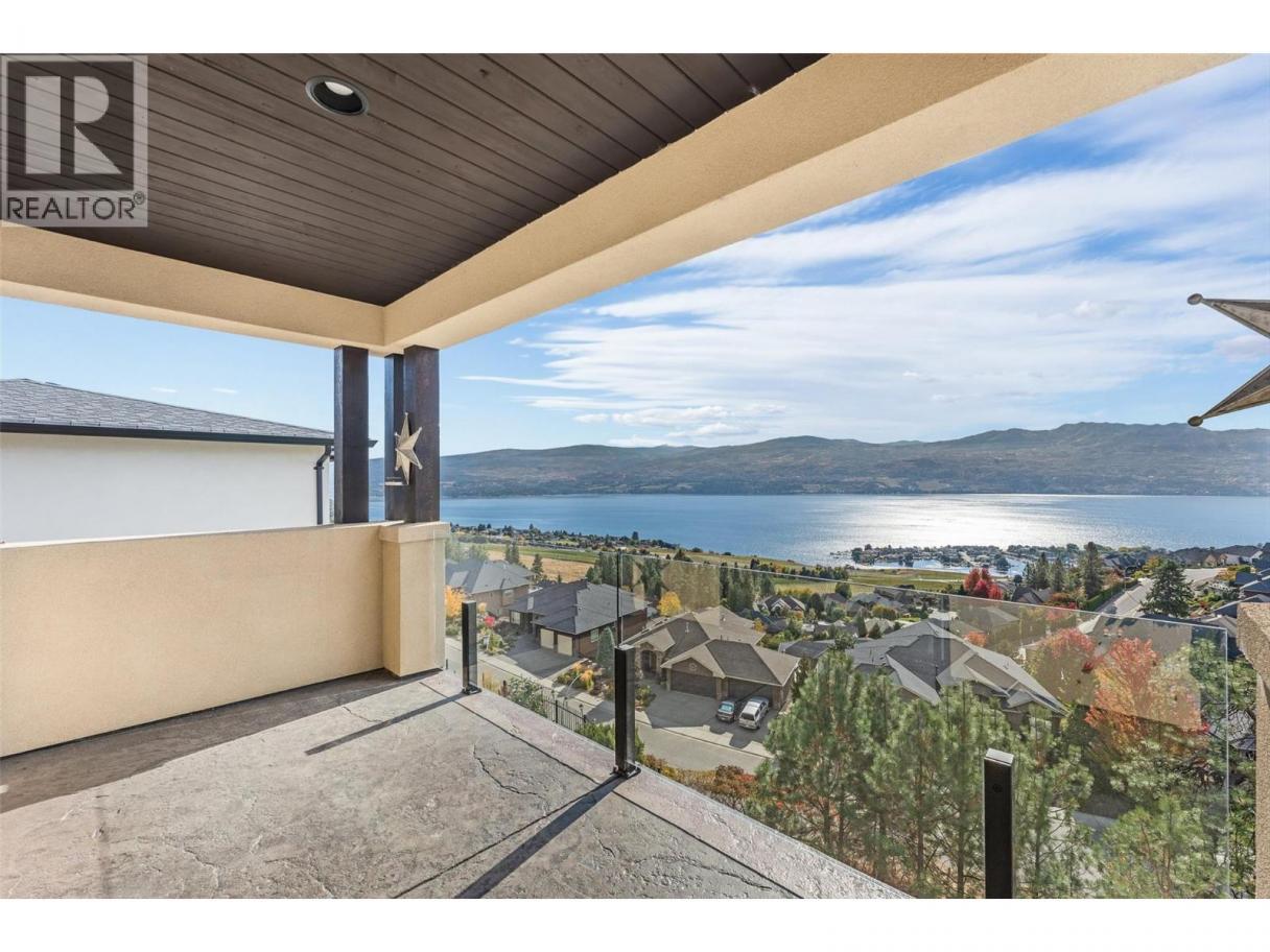 Set above Okanagan Lake in Lakeview Heights, this West Kelowna home offers the warmth and character of a Mediterranean-inspired villa, subtly echoing the relaxed hillside homes of Tuscany. Just minutes from the Westside Wine Trail, it feels connected to the surrounding vineyards, with natural stone, rich wood detailing, and sunlit rooms that open to the lake. On the main level, timber beams, textured walls, and a stone fireplace anchor the great room, where French doors lead to a covered lakeview patio with wood-inlay ceilings, infrared heaters, and space for relaxed dinners outdoors. The kitchen features hardwood floors, granite countertops, a contrasting island with seating, timeless cabinetry, and Bosch and Bertazzoni appliances. The entire upper floor is devoted to the primary suite, offering two walk-in closets, a spa-style ensuite with heated travertine, soaker tub, and walk-in shower, plus a private covered balcony with lake and valley views. On the walkout level, a generous recreation room, custom bar, and direct access to the pool terrace make entertaining effortless, from afternoon swims to evenings in the hot tub or around the firepit. A self-contained studio suite on the lower level adds flexibility for extended stays, or multi-generational living. Manicured landscaping, water features, an oversized double garage with abundant storage, and a convenient tiled dog wash complete a home that blends classic Mediterranean detailing with the relaxed Okanagan lifestyle. (id:6769)