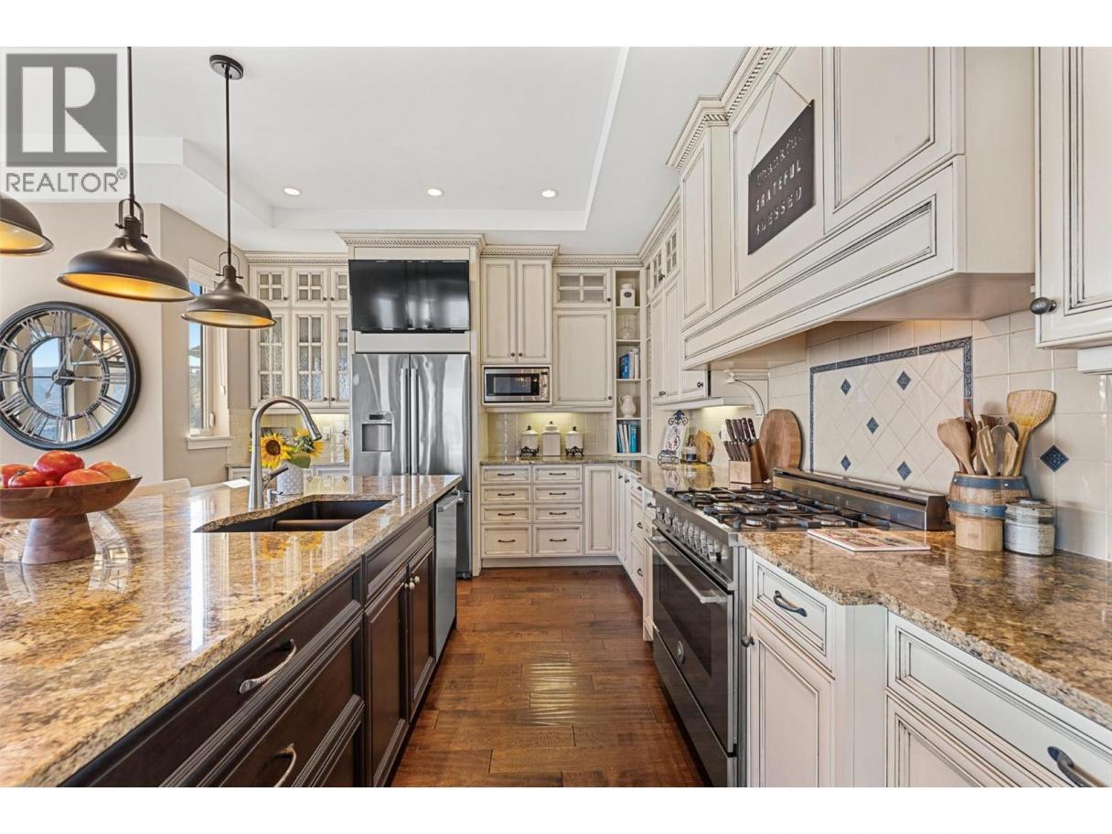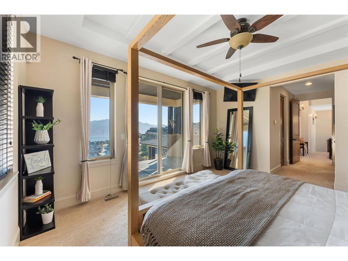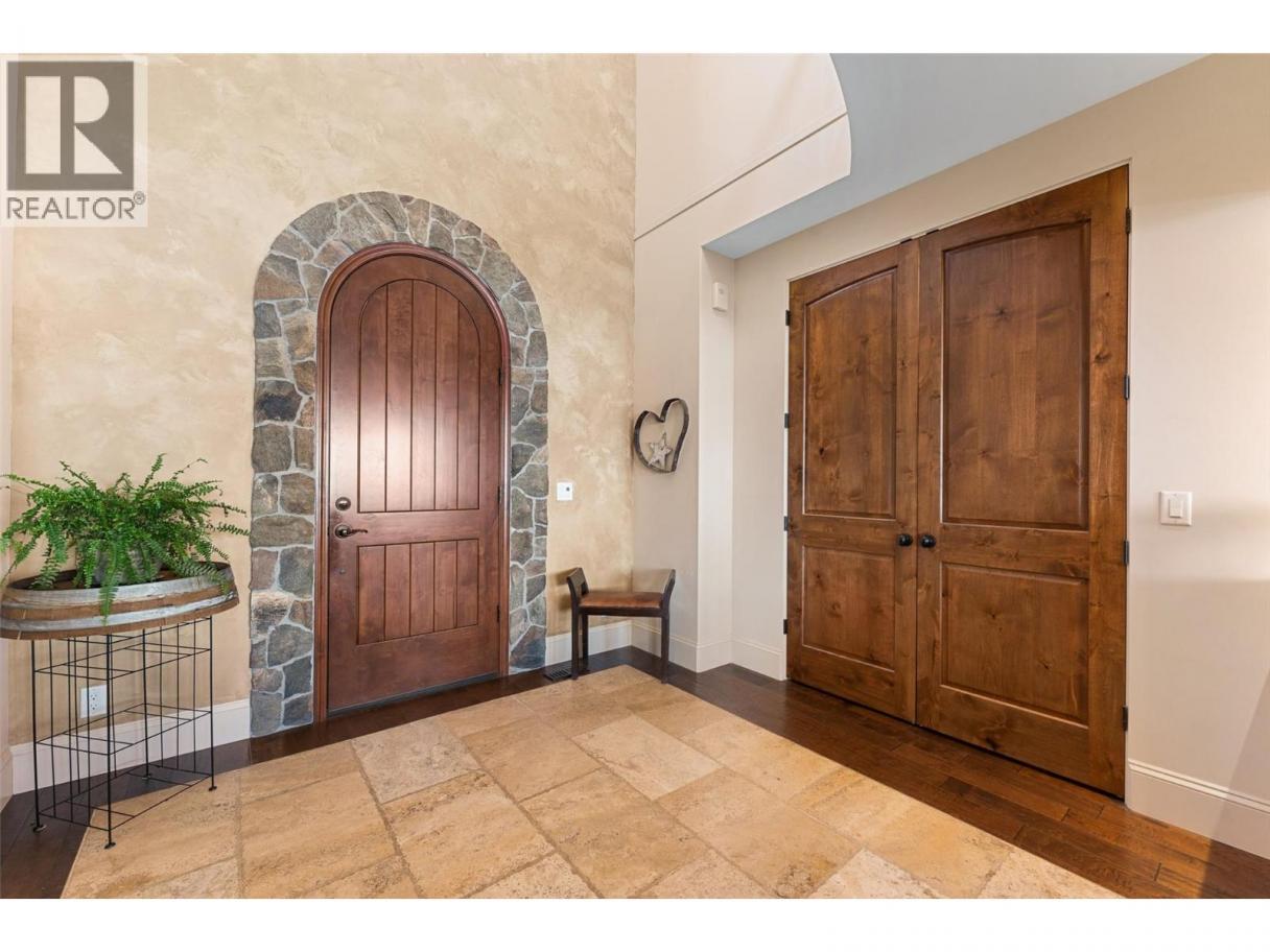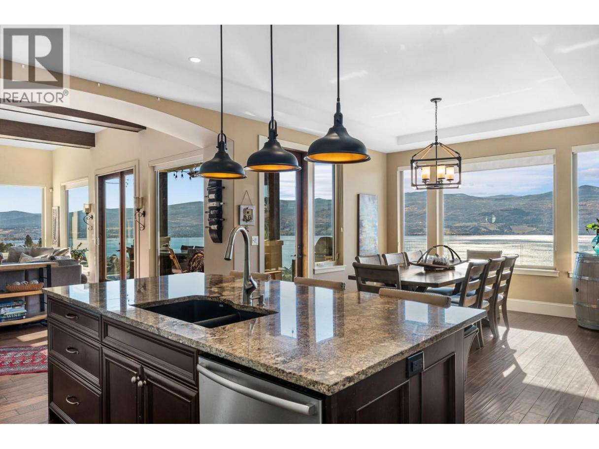 Set above Okanagan Lake in Lakeview Heights, this West Kelowna home offers the warmth and character of a Mediterranean-inspired villa, subtly echoing the relaxed hillside homes of Tuscany. Just minutes from the Westside Wine Trail, it feels connected to the surrounding vineyards, with natural stone, rich wood detailing, and sunlit rooms that open to the lake. On the main level, timber beams, textured walls, and a stone fireplace anchor the great room, where French doors lead to a covered lakeview patio with wood-inlay ceilings, infrared heaters, and space for relaxed dinners outdoors. The kitchen features hardwood floors, granite countertops, a contrasting island with seating, timeless cabinetry, and Bosch and Bertazzoni appliances. The entire upper floor is devoted to the primary suite, offering two walk-in closets, a spa-style ensuite with heated travertine, soaker tub, and walk-in shower, plus a private covered balcony with lake and valley views. On the walkout level, a generous recreation room, custom bar, and direct access to the pool terrace make entertaining effortless, from afternoon swims to evenings in the hot tub or around the firepit. A self-contained studio suite on the lower level adds flexibility for extended stays, or multi-generational living. Manicured landscaping, water features, an oversized double garage with abundant storage, and a convenient tiled dog wash complete a home that blends classic Mediterranean detailing with the relaxed Okanagan lifestyle. (id:6769)