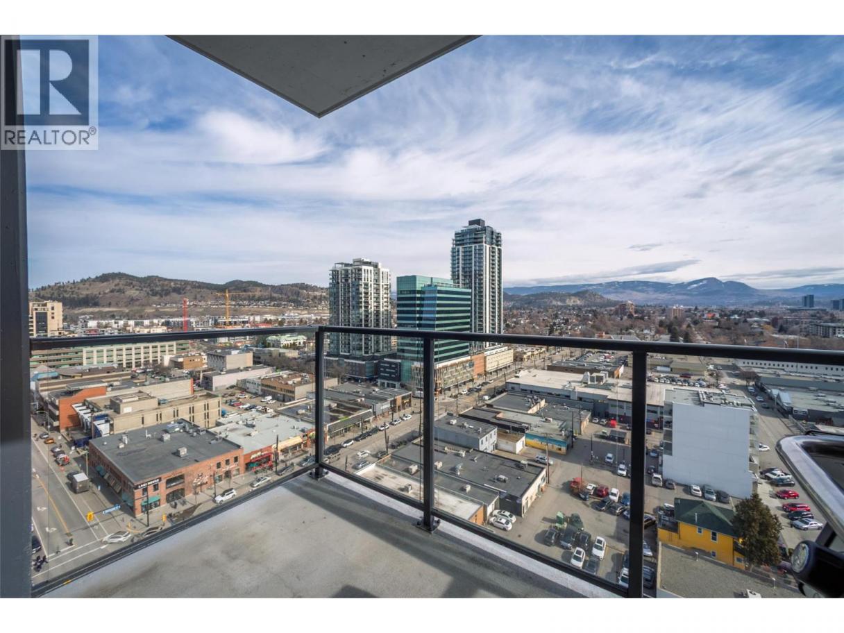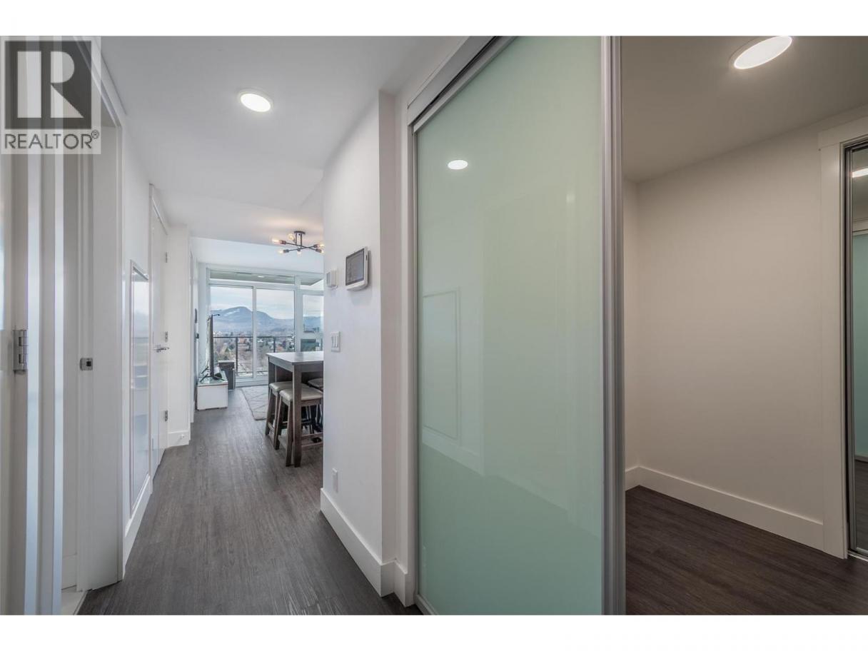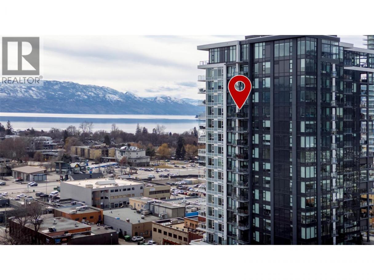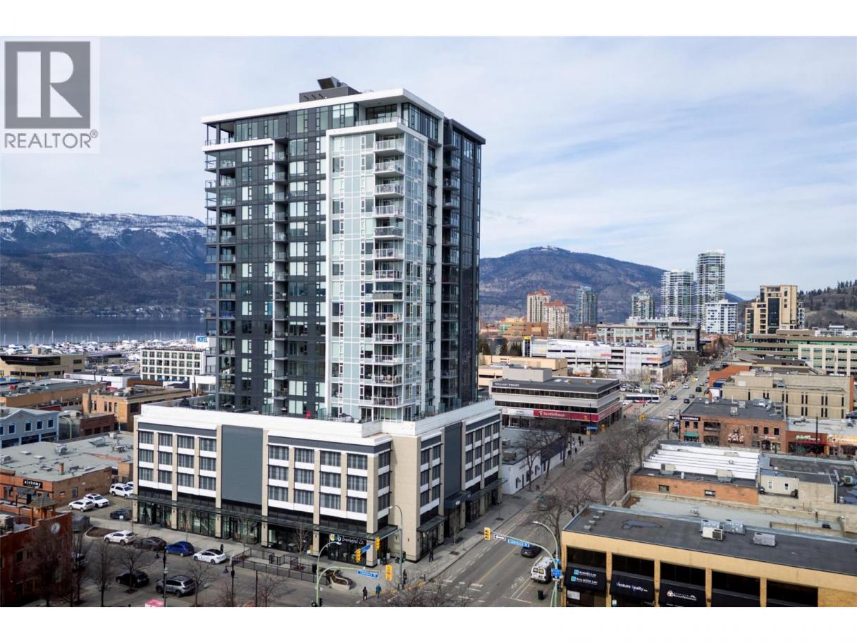 Contemporary 1 bedroom + large den condo on the 17th floor of ELLA! This stunning east-facing home offers beautiful sunrise exposure and expansive city and mountain views. ELLA is a high-quality concrete building, providing superior durability, privacy, and soundproofing in the heart of downtown Kelowna. The modern kitchen features stainless steel appliances including a gas stove, quartz countertops, under-cabinet lighting, sleek cabinetry, and a movable island with seating. The bright, spacious living area is filled with natural light and opens to the balcony—perfect for taking in the views or enjoying evening BBQs. The generous primary bedroom easily fits a king-size bed with room for additional furniture, while a large mirrored closet leads to the elegant 4-piece bathroom with quartz vanity and tub/shower combo. The sizable den with closet is a fantastic bonus space, ideal for a home office or guest room. Additional storage includes a side-by-side washer and dryer with folding counter, shelving, and hanging space, plus a versatile coat closet that could double as a pantry. One secure underground parking stall included, along with secured visitor parking. Two pets allowed with no height restrictions. With a Walk Score of 97, enjoy all the best of vibrant downtown Kelowna. Mid-March possession possible. (id:6769)