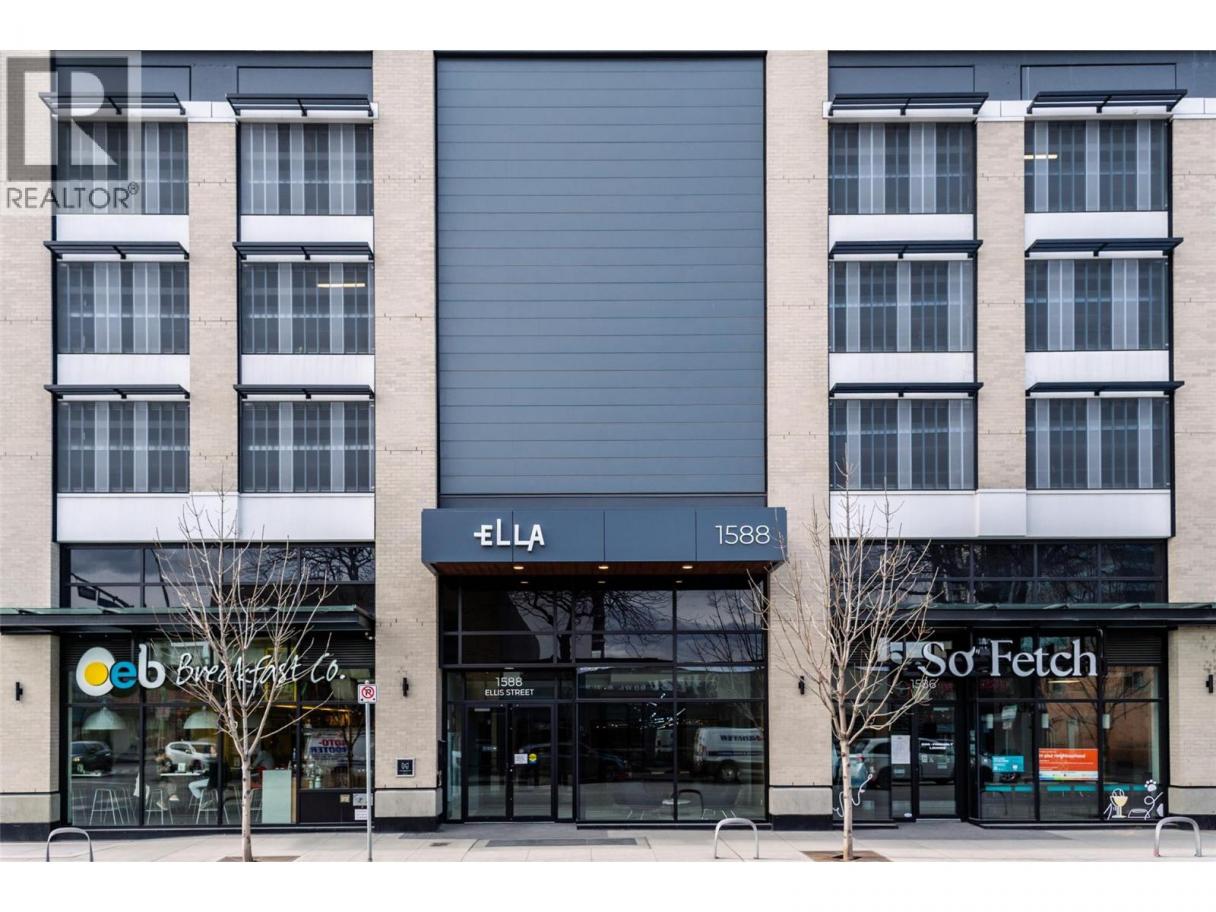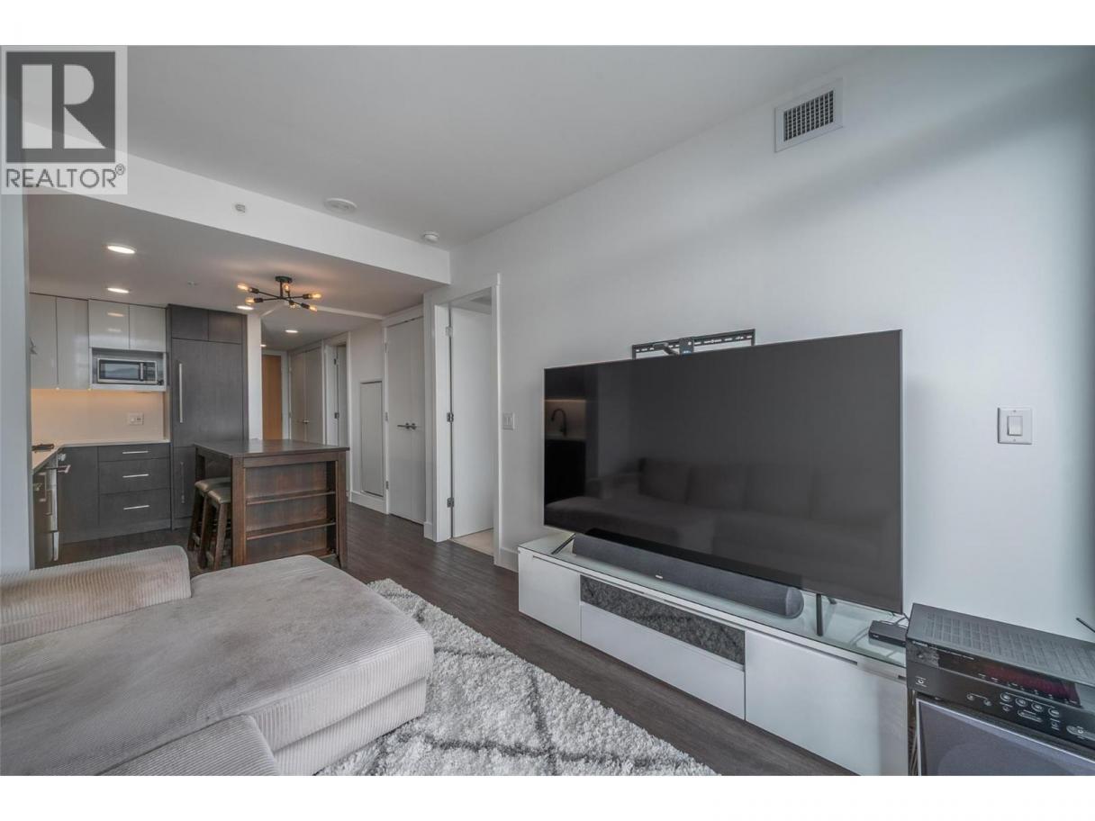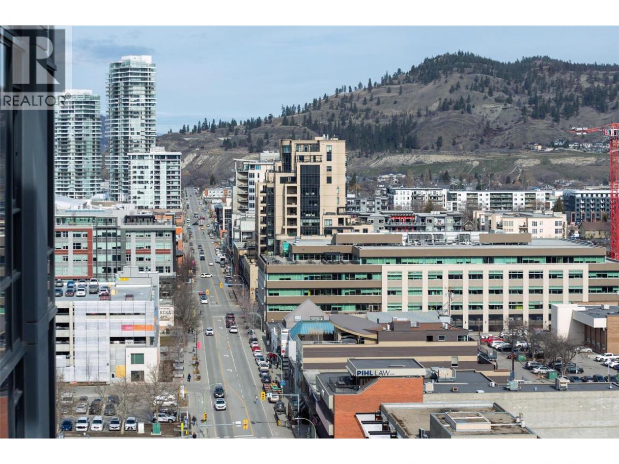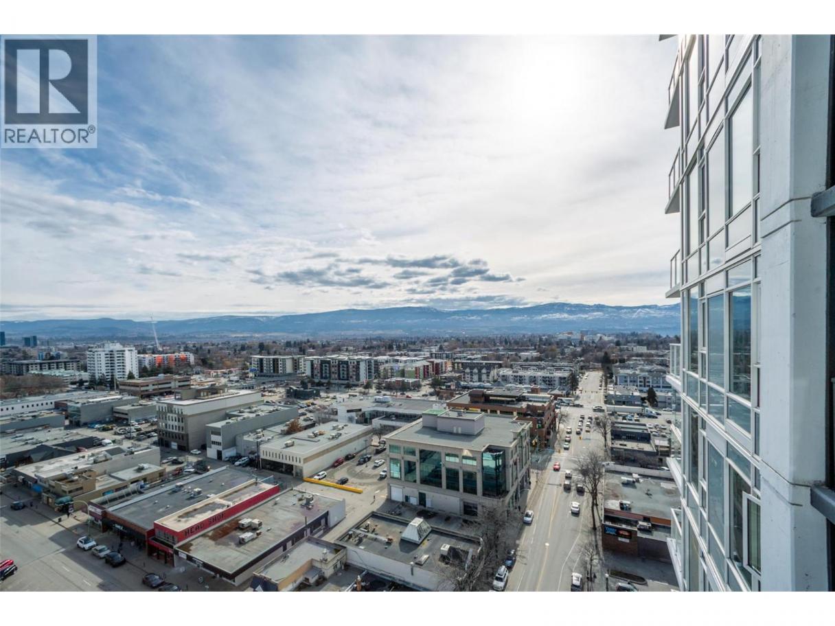 Contemporary 1 bedroom + large den condo on the 17th floor of ELLA! This stunning east-facing home offers beautiful sunrise exposure and expansive city and mountain views. ELLA is a high-quality concrete building, providing superior durability, privacy, and soundproofing in the heart of downtown Kelowna. The modern kitchen features stainless steel appliances including a gas stove, quartz countertops, under-cabinet lighting, sleek cabinetry, and a movable island with seating. The bright, spacious living area is filled with natural light and opens to the balcony—perfect for taking in the views or enjoying evening BBQs. The generous primary bedroom easily fits a king-size bed with room for additional furniture, while a large mirrored closet leads to the elegant 4-piece bathroom with quartz vanity and tub/shower combo. The sizable den with closet is a fantastic bonus space, ideal for a home office or guest room. Additional storage includes a side-by-side washer and dryer with folding counter, shelving, and hanging space, plus a versatile coat closet that could double as a pantry. One secure underground parking stall included, along with secured visitor parking. Two pets allowed with no height restrictions. With a Walk Score of 97, enjoy all the best of vibrant downtown Kelowna. Mid-March possession possible. (id:6769)