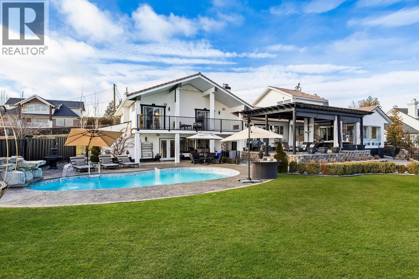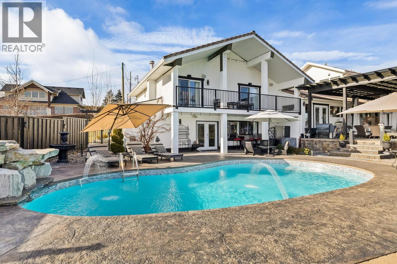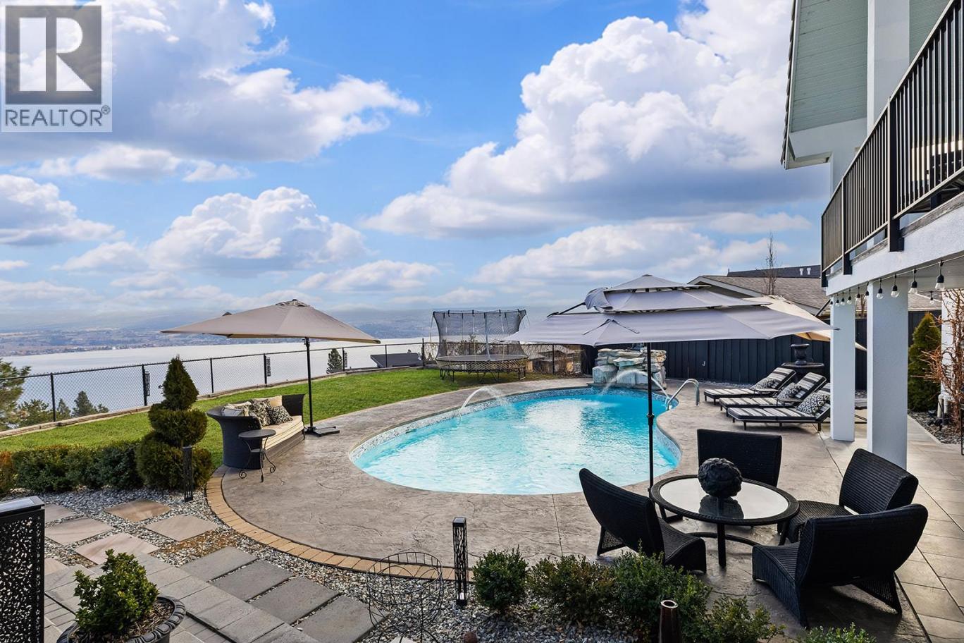Luxury Living with Resort Style Comfort. Experience privacy and lifestyle in this updated 3-level split home featuring 4 bedrooms and 4 bathrooms. The primary bedroom is located in a private wing, while the upper level offers 3 bedrooms, 2 bathrooms, including another primary bedroom with its own ensuite and deck access. The chef’s kitchen dazzles with custom leathered granite countertops, heated Travertine floors and premium Electrolux appliances. The primary bedroom wing offers panoramic pool views with direct pool access, a spa inspired ensuite featuring a smart toilet, heated floors, and a luxurious shower with humidifier, creating a true retreat. The lower level an entertainer’s dream with a rec/movie room with bar, gas fireplace, and hardwired interior and exterior sound system. A bathroom convenient for pool access with heated floors and Thermasol steam shower. Step outside to a refinished tiled in-ground pool with waterfall, limestone pathways, lush hydrangeas, a covered all season patio with stone construction, outdoor heating, and electrical. Additional features include cement siding with black trim, concrete tile roof, water on demand, upgraded 200 amp service, central vacuum, wainscoting and crown moulding and Kohler fixtures. Finishing the property is a newly built 1 bathroom legal suite above the garage with panoramic lake views. Perfect place for an Airbnb business. A rare offering that combines luxury, lifestyle, and an excellent investment opportunity awaits. (id:6769)