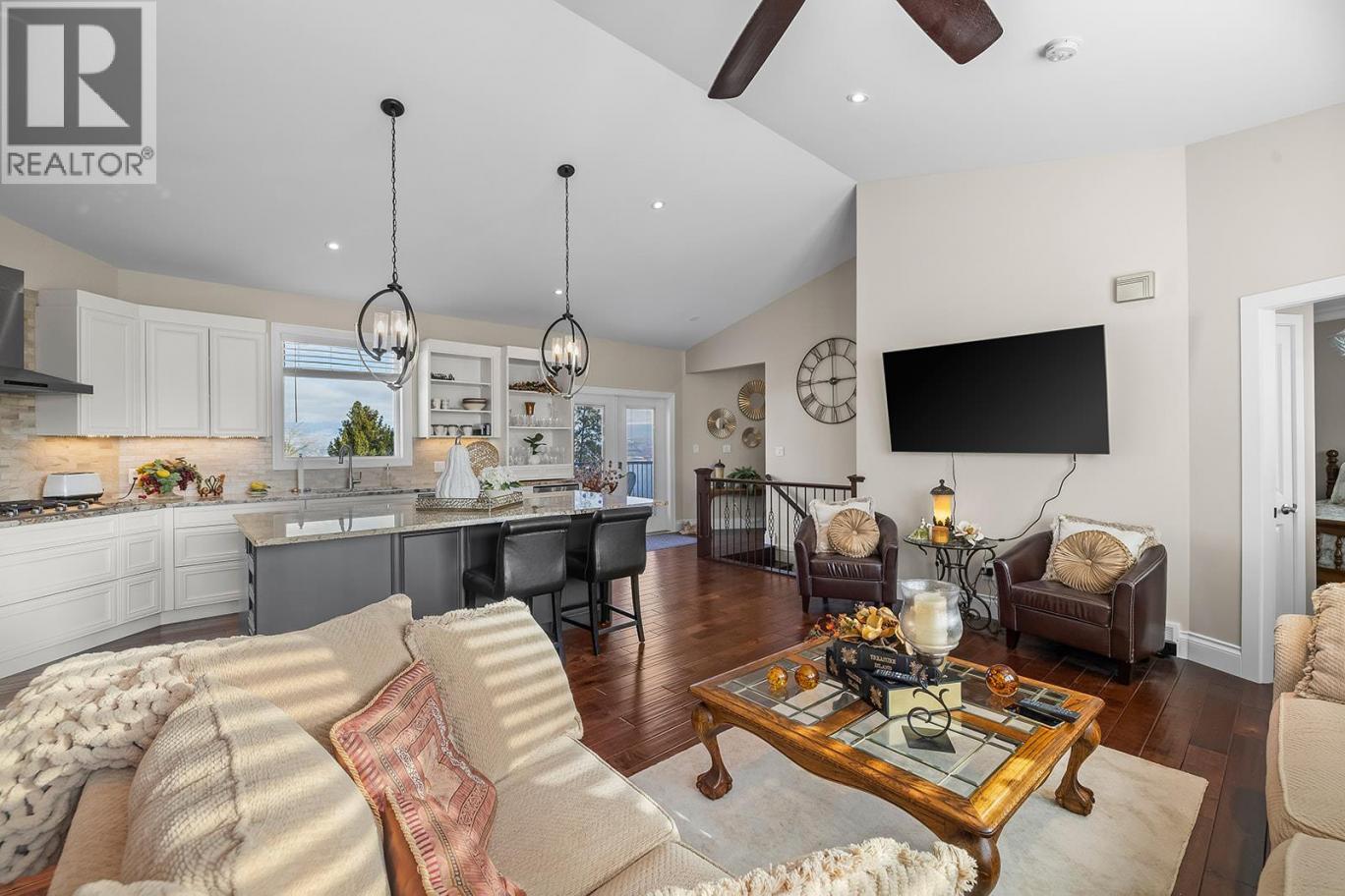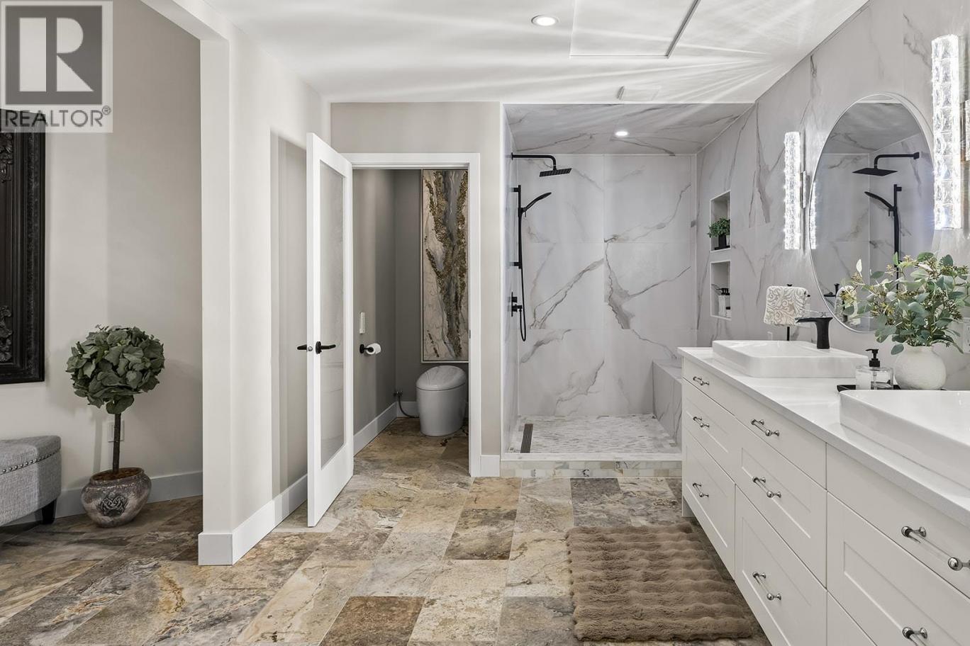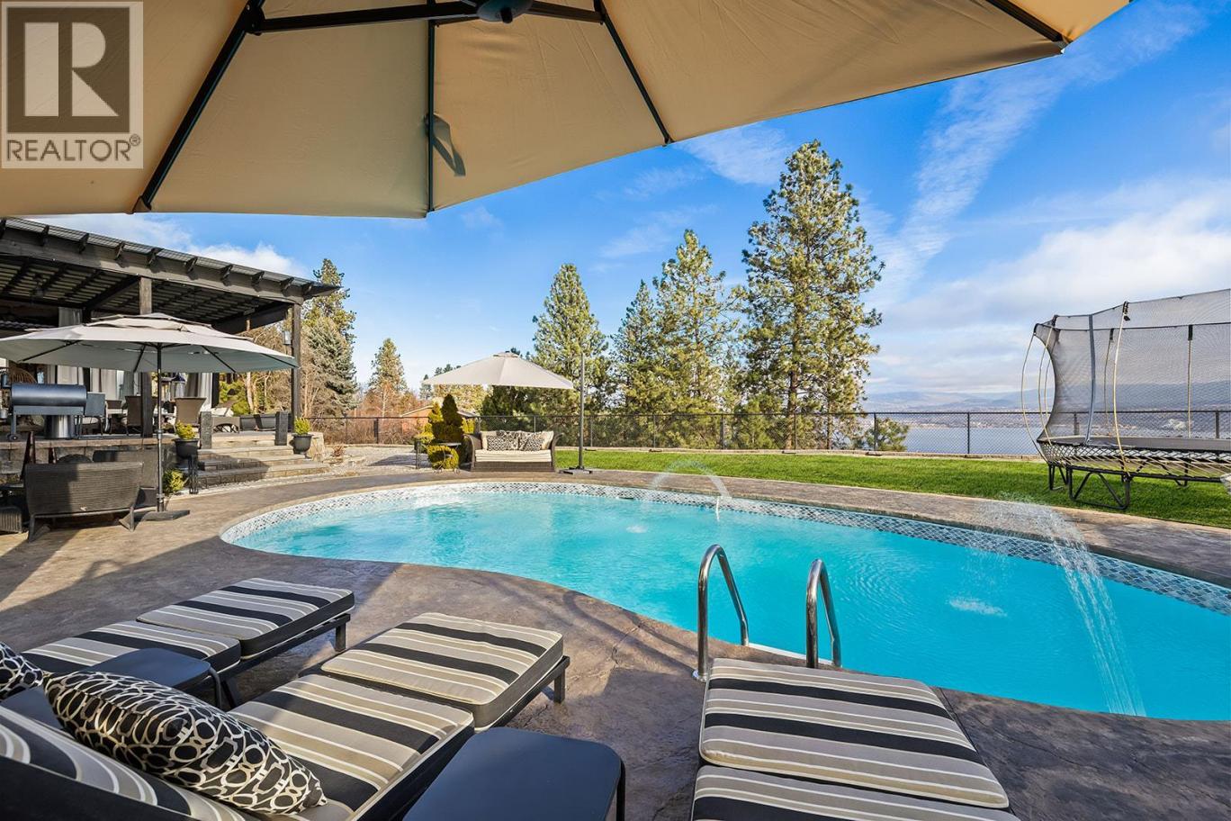 Luxury Living with Resort Style Comfort. Experience privacy and lifestyle in this updated 3-level split home featuring 4 bedrooms and 4 bathrooms. The primary bedroom is located in a private wing, while the upper level offers 3 bedrooms, 2 bathrooms, including another primary bedroom with its own ensuite and deck access. The chef’s kitchen dazzles with custom leathered granite countertops, heated Travertine floors and premium Electrolux appliances. The primary bedroom wing offers panoramic pool views with direct pool access, a spa inspired ensuite featuring a smart toilet, heated floors, and a luxurious shower with humidifier, creating a true retreat. The lower level an entertainer’s dream with a rec/movie room with bar, gas fireplace, and hardwired interior and exterior sound system. A bathroom convenient for pool access with heated floors and Thermasol steam shower. Step outside to a refinished tiled in-ground pool with waterfall, limestone pathways, lush hydrangeas, a covered all season patio with stone construction, outdoor heating, and electrical. Additional features include cement siding with black trim, concrete tile roof, water on demand, upgraded 200 amp service, central vacuum, wainscoting and crown moulding and Kohler fixtures. Finishing the property is a newly built 1 bathroom legal suite above the garage with panoramic lake views. Perfect place for an Airbnb business. A rare offering that combines luxury, lifestyle, and an excellent investment opportunity awaits. (id:6769)