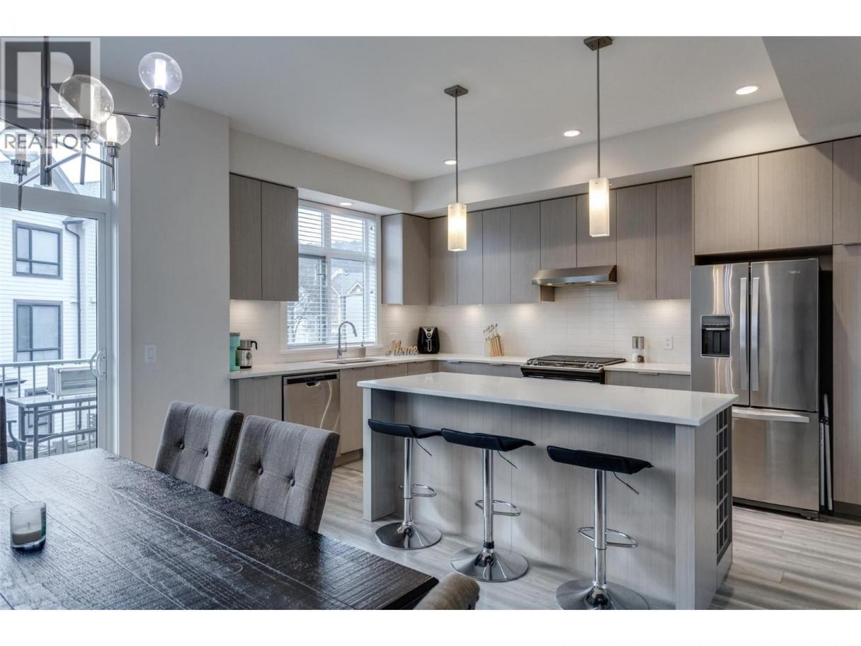 Discover Drysdale Row, a beautiful and thoughtfully created 4-bedroom, 2.5-bathroom townhome in one of North Glenmore’s most sought-after communities. Offering just under 1,600 sq. ft., the open-concept main level is designed for modern living, with elevated ceilings, a bright & spacious living area, and a gorgeous kitchen at the heart of the home. This home features a wider floor plan and large windows that fill the space with natural light. Situated on a quiet residential street, the sidewalk access leads to a charming front yard. The chef-inspired kitchen showcases a large quartz island with built-in wine storage, stainless steel appliances, and a gas range, flowing seamlessly into the open-concept living and dining areas—ideal for entertaining. A deck made for morning coffees or summer BBQs and a stylish 2-piece powder room complete this level. Upstairs offers three spacious bedrooms, a full bathroom, and convenient laundry. The primary suite includes spa-like ensuite and a walk-in closet. The lower level features a fourth bedroom or flex space, perfect for a home office, gym, or hobby room, with direct access to the side-by-side double garage. Located in a family-friendly neighbourhood, it is only a few steps to Dr. Knox Middle School and North Glenmore Elementary, with bus routes to UBCO, and close to parks, trails, shopping, and restaurants. (id:6769)