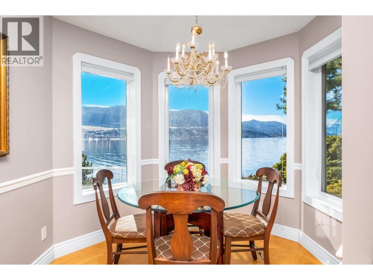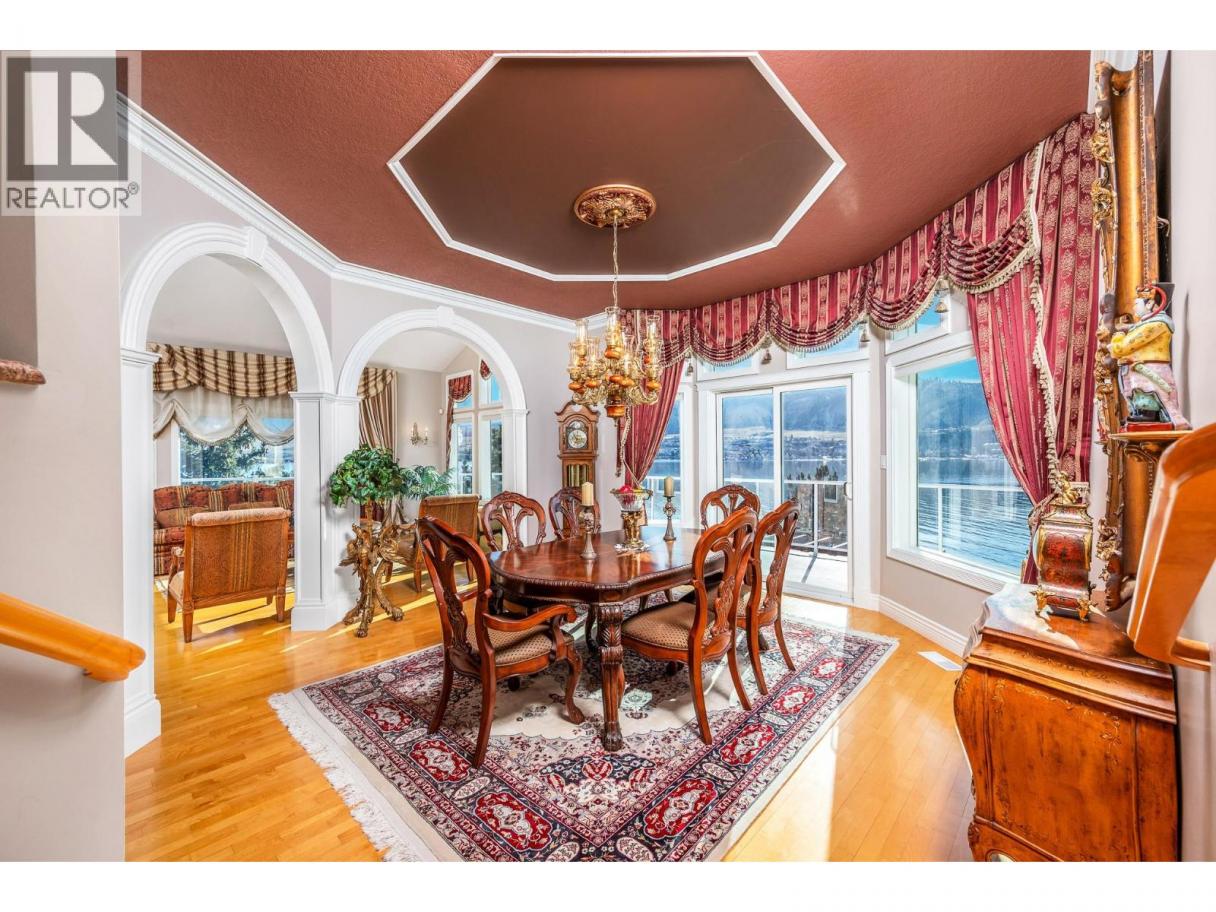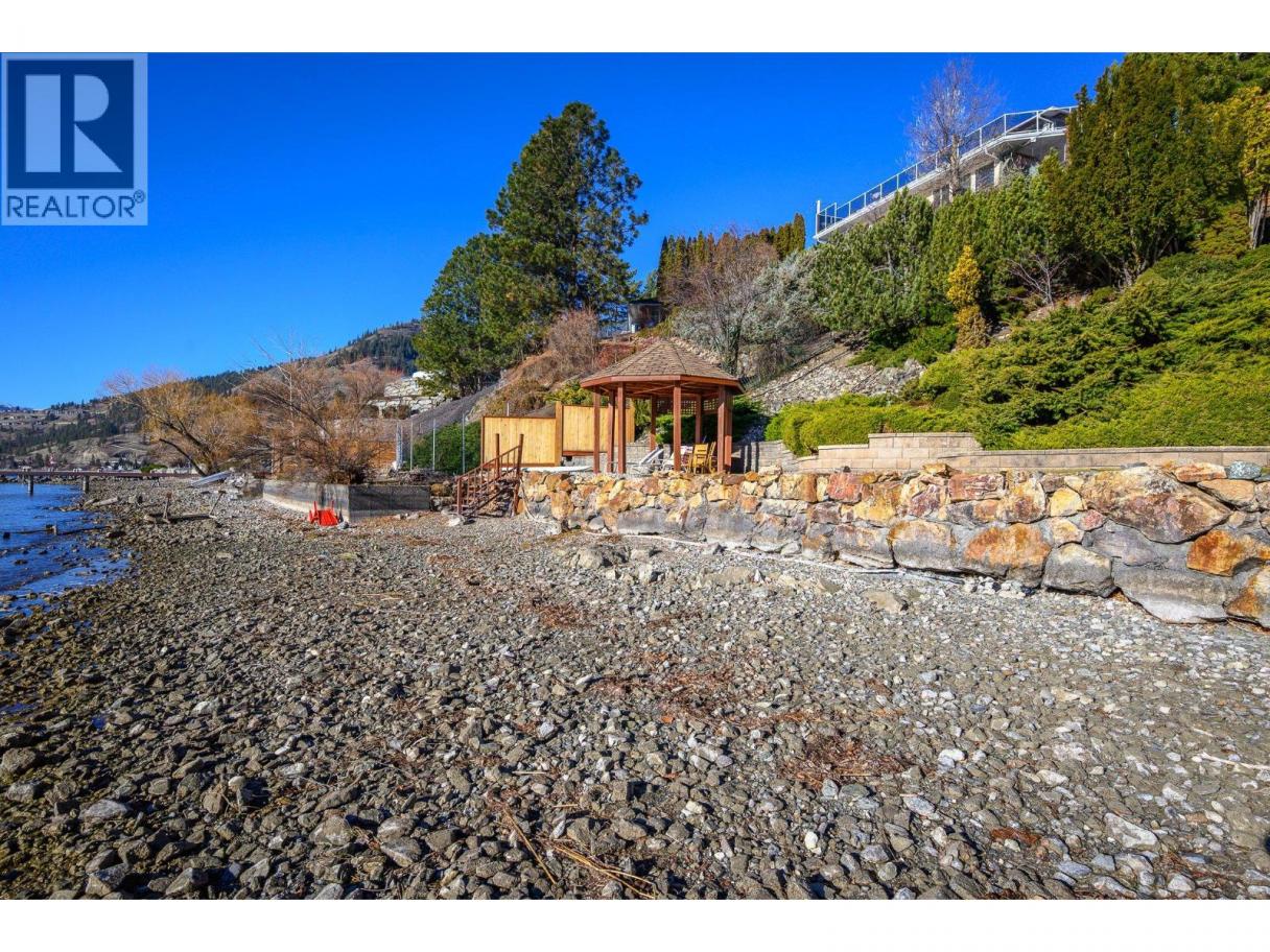 Okanagan lake shore living with so much privacy! Barely 10 minutes from the Vernon city center, just past the popular Kin Beach, watch for the gates to this .56 acre estate. The south/west facing lake views are inspirational and promise sun right until sunset! Follow the walkways through the mature landscape, past the bridged waterscape and take the 42 easy steps to your 79ft of completely level waterfront! Check out the pergola for shaded respite! The home offers a comfortable yet serene elegance with hardwood floors, heated tile floors, elevated and coffered ceilings, impressive arches to define living areas, unique hand picked lighting fixtures & windows everywhere to drink in the lake views. Entertainment sized deck off the main level and partially covered tiled deck of the lower level! Updated kitchen with impressive granite island and gas range and bay window breakfast nook. Step down to the formal dining room and living rooms or escape behind the french doors to the family room with its cozy gas fireplace and built in library. Follow the curved stairway to the open landing of the upper level – reserved entirely for the primary suite with decadent 5 piece ensuite and his and hers dressing room. The lower level can be a completely closed for a private 3 bedroom suite for family or lingering guests! Full kitchen and family room that opens to huge private deck and beach access. Double garage and loads of level parking! Mature, colourful landscaping with sprinkler system. (id:6769)