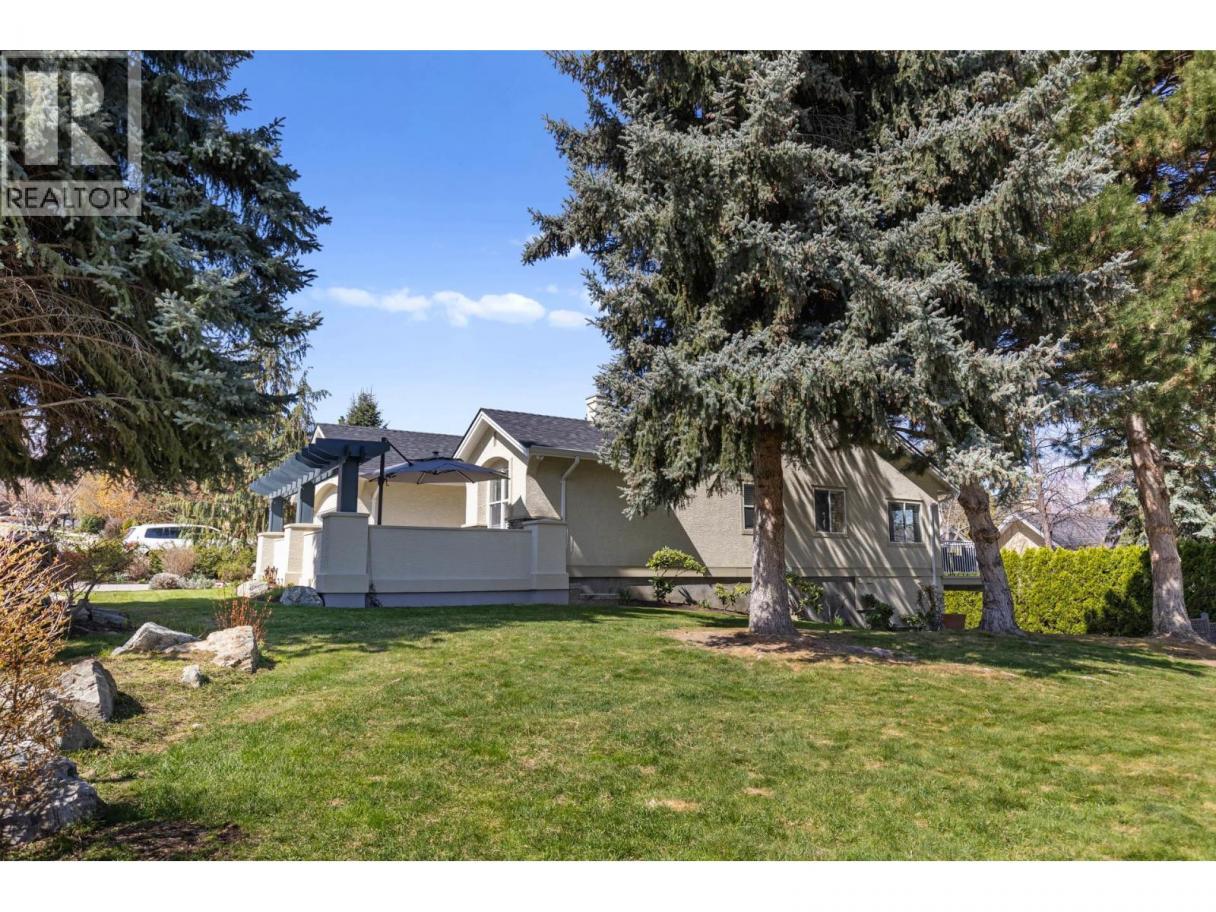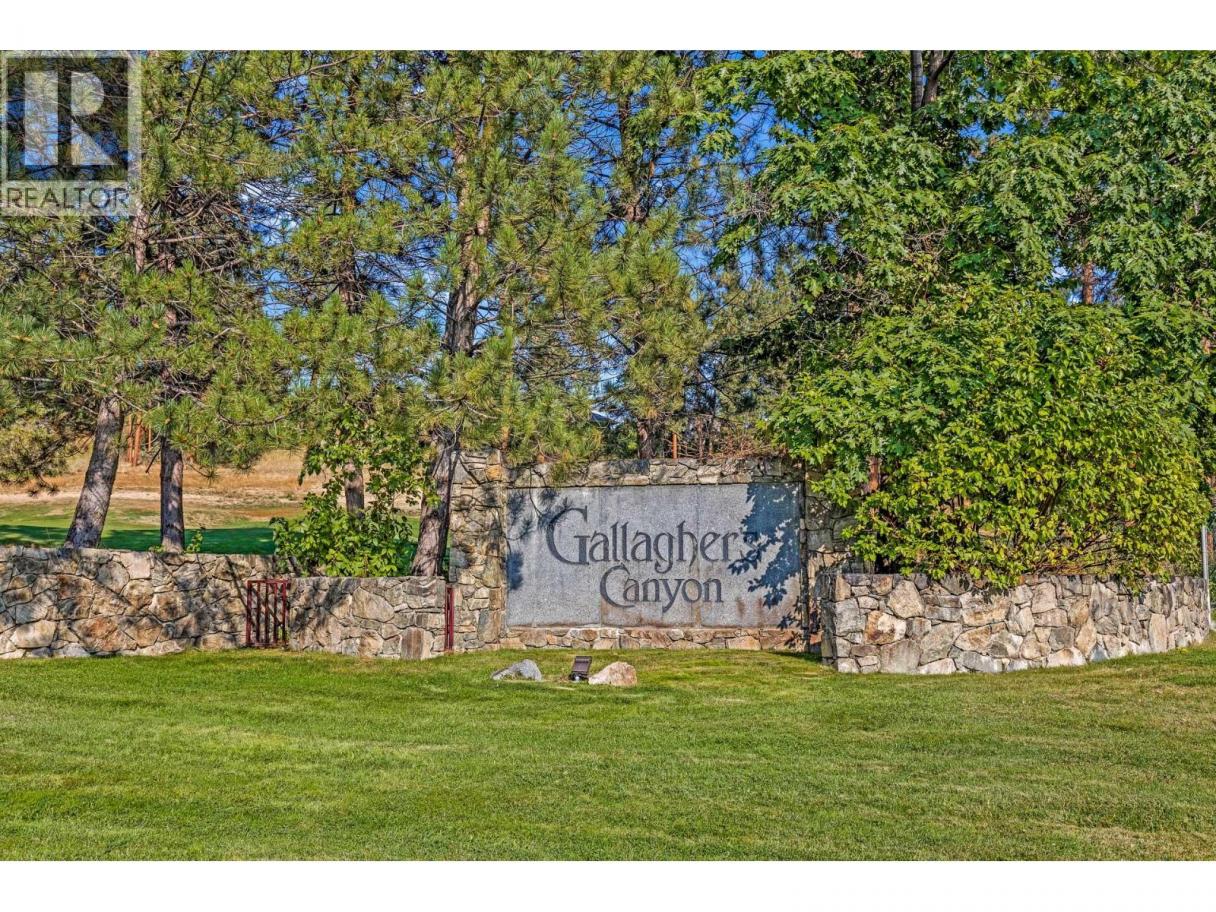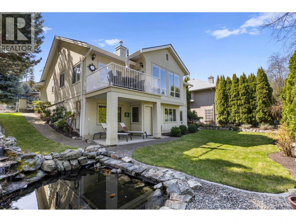 Beautiful Walkout Rancher in the Gallaghers Canyon Golf Community. From the moment you step inside, you’ll be captivated by the grand interior, featuring gleaming hardwood floors, soaring ceilings and large picture windows. The updated kitchen boasts stylish two-tone cabinetry, stainless steel appliances, a functional layout and a striking 3-sided gas fireplace. The living room is a sophisticated retreat, perfect for unwinding after a round of golf or hosting friends and family. The primary suite is complete with a spa-inspired ensuite, a massive walk-in tiled shower, and a generous walk-in closet. Also on the main level is a bright second bedroom and a convenient laundry room. Downstairs, the fully finished walkout lower level offers suite potential with a separate entrance, two additional bedrooms, a den/media room, a spacious family room, and a summer kitchen—ideal for guests or extended family. The outdoor living space is nothing short of spectacular. At the front, a large courtyard sets the tone for relaxed mornings & evening gatherings, while a tranquil water feature with a stream and pond adds to the peaceful ambiance. Additional upgrades include a new exposed aggregate driveway, new asphalt roof, and a recently replaced hot water tank. Enjoy top-tier amenities including an indoor pool, whirlpool, fitness center, pickleball, games room, club rooms, and library. In addition, there is a ""coming soon"" daycare to serve the families of the East Kelowna Area! (id:6769)