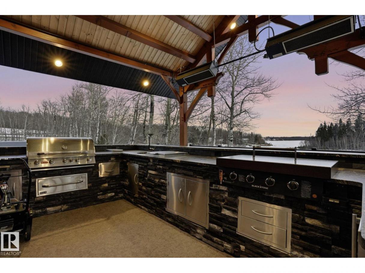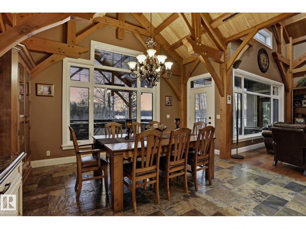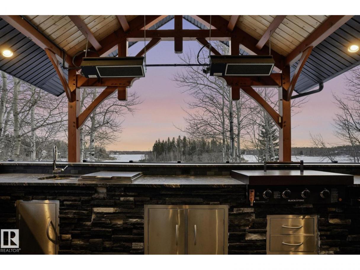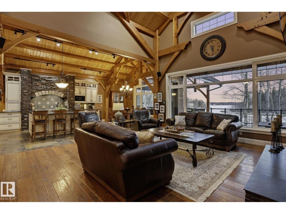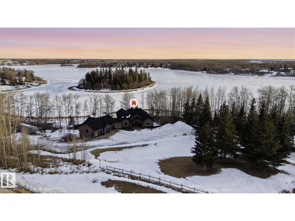 This timber frame home sits on over 500 feet of lakefront shoreline in a quiet, private corner of Jackfish Lake. The design centers on lake views, w/the structure carefully placed among the surrounding woods for a natural, integrated feel. The property includes two large stacked 30' x 40' garages: one set up as a clean showroom space, the other as a functional workshop. With 11–12 foot ceilings, 9'x9' upper doors & 9'x10' lower doors. In-floor heating runs throughout the home, including the basement, both garages, & the main floor (which required pouring 3 inches of concrete across the entire level). Outside, the fully equipped outdoor kitchen is covered & heated, so you can cook and gather comfortably in any weather while enjoying the lake views and peaceful surroundings. With a designated RV area, you're all set up to handle guests. Jackfish Lake is known to be clean & calm, with many bays & only short docks required. 20 mins to Spruce Grove, 35 mins to Edmonton. Your natural oasis awaits. (id:6769)