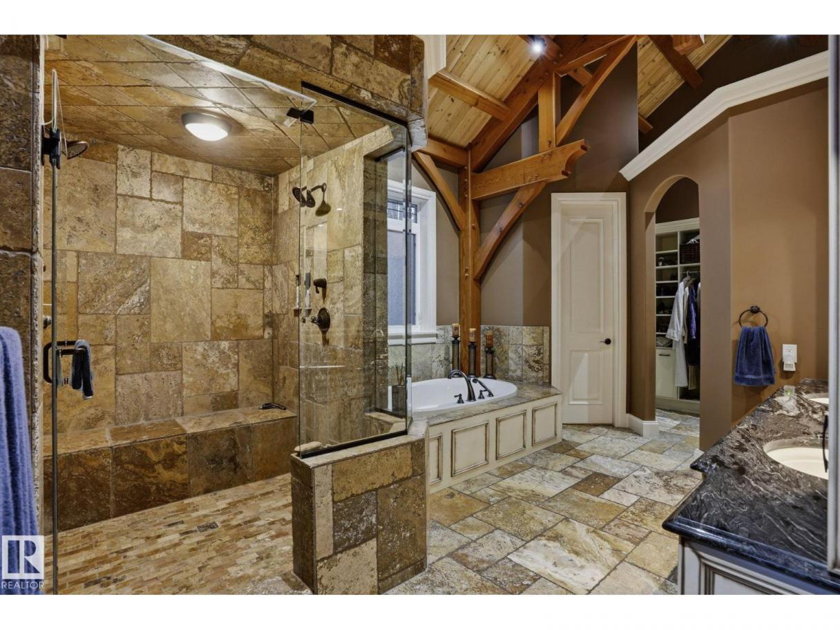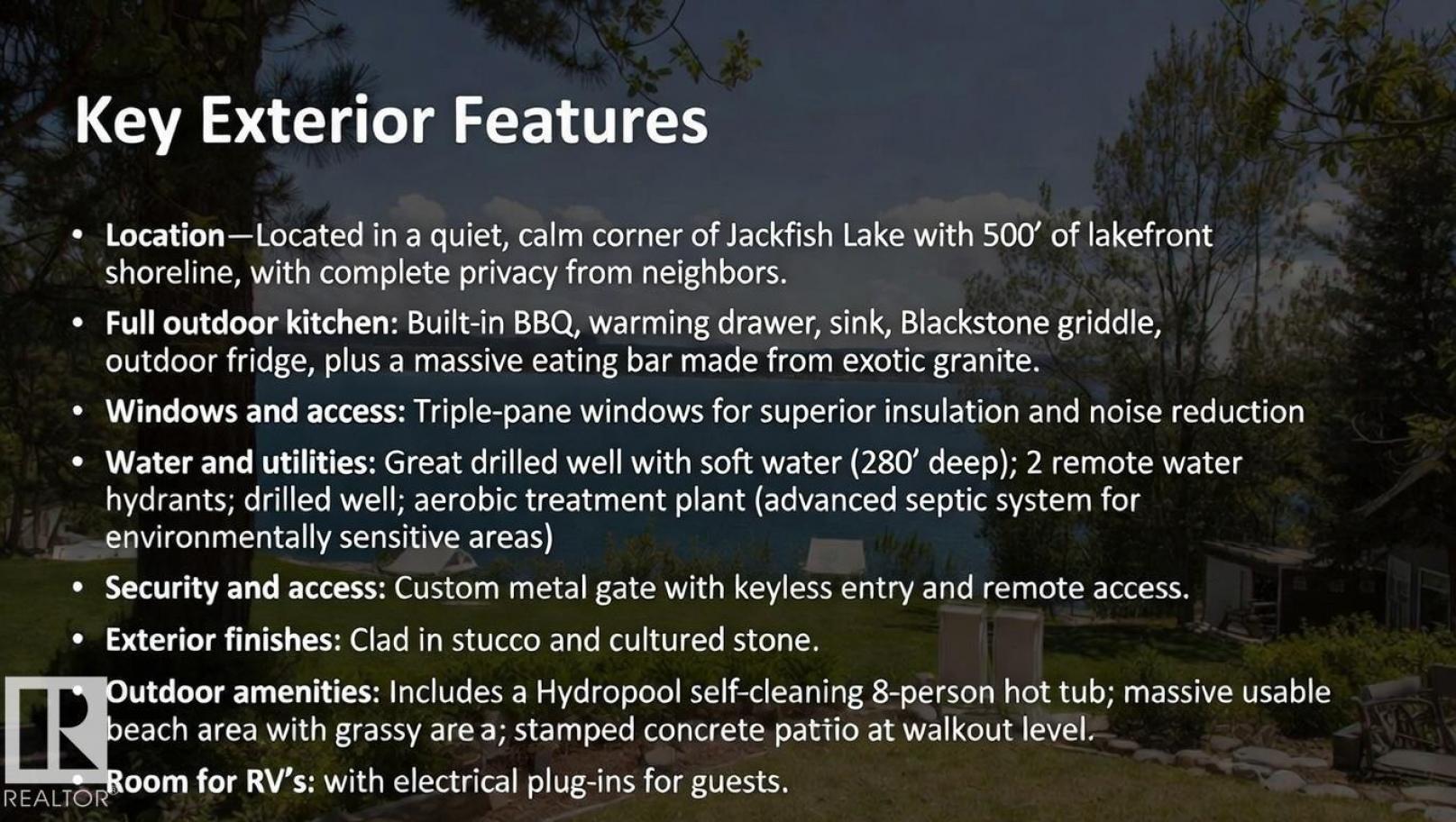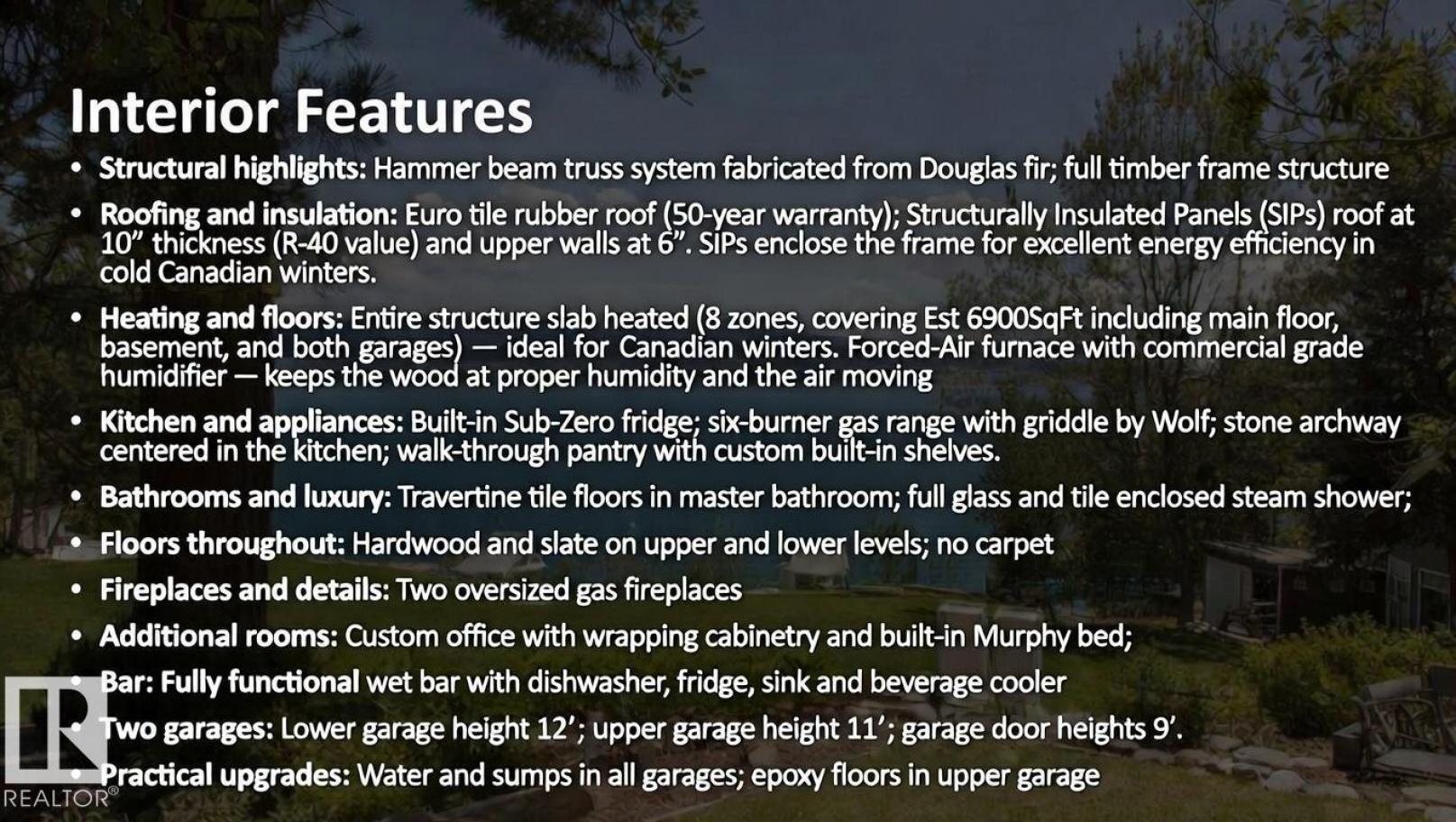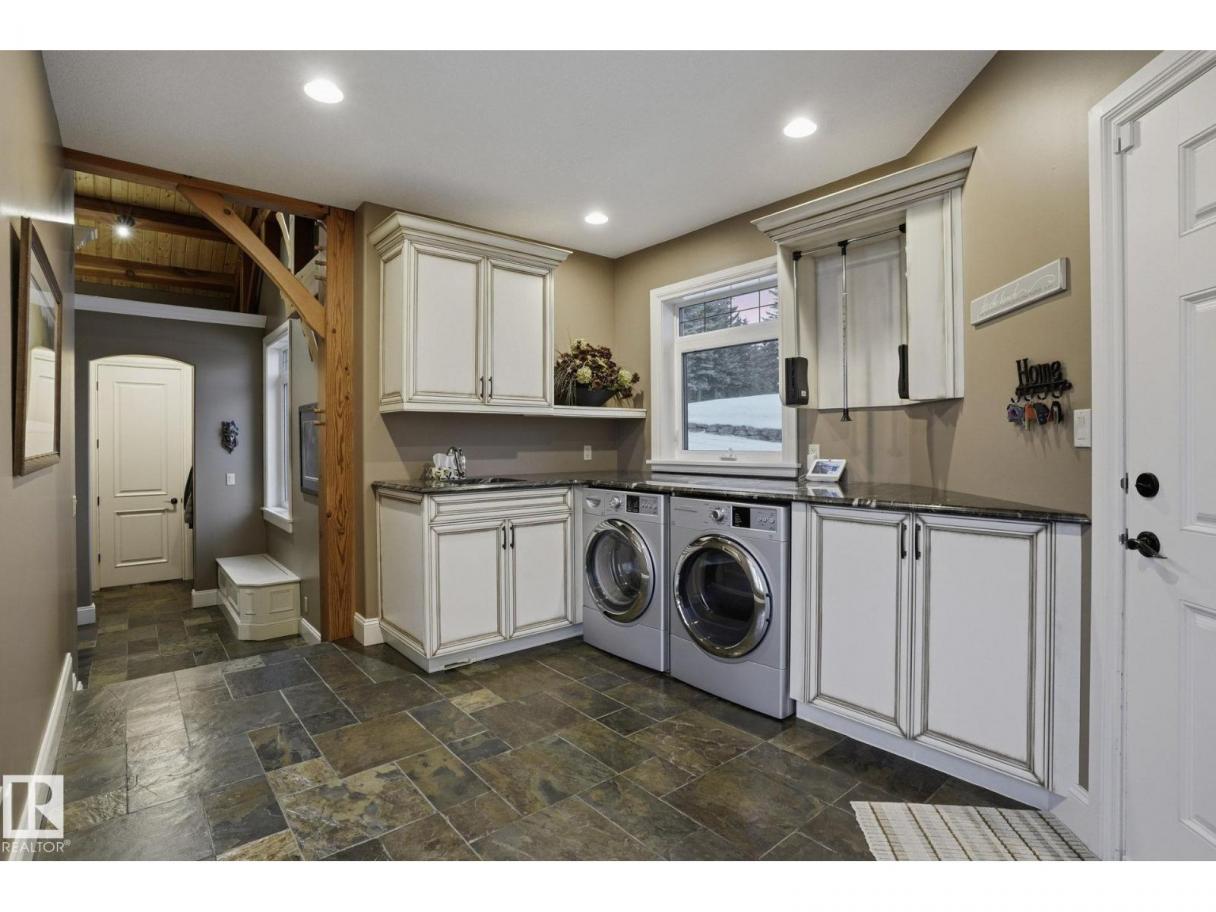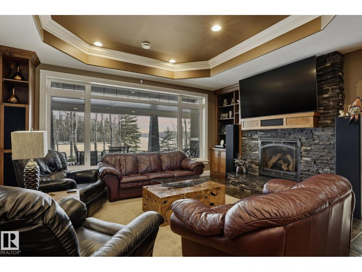 This timber frame home sits on over 500 feet of lakefront shoreline in a quiet, private corner of Jackfish Lake. The design centers on lake views, w/the structure carefully placed among the surrounding woods for a natural, integrated feel. The property includes two large stacked 30' x 40' garages: one set up as a clean showroom space, the other as a functional workshop. With 11–12 foot ceilings, 9'x9' upper doors & 9'x10' lower doors. In-floor heating runs throughout the home, including the basement, both garages, & the main floor (which required pouring 3 inches of concrete across the entire level). Outside, the fully equipped outdoor kitchen is covered & heated, so you can cook and gather comfortably in any weather while enjoying the lake views and peaceful surroundings. With a designated RV area, you're all set up to handle guests. Jackfish Lake is known to be clean & calm, with many bays & only short docks required. 20 mins to Spruce Grove, 35 mins to Edmonton. Your natural oasis awaits. (id:6769)