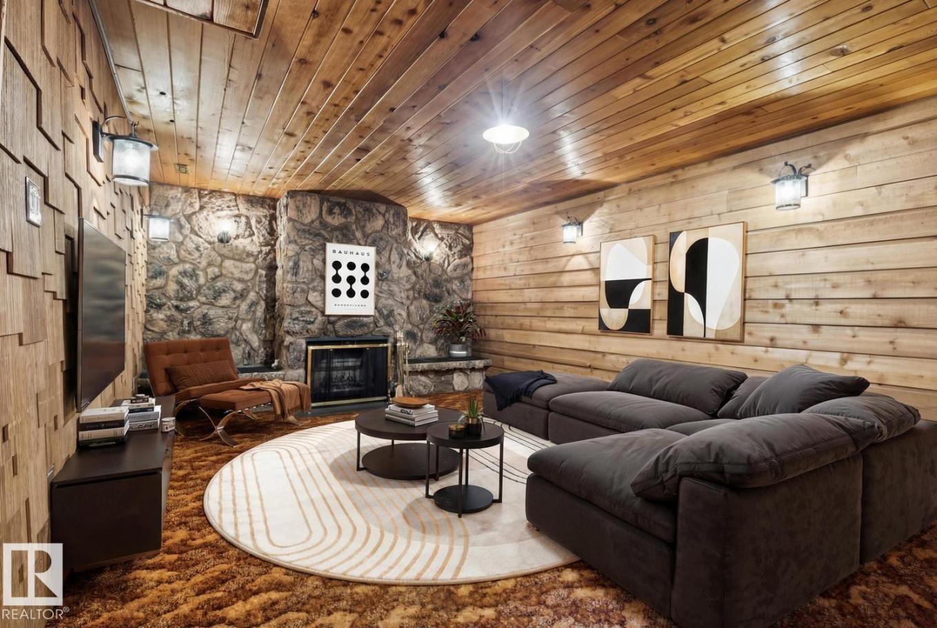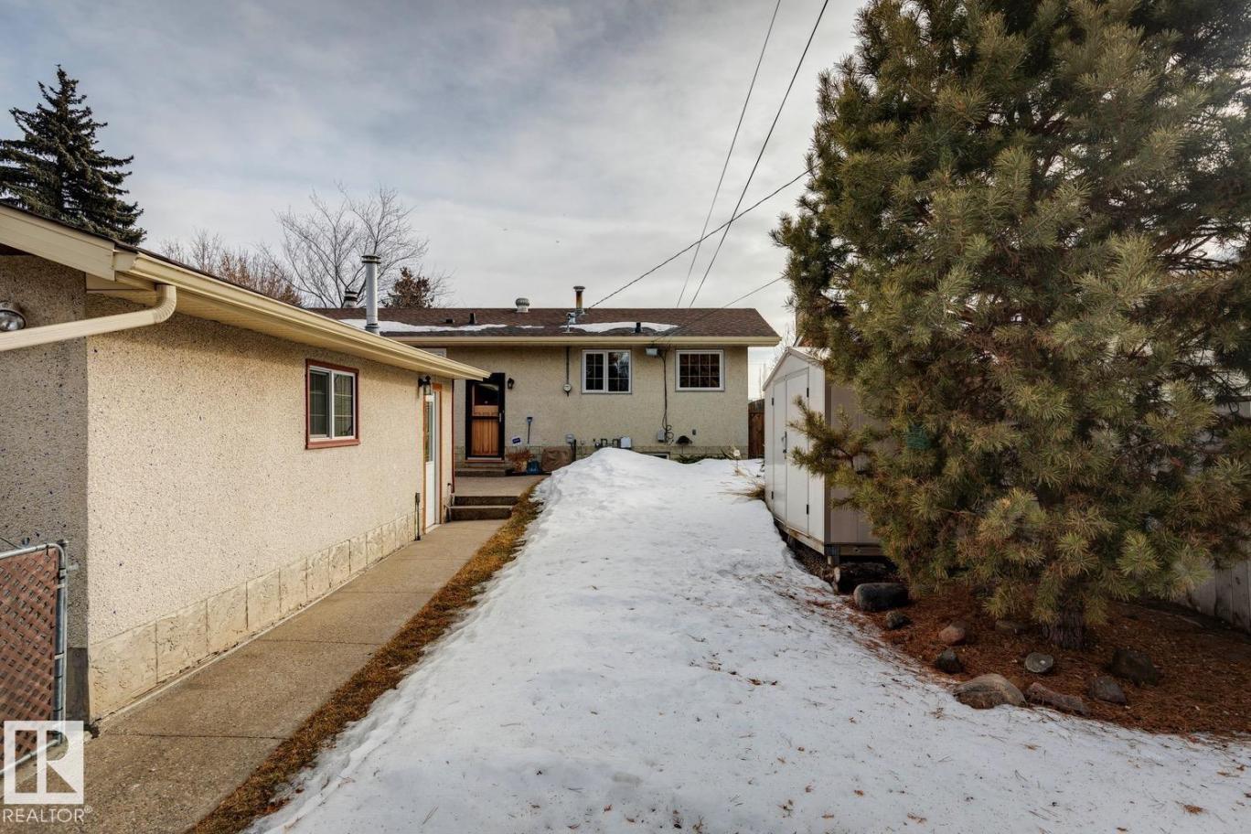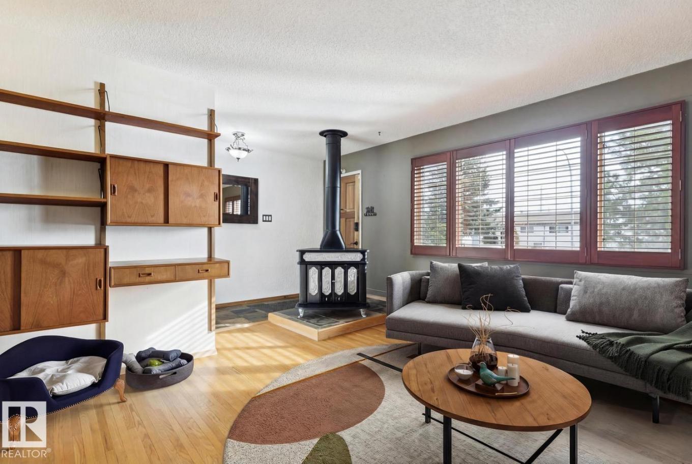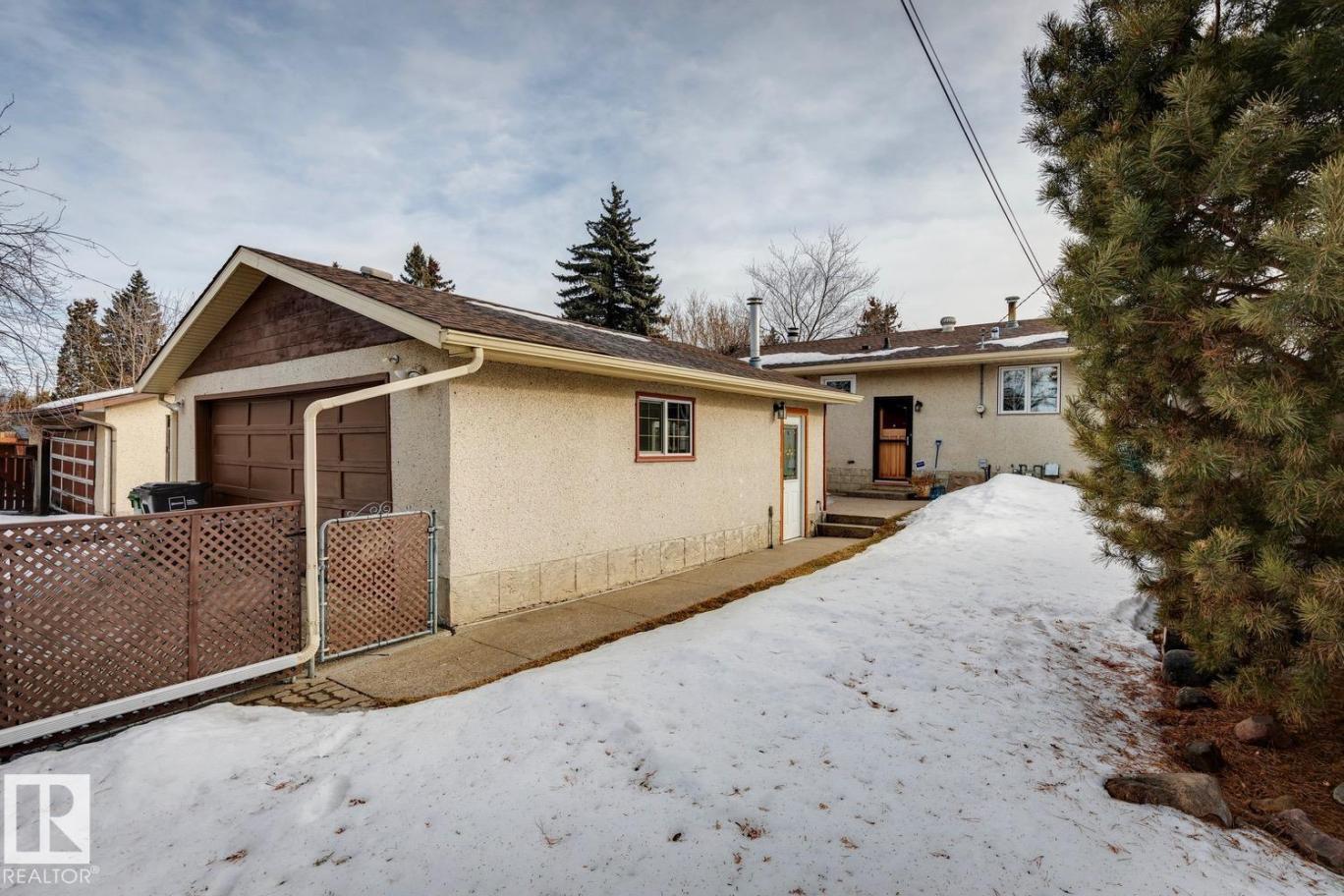 Very well maintained and upgraded home in desirable west Edmonton neighborhood of Meadowlark! This endearing bungalow offers 4 total bedrooms, 2 full baths, almost 1900 sqft of total living space, and has been tastefully updated while maintaining much of its original charm. The main floor features a very functional floorplan, updated kitchen w/s.s. appliances, large living area w/wood burning stove, hardwood/slate/vinyl flooring, 3 good sized bedrooms, and updated 4-pc bath. The fully developed basement offers much of its original allure. Huge rec area with gorgeous stone/wood burning fireplace, 4th bedroom, 3-pc bath w/sauna, and plenty of storage. Outside you will enjoy the private and mature yard w/heated detached garage and RV parking. Other improvements include: newer roof, windows, concrete, paint, and more. Located close to schools, public transportation, West Edmonton Mall, and other amenities. Very well kept home in an even better location! (id:6769)