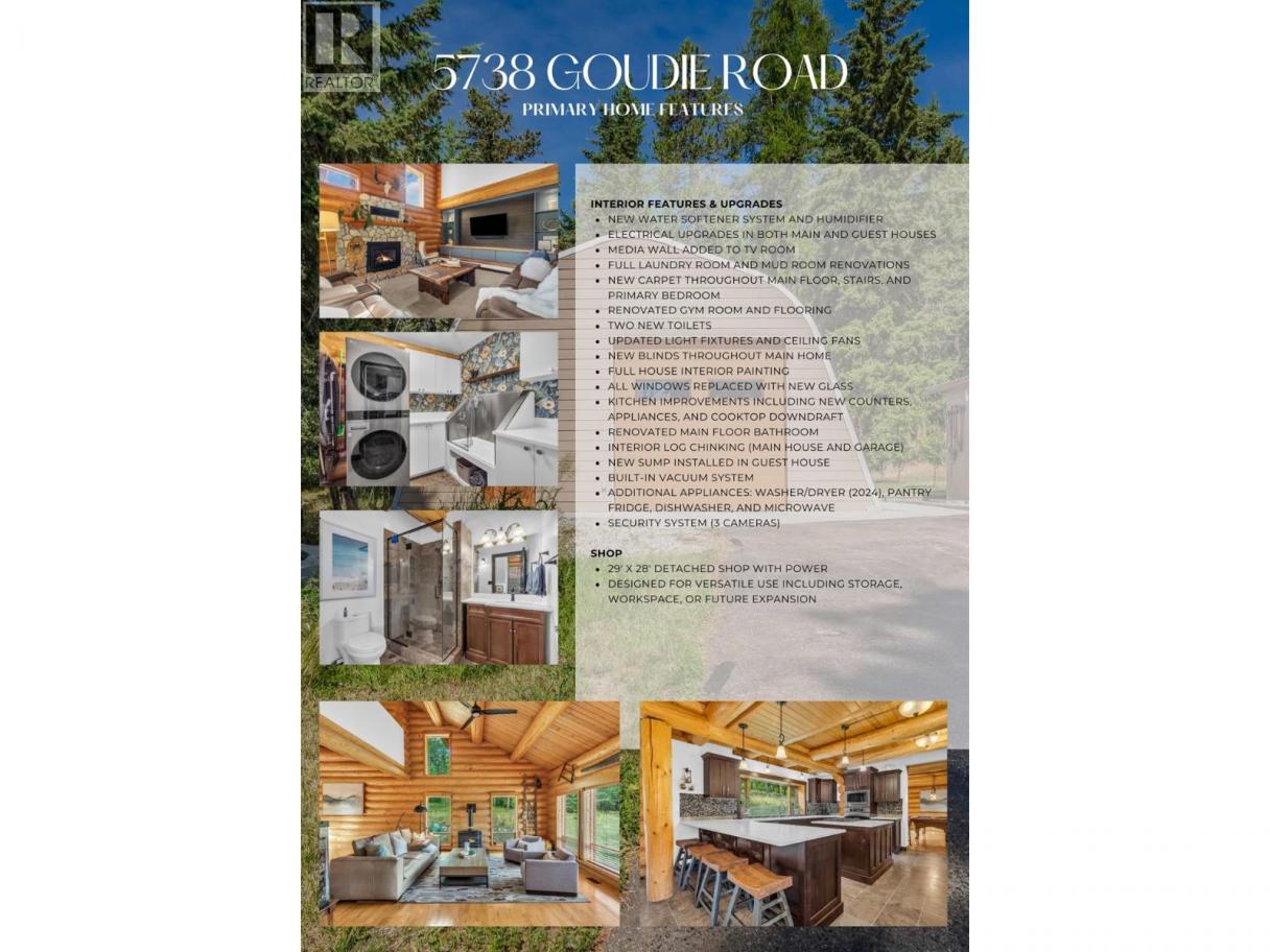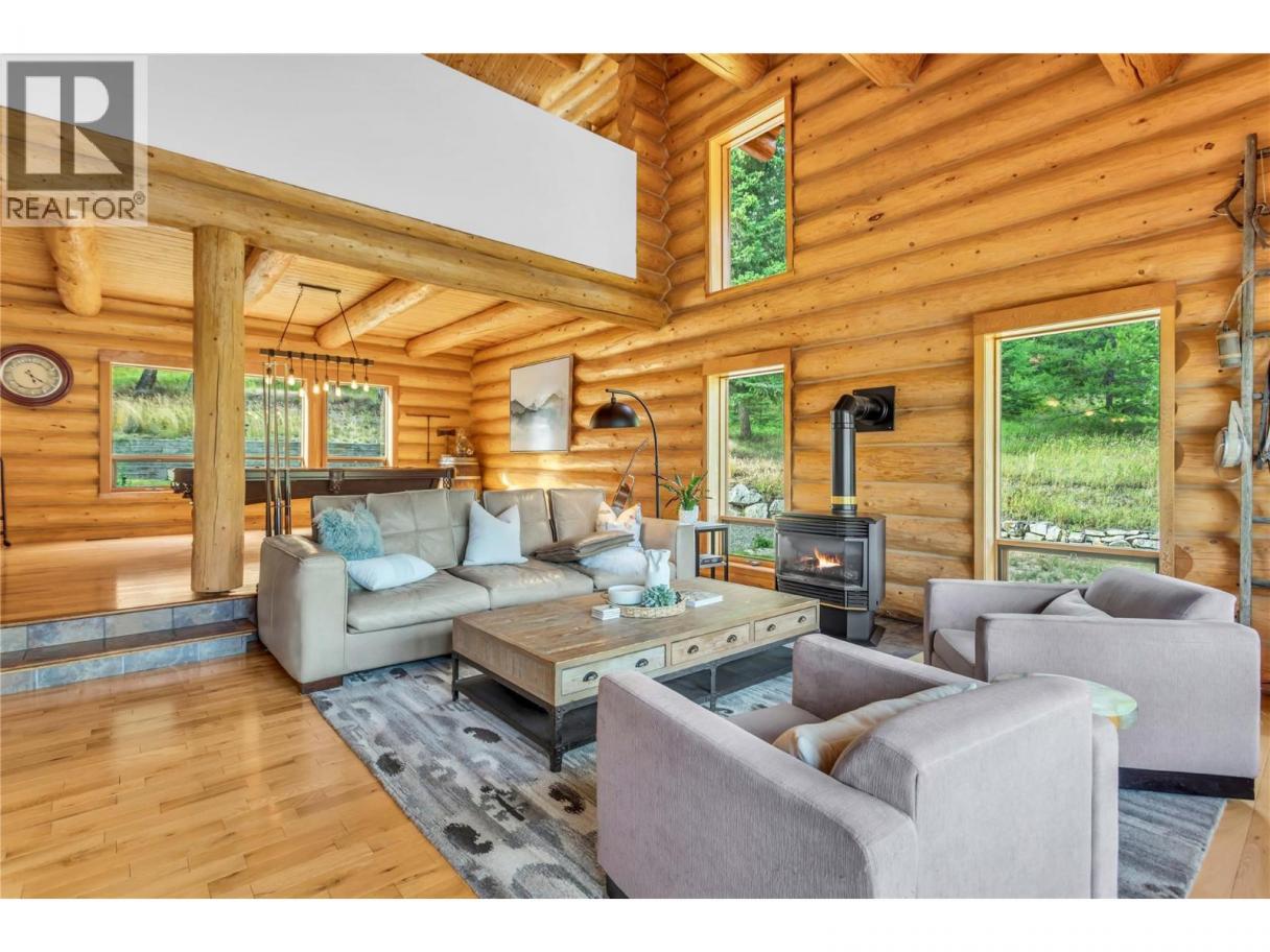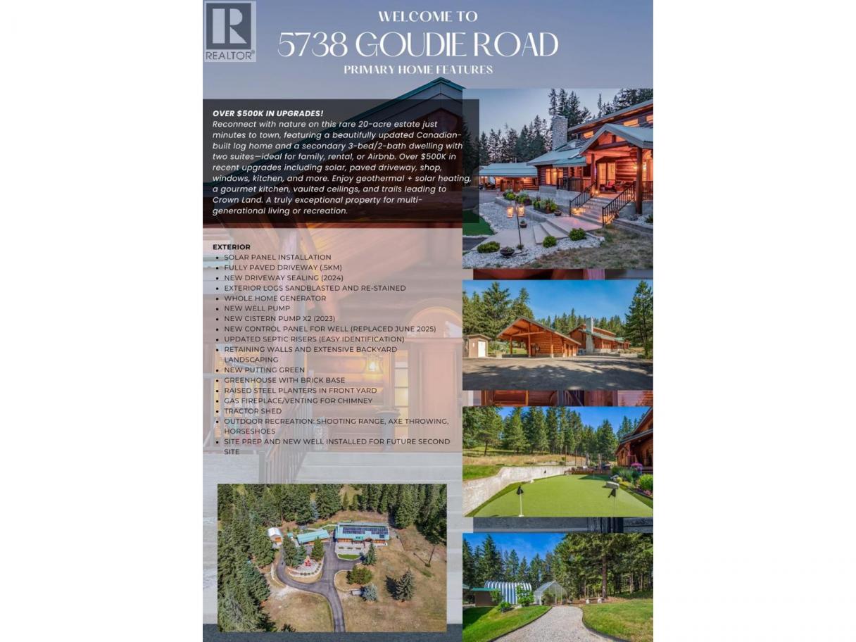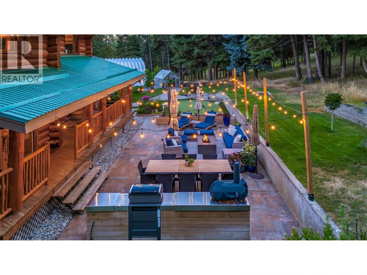 Rarely does a PRIVATE ESTATE of this scale, versatility, and craftsmanship come to market. Set on 20 BREATHTAKING ACRES, this CUSTOM CANADIAN BUILT LOG HOME blends timeless character with refined modern comfort. The 5 bedroom main residence is warm and inviting, featuring soaring vaulted ceilings, two cozy fireplaces, a gourmet kitchen w/ quartzite counters, gas range, walk-in pantry, and multiple gathering spaces designed for both everyday living and memorable entertaining. A SEPARATE 3 bed/2 bath LEGAL SECONDARY DWELLING offers exceptional flexibility w/ two self- contained suites—ideal for extended family, guests, or rental/Airbnb potential. With the OPTION TO SUBDIVIDE 10 ACRES and a NEW WELL already in place, future possibilities are equally compelling. More than 500k in thoughtful upgrades enhance both function and lifestyle - a paved driveway extension, solar panels, geothermal heating, updated electrical, new windows, appliances, and a detached 24x28 heated garage/workshop with 220V power. Outdoors, discover a true backyard sanctuary with manicured landscaping, greenhouse, tranquil water feature, hot tub, putting green, and acres of rolling lawns, forested trails, and open space perfect for horses or outdoor adventure. Private yet conveniently located mins to town, Blk Mtn Golf Course, elementary school, parks, hiking, Orchard Park, and Big White. A property that must be experienced to be fully appreciated. Flythrough: https://youtu.be/EfX4jZq-6rg (id:6769)
