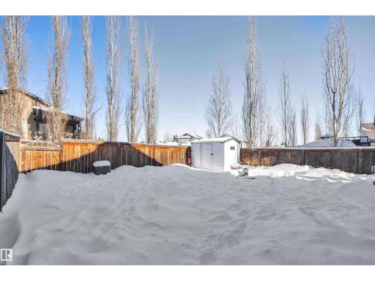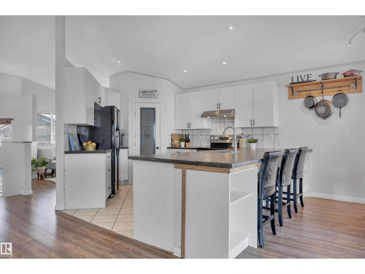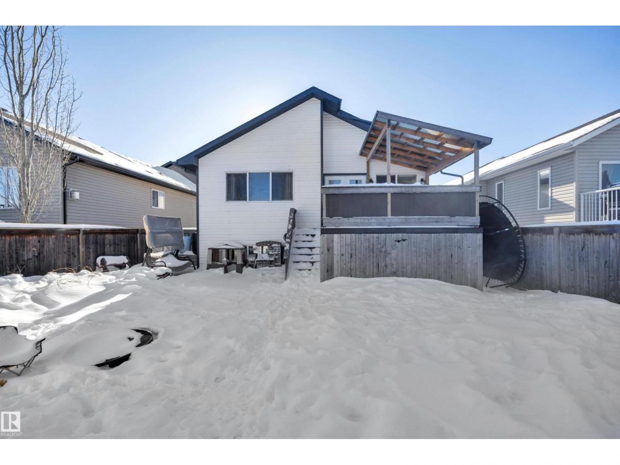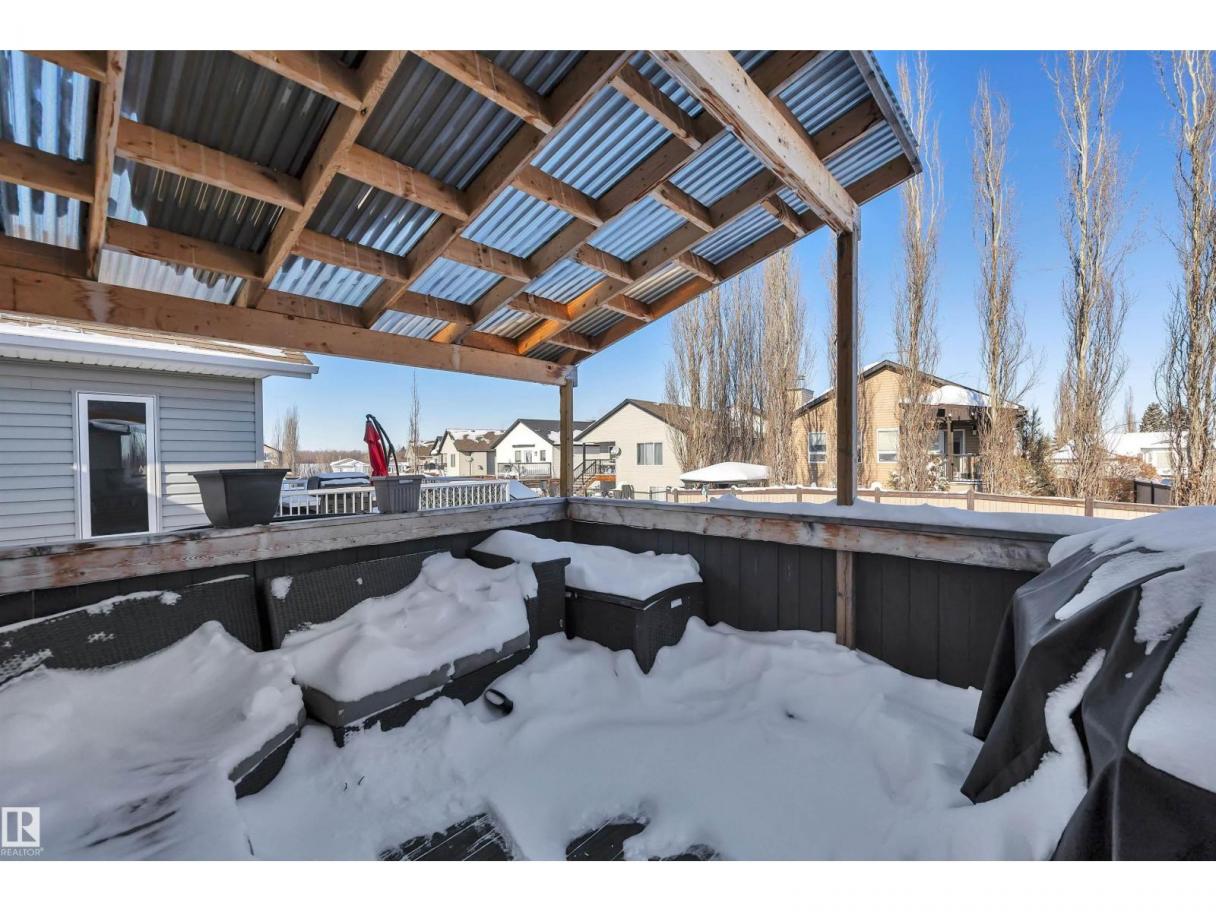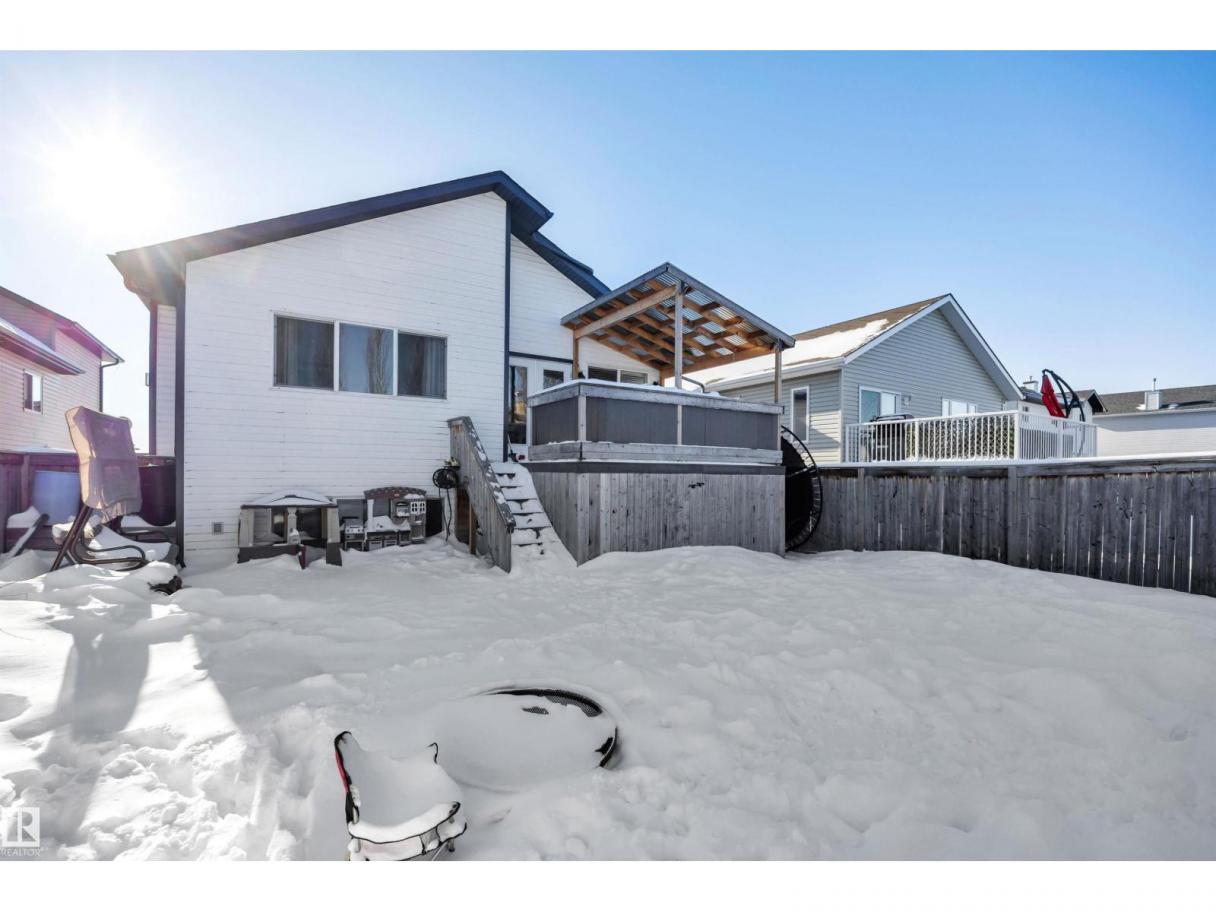Featuring an open-concept layout, this bright & spacious bi-level is situated in Gibbons just N of Edm. Highlights include attached dbl garage, vaulted ceilings, fully finished basement w/lg windows & ample storage throughout. Perfect for a large or growing family, this home offers 2 bedrooms on upper level & 3 bedrooms downstairs. The generous primary suite—located above the garage—includes a 4pc ensuite w/soaker tub & walk-in closet. The kitchen is equipped with a corner pantry & plenty of counter space. From the dining area, double doors open onto a covered deck that overlooks a lg fenced backyard, complete with shed & addn'l storage under the deck. The living room features a gas fireplace & a 4pc bathroom serves the main level. The bright lower level includes 3 spacious bedrooms, lg family room, 4pc bathroom & addn'l storage. A den overlooks the front yard. A sizeable laundry room is conveniently located just off the foyer. This home boasts comfort, space & functionality for any family! (id:6769)