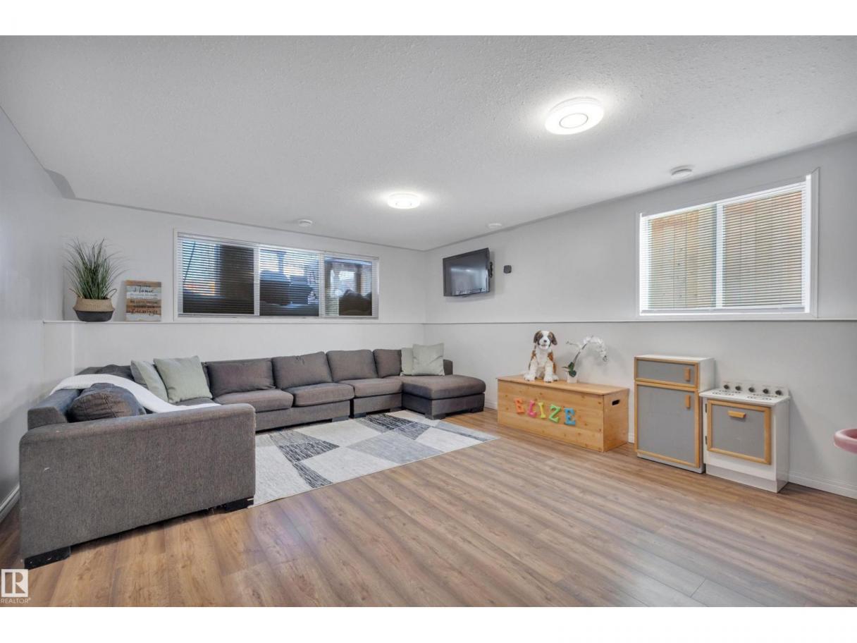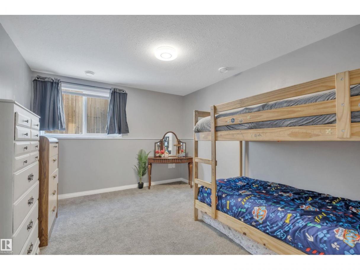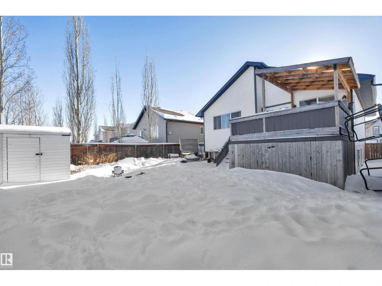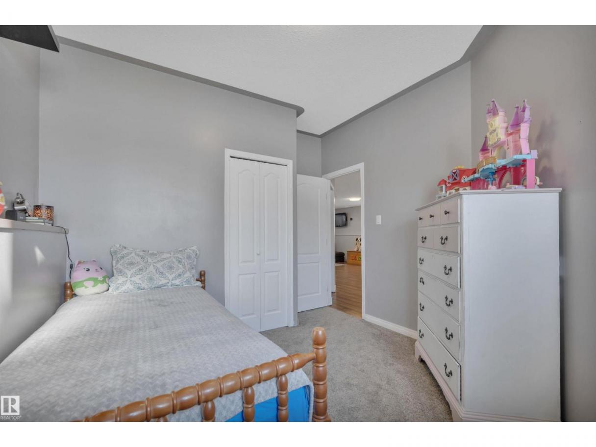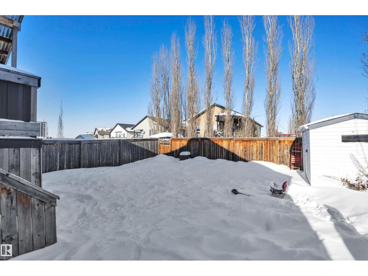 Featuring an open-concept layout, this bright & spacious bi-level is situated in Gibbons just N of Edm. Highlights include attached dbl garage, vaulted ceilings, fully finished basement w/lg windows & ample storage throughout. Perfect for a large or growing family, this home offers 2 bedrooms on upper level & 3 bedrooms downstairs. The generous primary suite—located above the garage—includes a 4pc ensuite w/soaker tub & walk-in closet. The kitchen is equipped with a corner pantry & plenty of counter space. From the dining area, double doors open onto a covered deck that overlooks a lg fenced backyard, complete with shed & addn'l storage under the deck. The living room features a gas fireplace & a 4pc bathroom serves the main level. The bright lower level includes 3 spacious bedrooms, lg family room, 4pc bathroom & addn'l storage. A den overlooks the front yard. A sizeable laundry room is conveniently located just off the foyer. This home boasts comfort, space & functionality for any family! (id:6769)