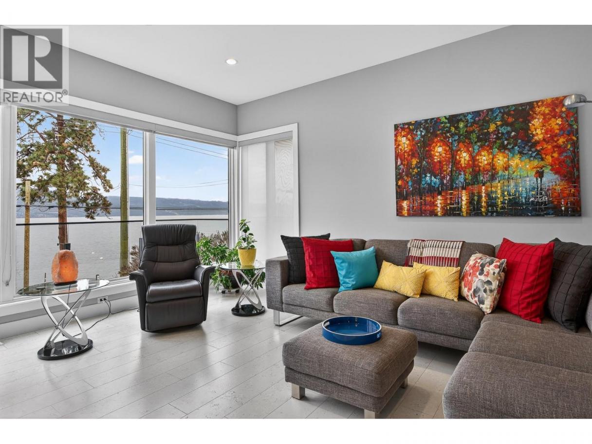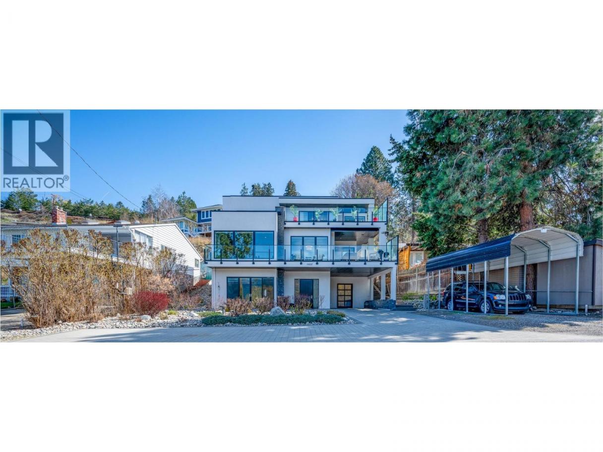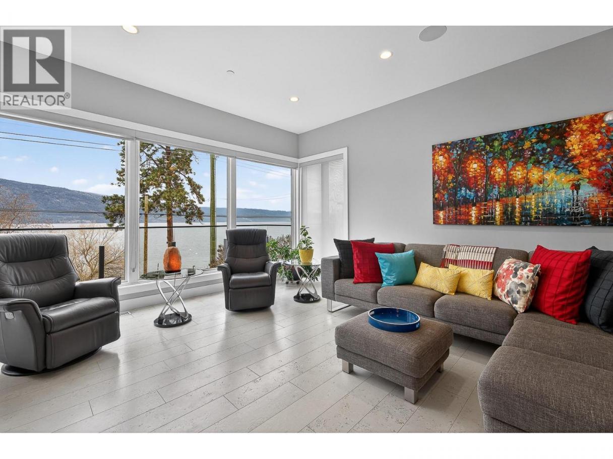 To truly embrace this home, you must step inside. From the moment you cross the threshold, the lake reveals itself - expansive, calming, ever-changing. Designed by a respected architect and built with exceptional attention to detail, this custom residence was intentionally positioned to capture Okanagan Lake from nearly every principal room. Clean modern lines, walls of glass, and expansive terraces create a seamless connection between indoors and out. Each level offers its own perspective of water and sky, whether you’re enjoying morning coffee on the covered patio or watching the sun set across the mountains from the upper terrace. The kitchen is both refined and functional, anchored by rich granite surfaces, premium appliances, and effortless flow to outdoor dining. A dramatic open staircase serves as an architectural statement while maintaining the home’s sense of openness and light. The primary suite is a private retreat, with direct terrace access, a spa-inspired ensuite, soaker tub, dual vanities, and a generous walk-in closet complete with secondary laundry. The lower level offers flexibility for guests, family, or entertaining, with walk-out access and easy connection to the beach just steps away. Paddleboard at sunrise, tie your boat to the buoy, stroll the shoreline path, or visit nearby wineries and cafés. This is lake living...... elevated, intentional, and designed to be experienced. Come view it. (id:6769)